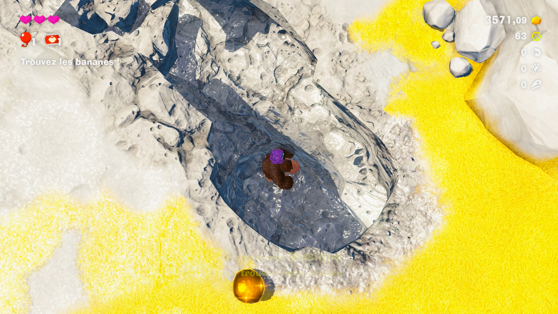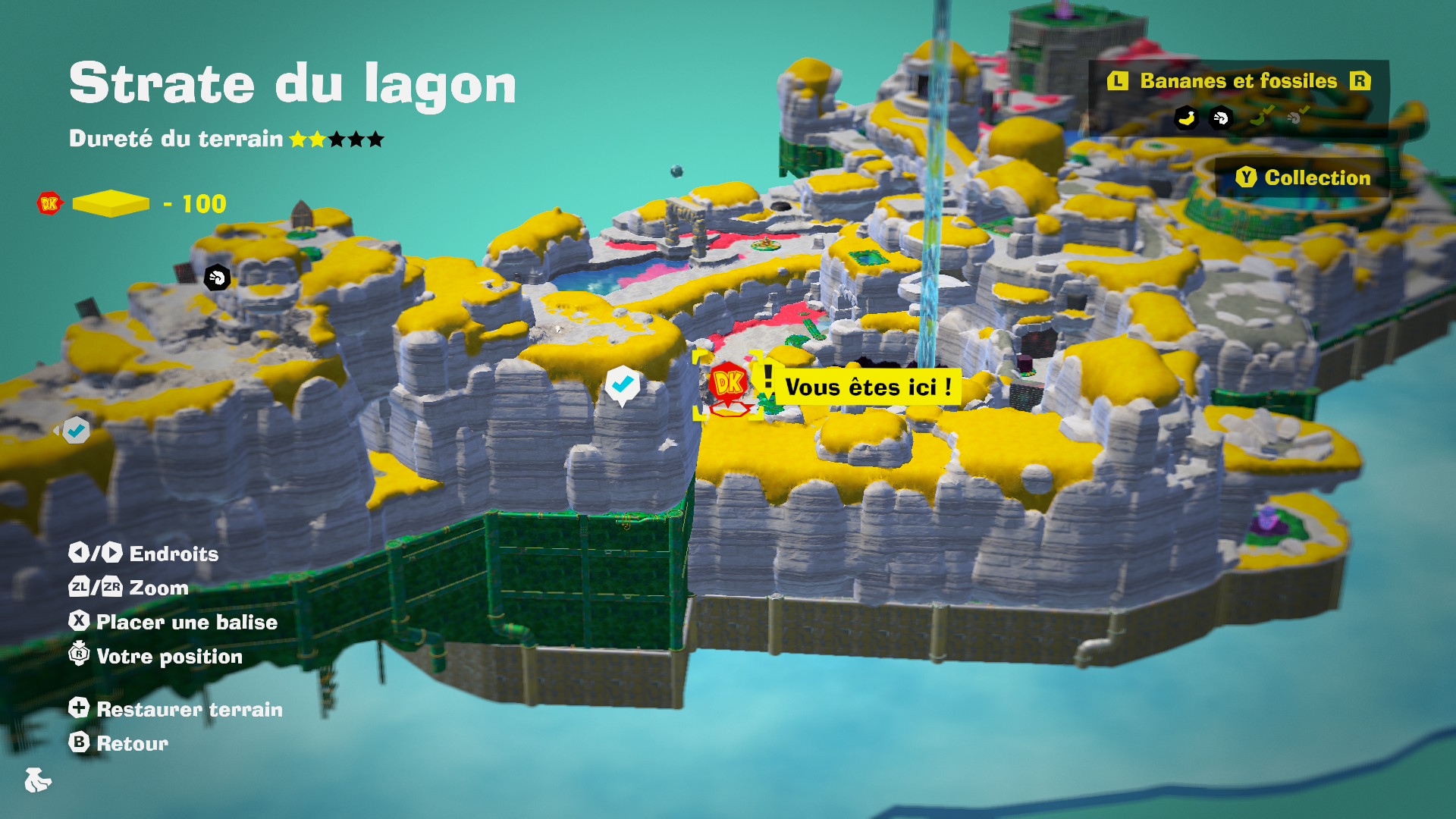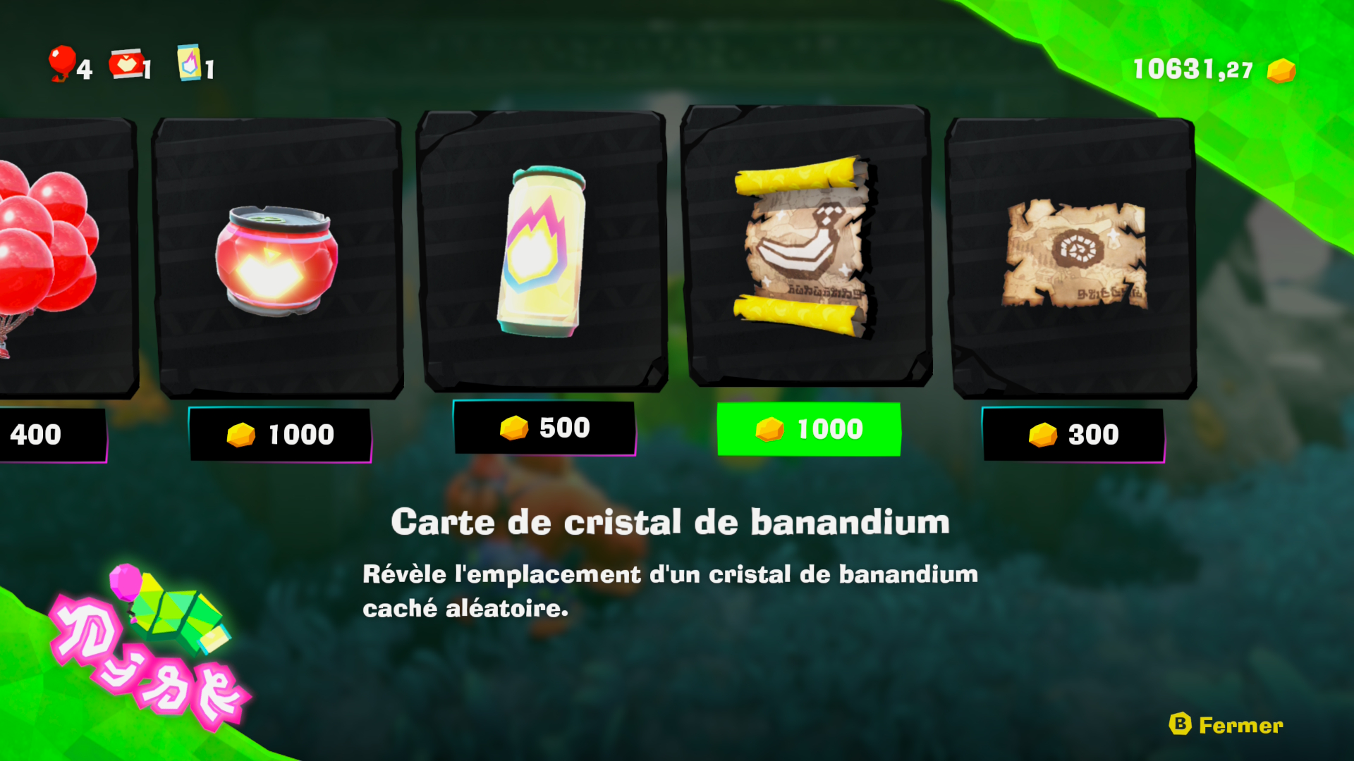Entre les différents collectibles et les niveaux cachés, chaque strate de la Terre est remplie d’activités, peut-être même un peu trop. Il y a toujours quelque chose à faire, le jeu vous donnant un nombre de carottes ahurissant pour vous amuser / vous occuper, mais il y a des moments où l’on finit par ne plus savoir où donner de la tête. Pour trouver les collectibles, on peut soit fouiller et casser chaque niveau, ou sinon des boutiques permettent d’acheter des cartes vous indiquant l’emplacement d’une banane ou d’un fossile, que vous pourrez retrouver afficher sur votre carte du niveau, disponible en appuyant sur “-”.