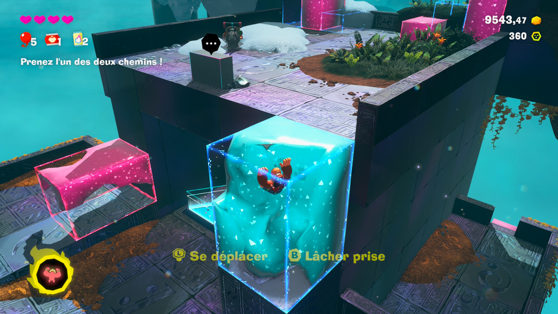 Sur le papier, Donkey Kong Bananza a tout pour éviter la répétitivité : chaque monde propose un biome et des particularités uniques, et de nouvelles idées de gameplay (comme une mécanique inspirée de Portal, où en brisant une plateforme bleue, cela créé une plateforme rouge à un autre endroit) viennent régulièrement briser cette routine et nous rappeler que le jeu ne semble jamais être en manque d’idées.