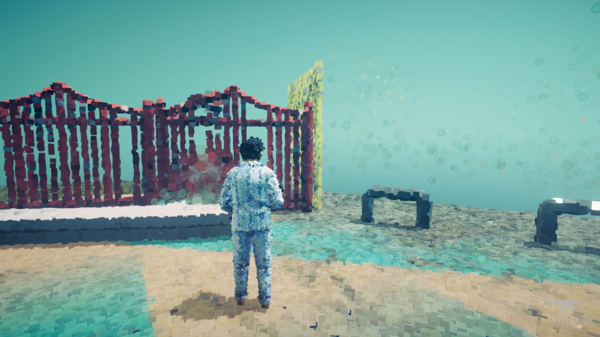 Cette partie du gameplay peut surprendre au début. Dreams of Another est plus proche de la simulation de marche non-violente que du jeu de guerre, pourtant notre personnage utilise des armes à feu qui dénotent avec l’atmosphère paisible et douce autour de nous, mais on comprend que cela sert le propos du jeu. Même si on a du mal à comprendre où le jeu veut nous amener, on prend plaisir à matérialiser le monde onirique style impressionniste autour de nous à coups de mitrailleuse. La satisfaction qu’on ressent à « nettoyer » une zone de toute l’abstraction pour découvrir les vrais objets cachés en dessous parlera à ceux qui ont eu Powerwash Simulator entre les mains, et c’était malheureusement là la partie la plus agréable du jeu.