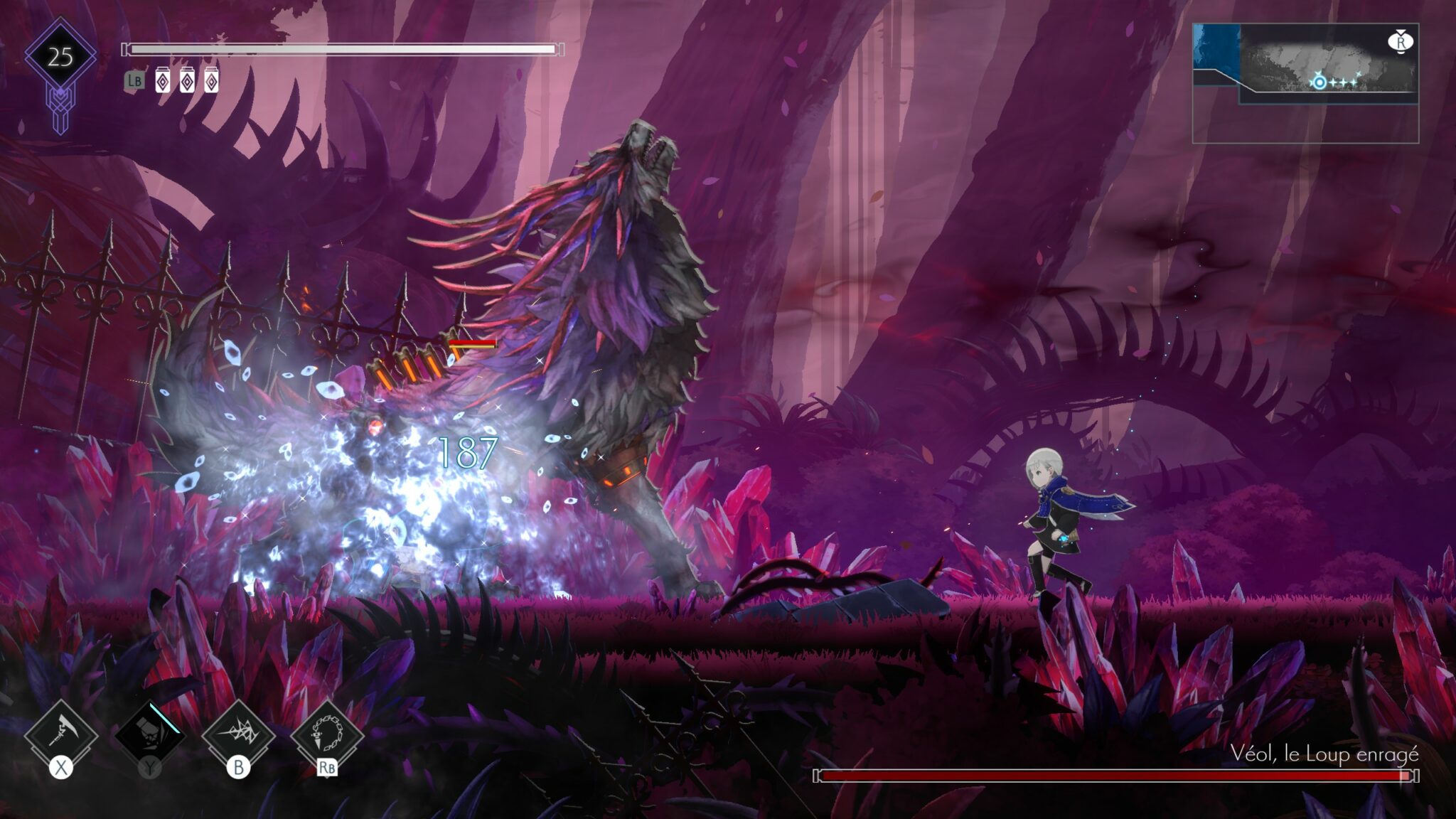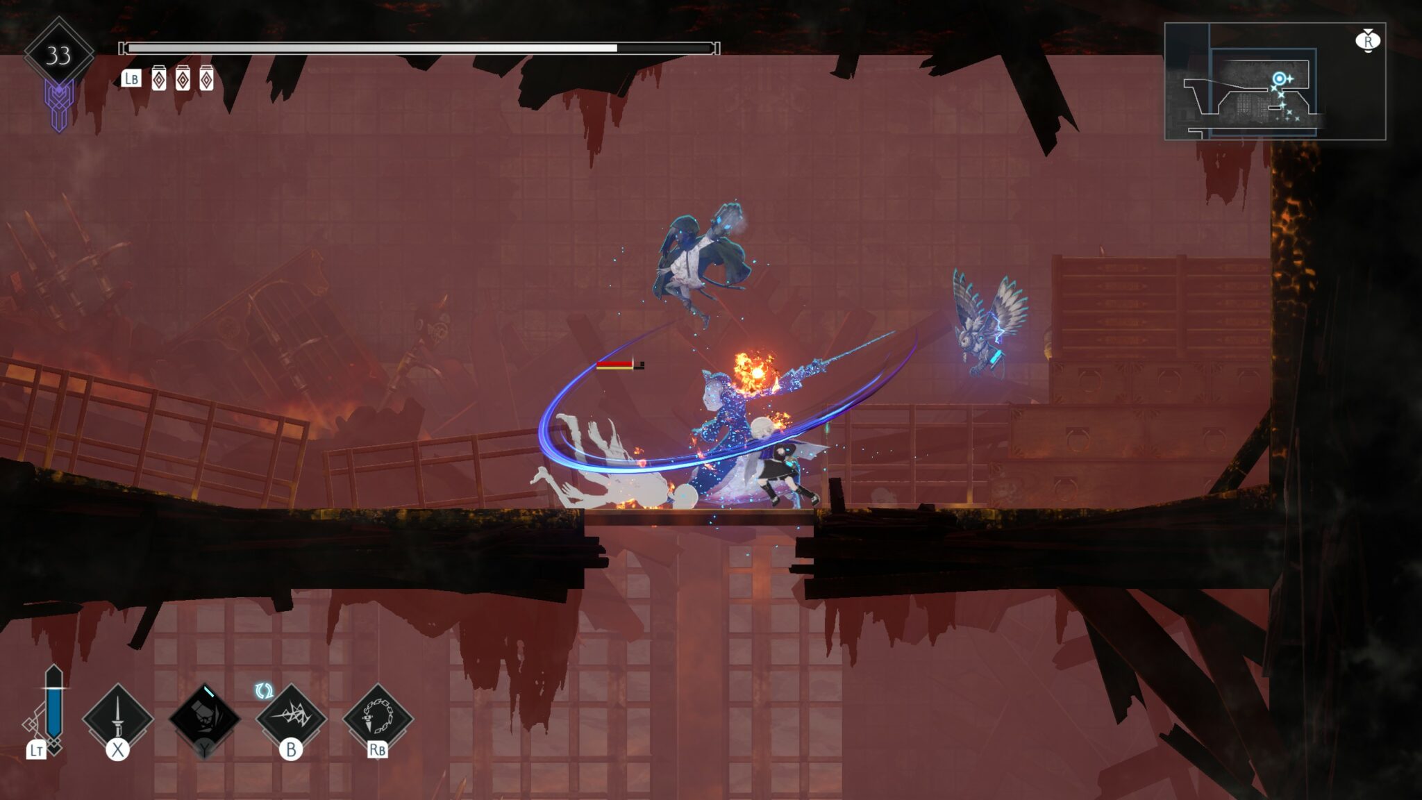 Là où Ender Magnolia: Bloom in the Mist brille vraiment pour un metroidvania, en plus de sa direction artistique, c’est dans son ergonomie. Chaque petit détail a été pensé pour fluidifier l’expérience. Une option est disponible pour rejoindre le dernier feu de camp visité, la légende de la carte est ultra lisible et claire, et surtout, merci l’option pour afficher la map en surimpression à la manière d’un hack’n’slash. Pouvoir avancer sans devoir mettre en pause toutes les deux minutes pour checker sa route, c’est un vrai confort.