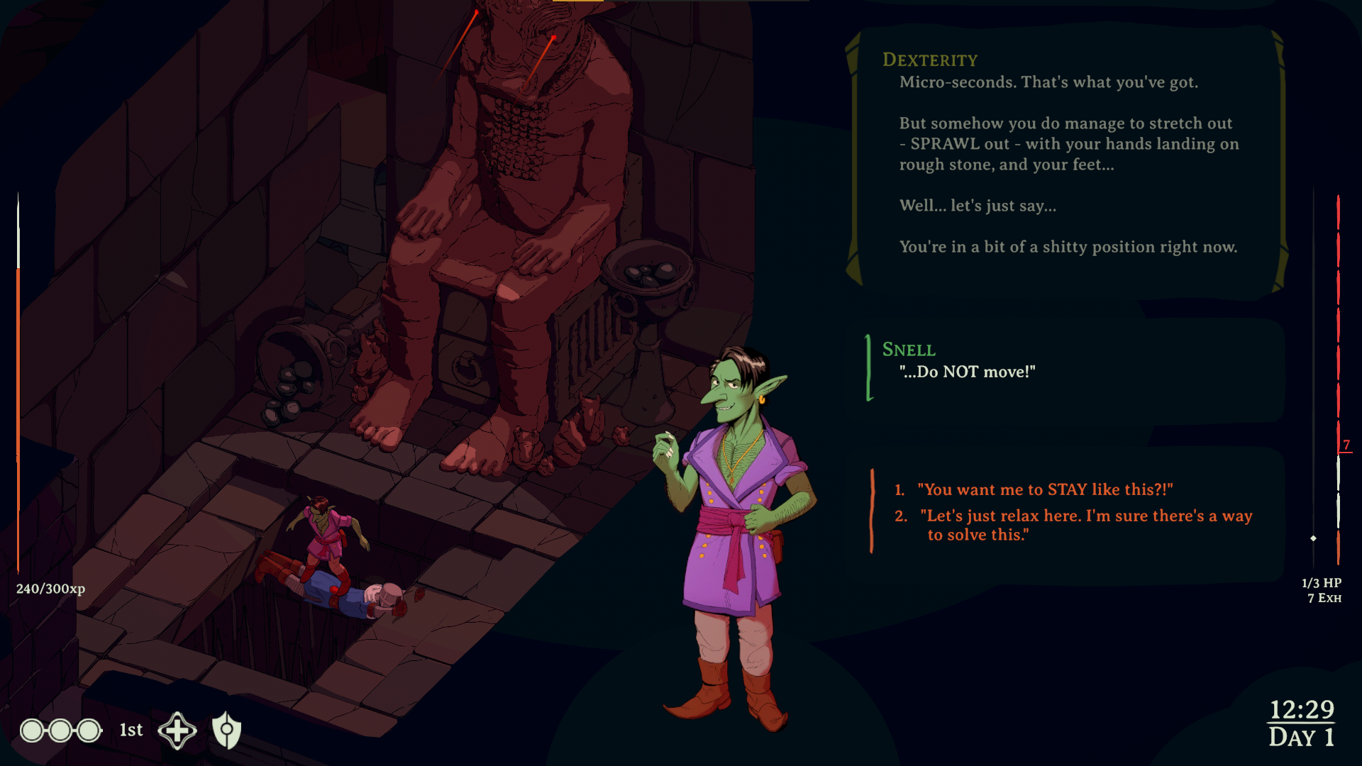 Mais n’allons pas réduire son jeu au simple statut de « Disco Elysium dans le monde de Donjons & Dragons ». D’une part parce que la genèse du projet remonte à avant la sortie du jeu de ZA/UM et d’autre part, bien que le jeu ait été grandement influencé dans son game design, il n’en reprend ni les règles, ni l’univers.