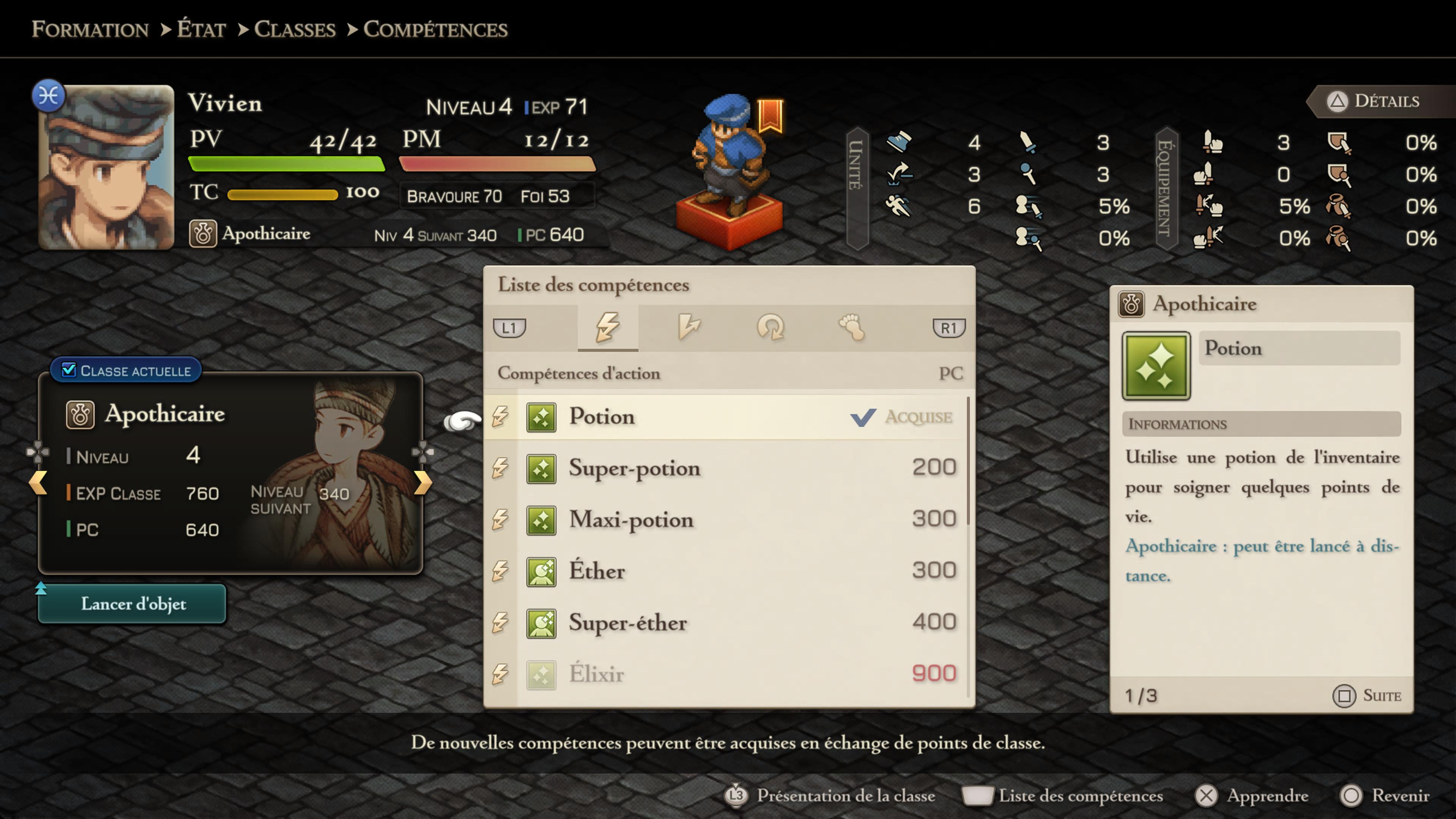 Final Fantasy Tactics: The Ivalice Chronicles est une expérience complexe à prendre en main. Le titre propose une richesse dans ses mécaniques impressionnante et, fatalement, les assimiler demande un certain temps d’adaptation. Quand on pense au jeu, on se souvient généralement du système de job, lequel permet d’assigner une classe librement à ses aventuriers afin d’en débloquer les compétences idoines. Ainsi, un mage blanc apprendra des sors de soin, un moine aura les techniques du bourrin de service ou l’apothicaire sera spécialisé dans l’utilisation d’objets (et oui, utiliser un objet est une compétence à débloquer).