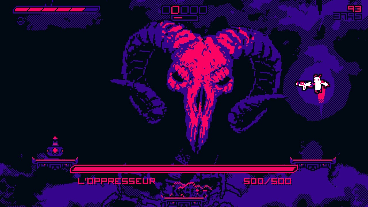 On commence souvent la critique d’un jeu par son histoire, pour remettre les choses en contexte. Mais bon, l’histoire ici est complètement accessoire. Un démon rebelle et armé va décimer tout ce qui bouge aux enfers. Voilà, à vous. Après tout, il y avait une histoire dans Tetris ? L’ambiance démons et squelettes ici colle bien à l’esthétique synthwave du jeu, avec ses têtes de morts en pixels au premier plan, ou les boss, des démons démesurés qui ne jureraient pas sur les affiches de concert de Perturbator…