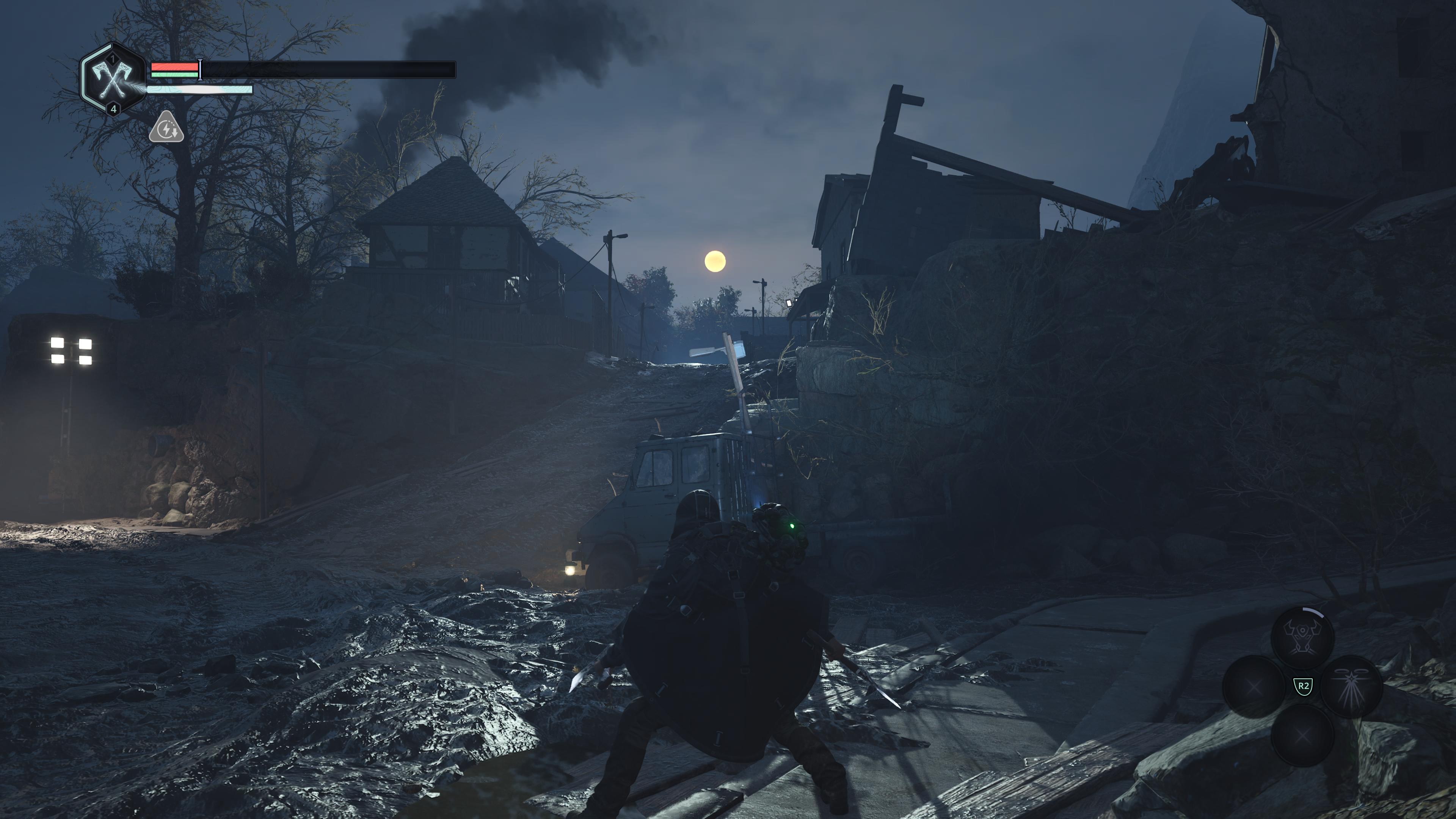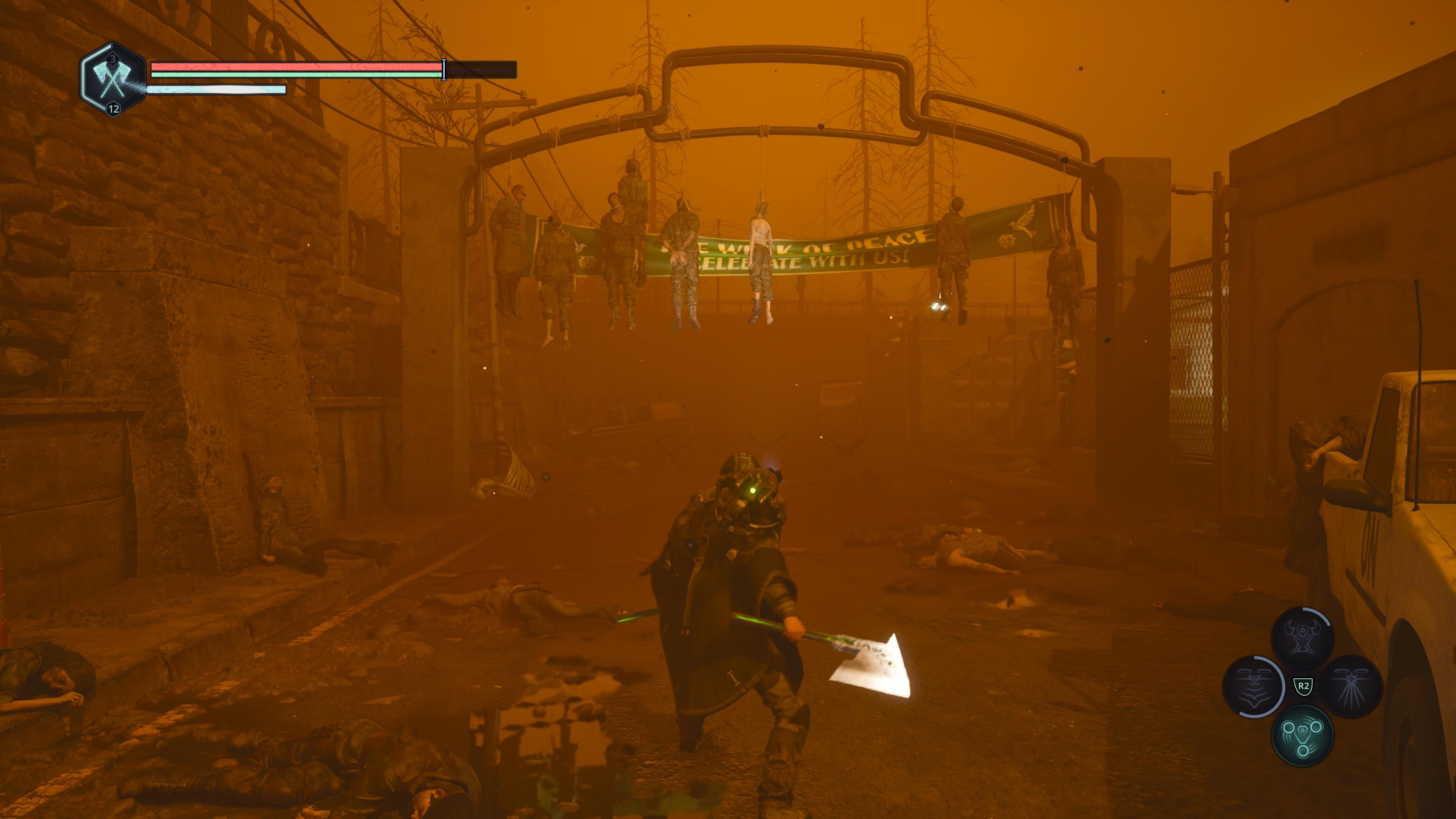 Ne vous attendez pas à une voix off expliquant toutes les informations à savoir. Il faudra se montrer curieux et prendre le temps de lire les documents récupérés au fil de vos explorations pour comprendre pleinement les tenants et les aboutissants de cette guerre meurtrière. Là où Hell is Us fait mouche, c’est dans son soin de placer systématiquement le civil au centre des préoccupations. Le titre du jeu est loin d’être anodin, la mort et la barbarie seront majoritairement vos compagnons de route. Se promener en ces territoires désolés nous dicte une chose : il n’y a rien de plus cruel que l’Homme.