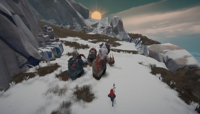 Avec Herdling, le studio suisse Okomotive passe du gameplay 2D de Far à un gameplay en 3D, ajoutant alors une pincée d’exploration au level design. Si la géographie des niveaux offre une lecture relativement claire de la direction à emprunter avec son troupeau, à certains moments du voyage, on aura un peu tourné à la recherche de notre chemin, ce qui, là encore, vient casser la potentielle monotonie que pourrait entrainer un « simple » walking simulator. Il faut aussi noter le hud très malin, déplacé sur le pelage des calicornes pour une plus grande immersion : c’est la coloration de celui-ci qui indiquera l’état de santé du compagnon.