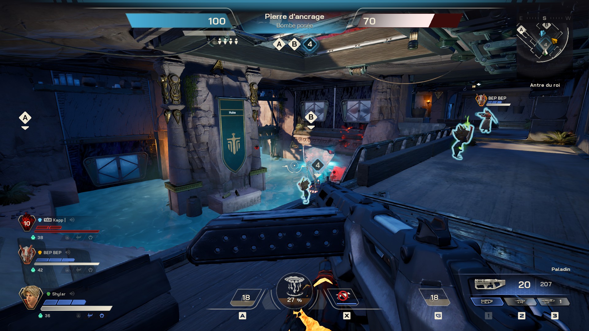 C’est ici, dans ces assauts inspirés de Rust, que Highguard trouve enfin son rythme. Une fois le dôme de la base brisé par le bélier, les attaquants peuvent détruire les nœuds secondaires pour infliger des dégâts ou foncer sur la Pierre d’Ancrage pour une victoire immédiate.