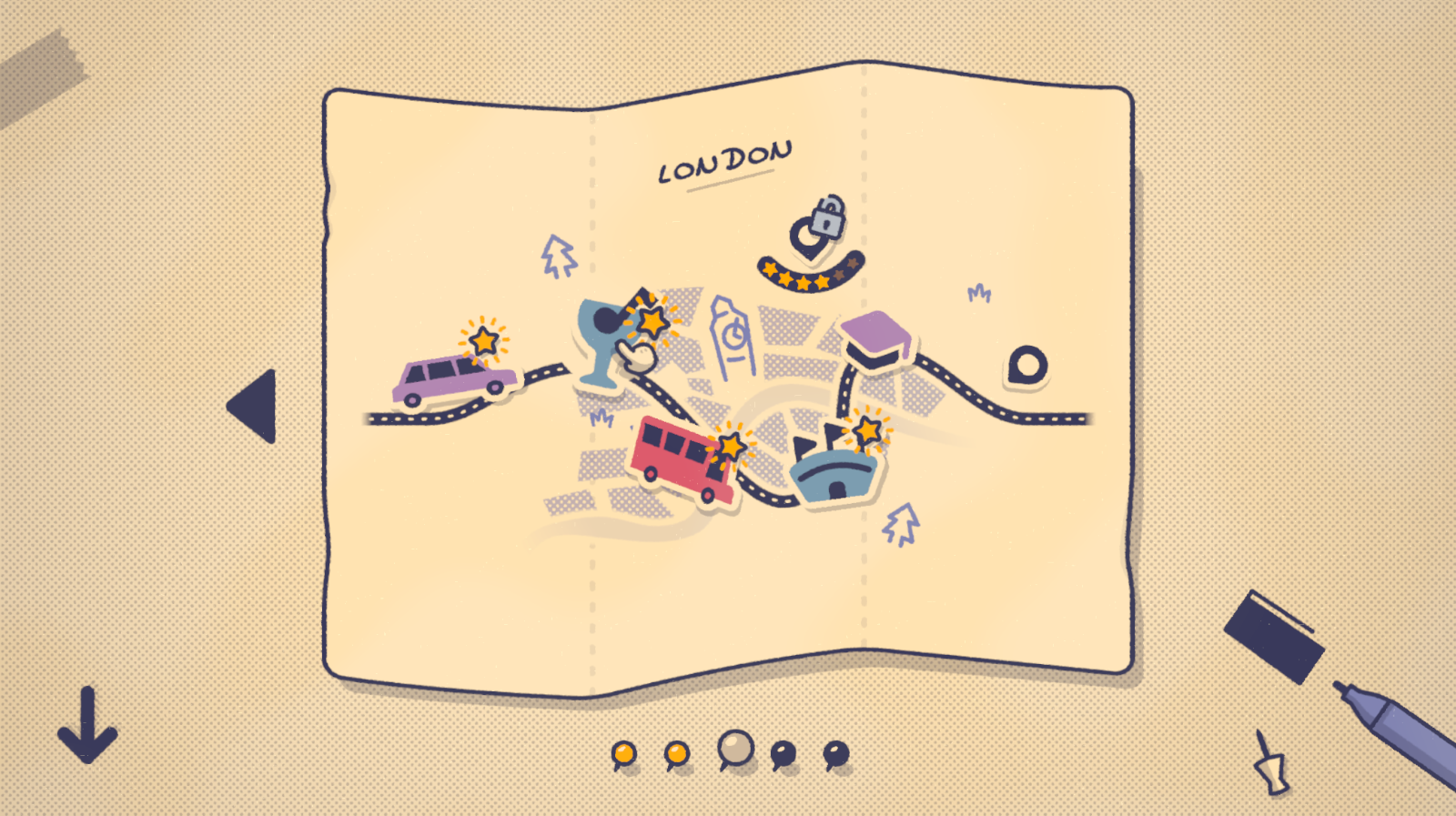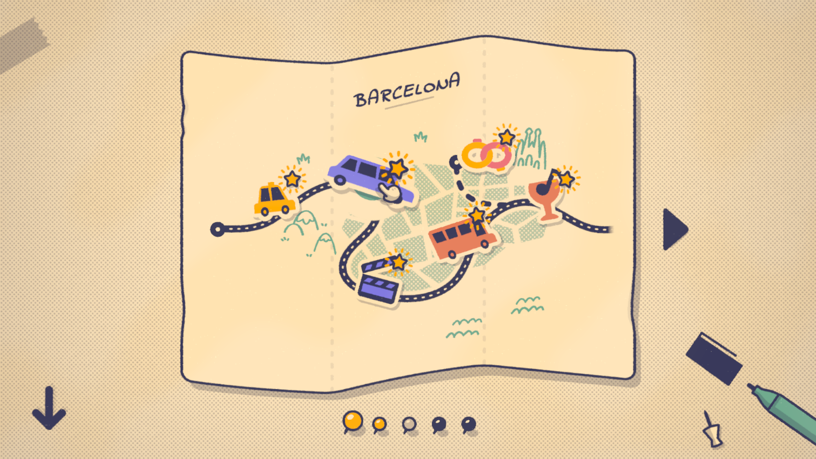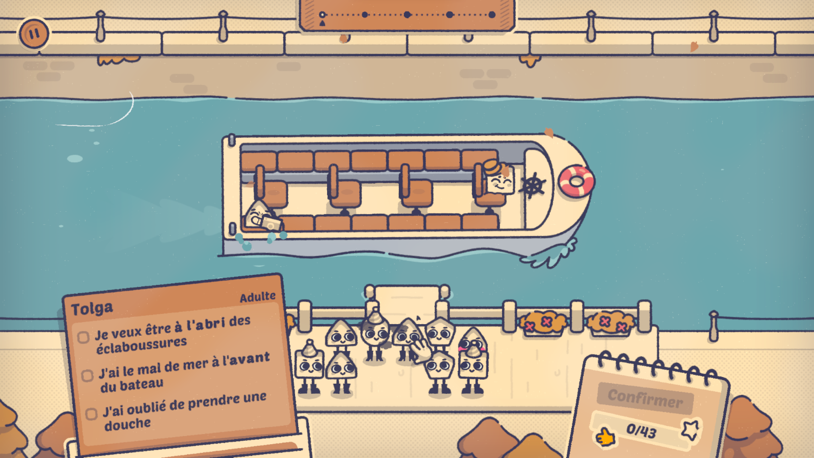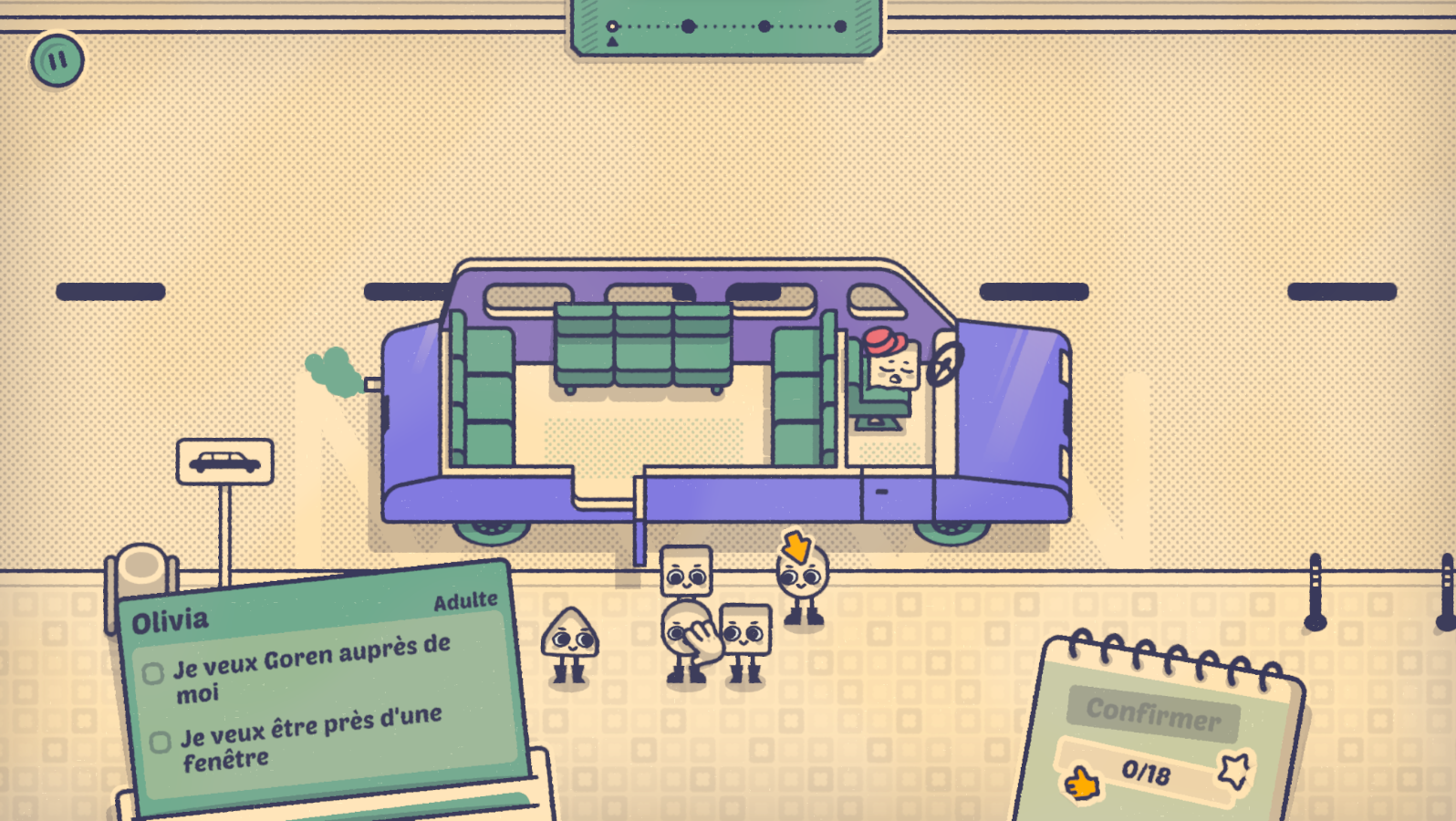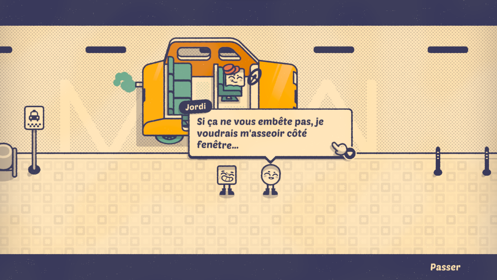 L’aventure débute à Barcelone avec un petit tutoriel. Ici, il sera simplement question de placer quelques personnes dans un taxi en tenant compte de leurs envies. Plutôt fenêtre ou centre? Plutôt solitaire ou appréciant la compagnie ? Rien de bien sorcier, mais l’occasion de découvrir les mécaniques simples du titre, à base de cliquer et glisser, et surtout d’appréhender la direction artistique prise par les développeurs. Ici, pas d’êtres humains, mais des figures géométriques personnifiées en mode cartoon du plus bel effet. Bienvenue dans un monde de carrés, de losanges, de cercles et de triangles dotés de prénoms, d’émotions et de véritables mimiques.