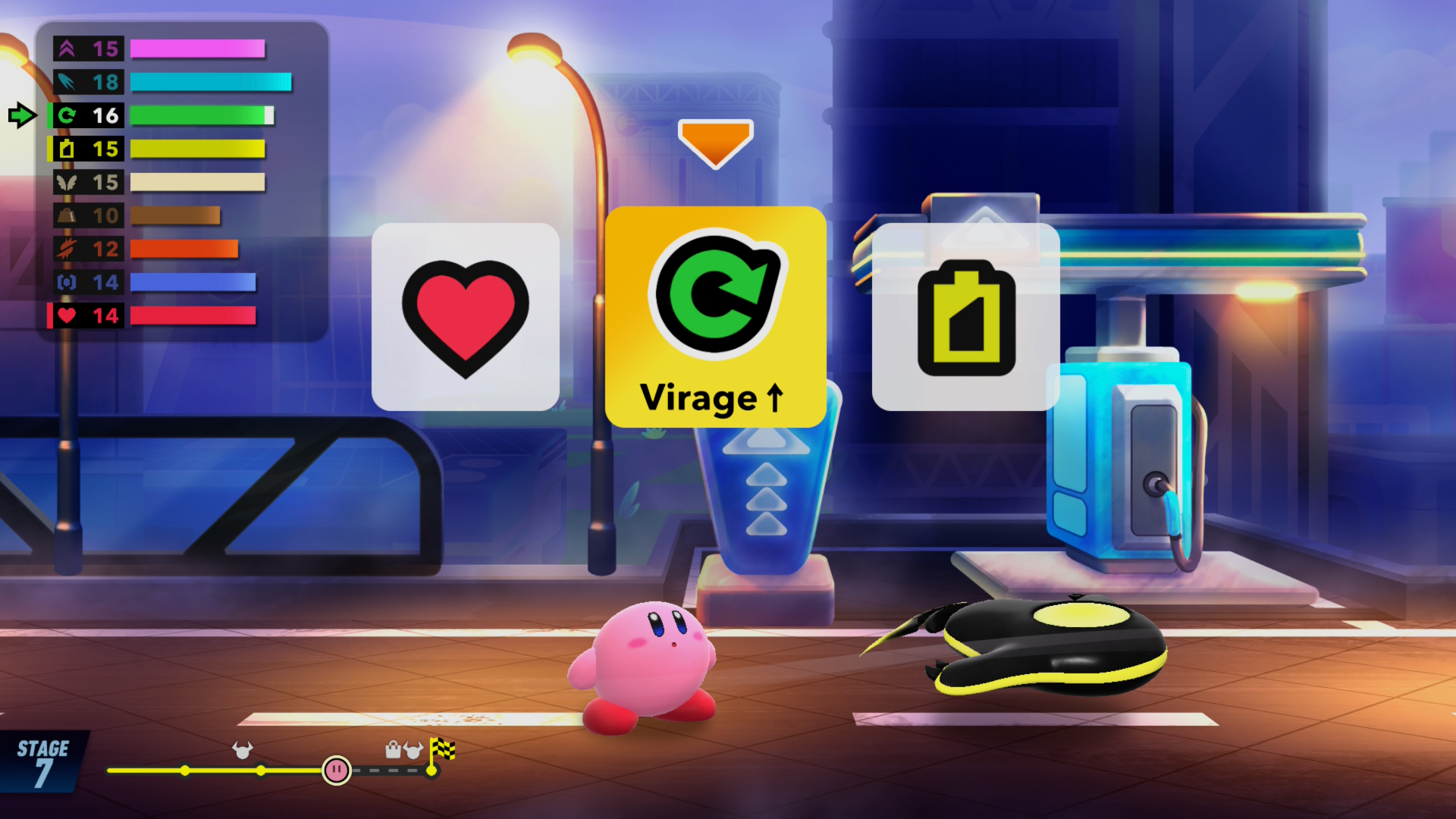 À la fin du compte à rebours, les joueurs peuvent voter parmi plusieurs modes de jeu proposés aléatoirement, appelés les « stades ». Si on comprend le but des améliorations, on aura tendance à choisir un terrain à notre avantage, comme par exemple le mode de jeu aérien si votre vol est d’un bon niveau. Le mode City Trial représente la réelle force de ce Kirby Air Riders : le jeu parvient à se diversifier grâce aux parcours proposés. Il propose une multitude de choses à débloquer en relevant de multiples défis pour le voir sous tous ses angles, une bonne idée pour permettre au joueur de découvrir le jeu au fil de l’eau tout en obtenant une récompense utile à la fin comme par exemple une partie des circuits du jeu.