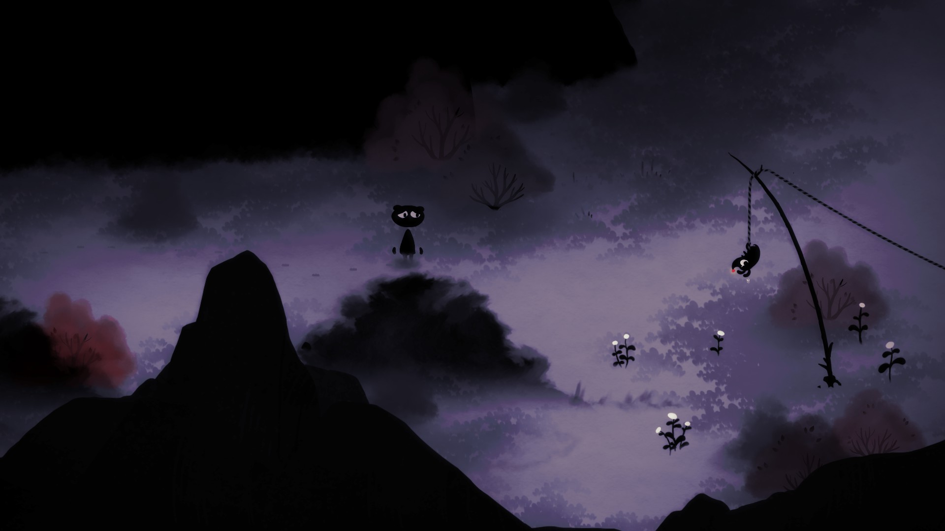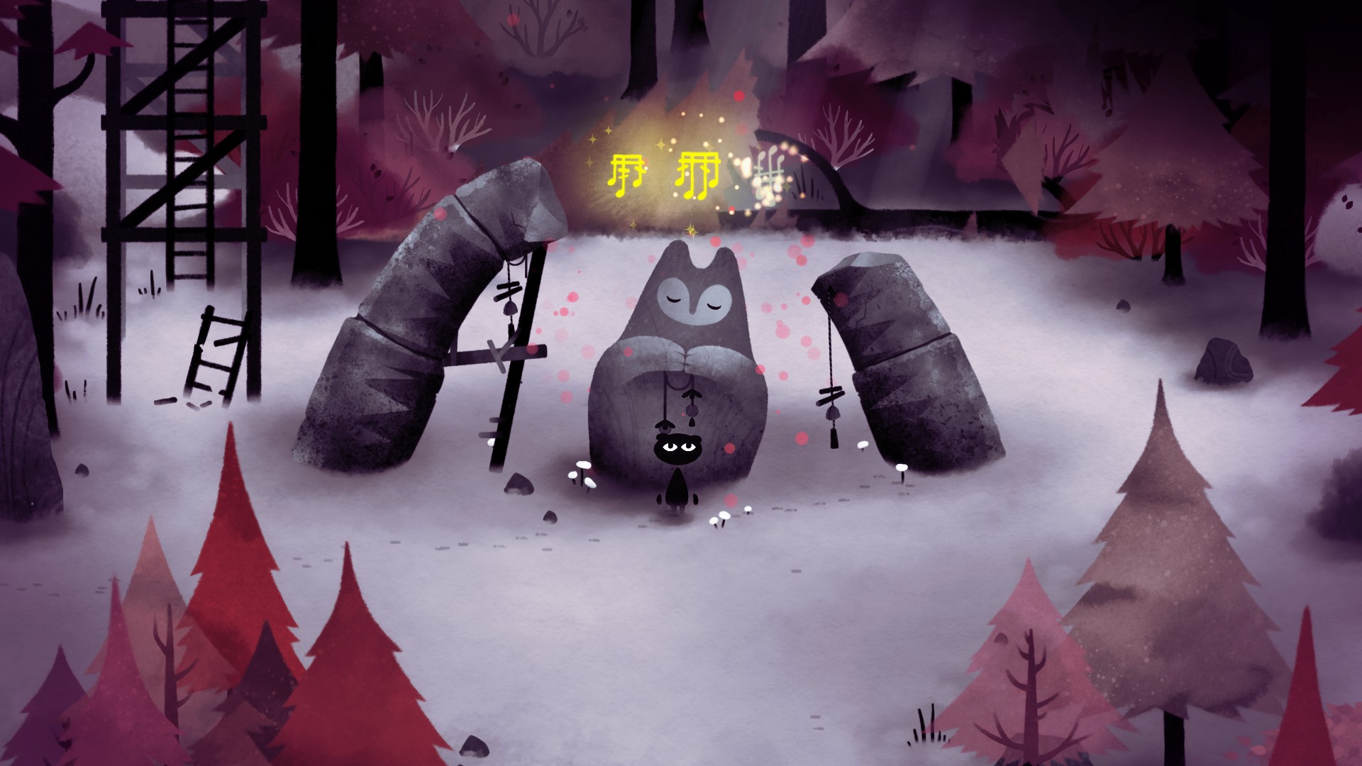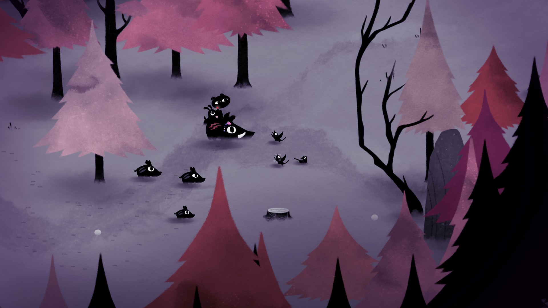 Conçu comme un conte, le jeu arbore à travers différents tableaux des allures de livre pour enfants : des créatures forestières aux mimiques adorables, des chasseurs dont seules les silhouettes noires se détachent sur la blancheur immaculée de la neige… Ce style graphique, doux et mélancolique, rappelle forcément Mumrik : La Mélodie de la Vallée des Moomins, sorti l’an dernier. Même si l’ambiance diffère, la technique reste proche.