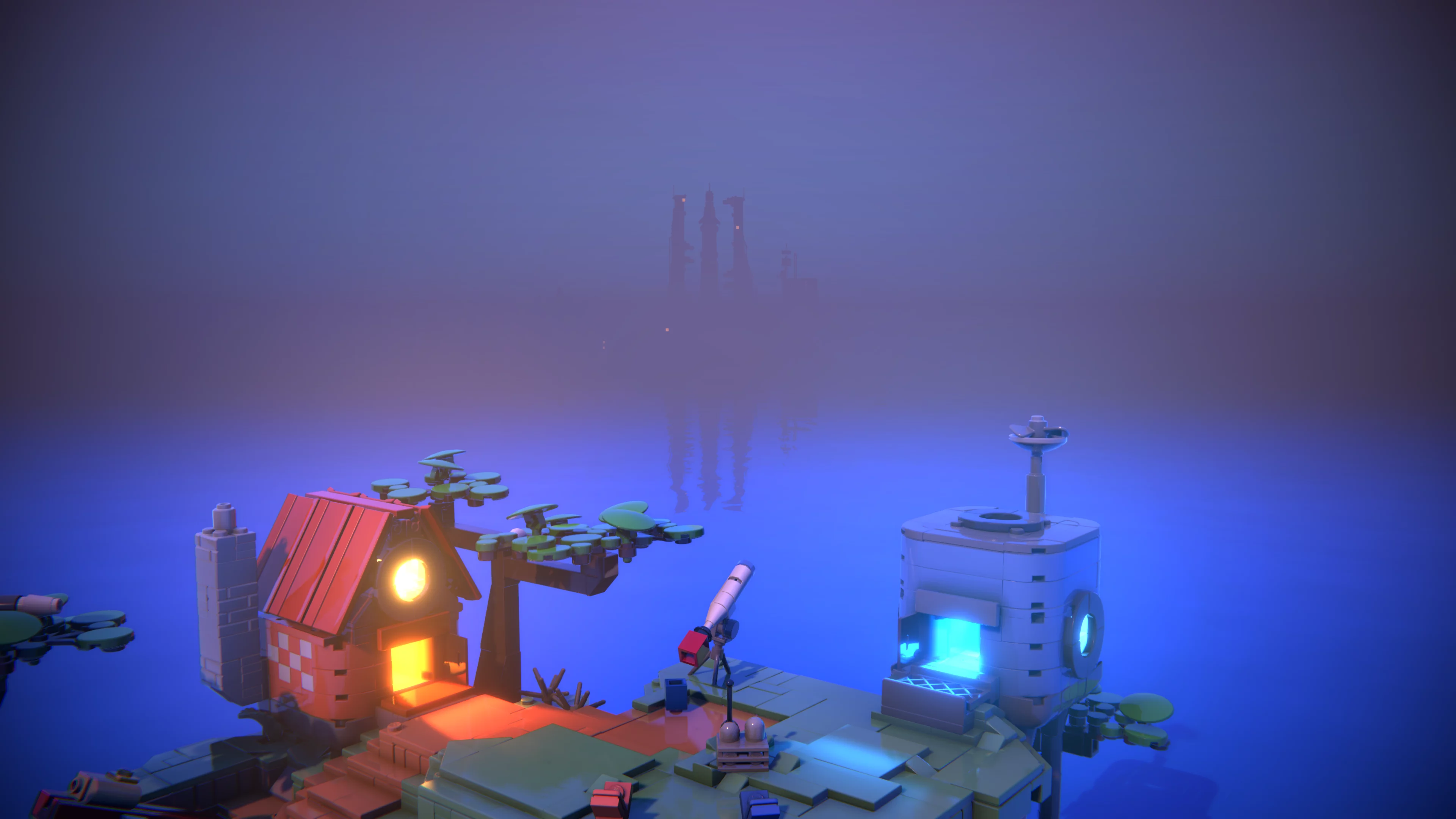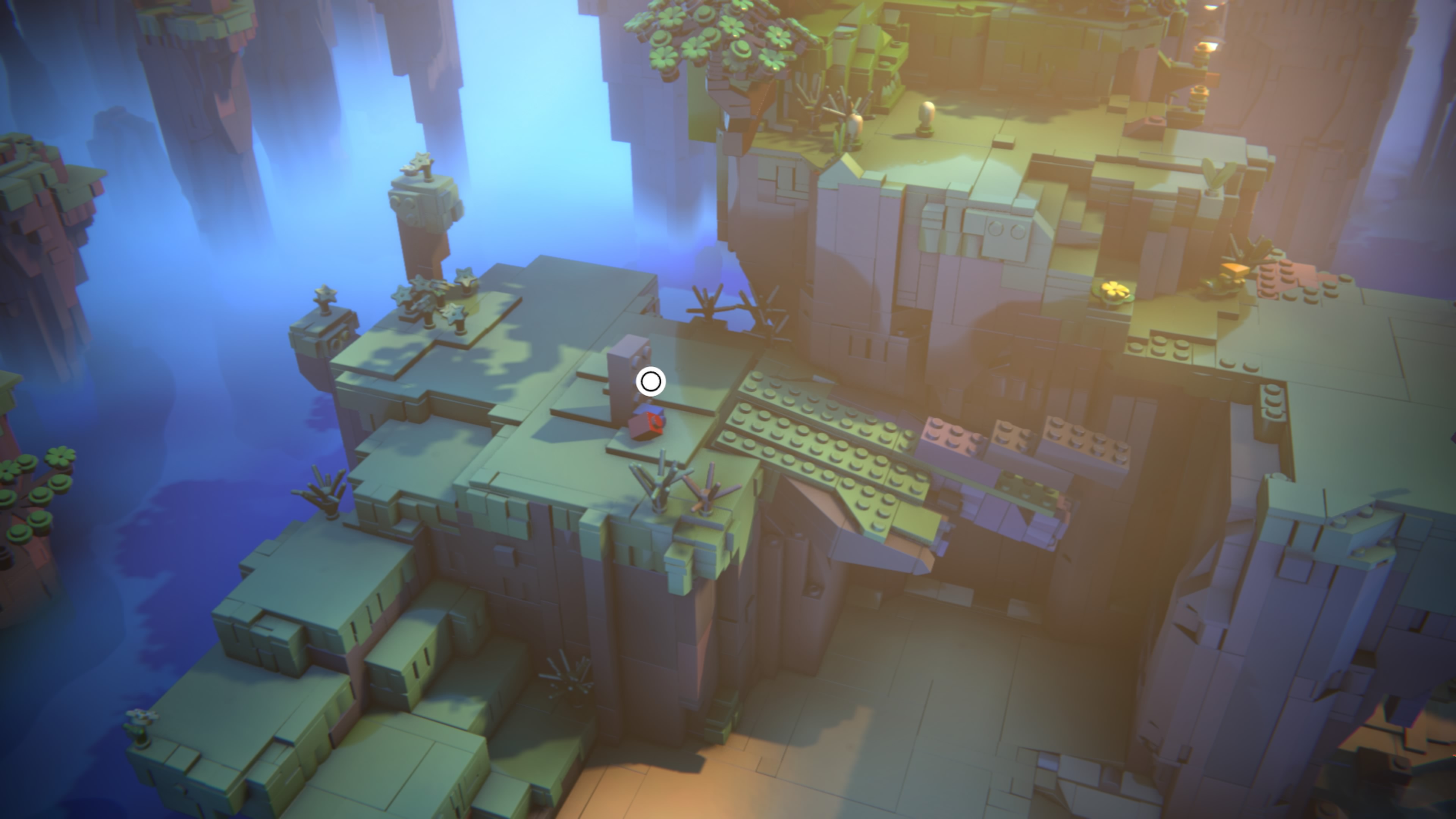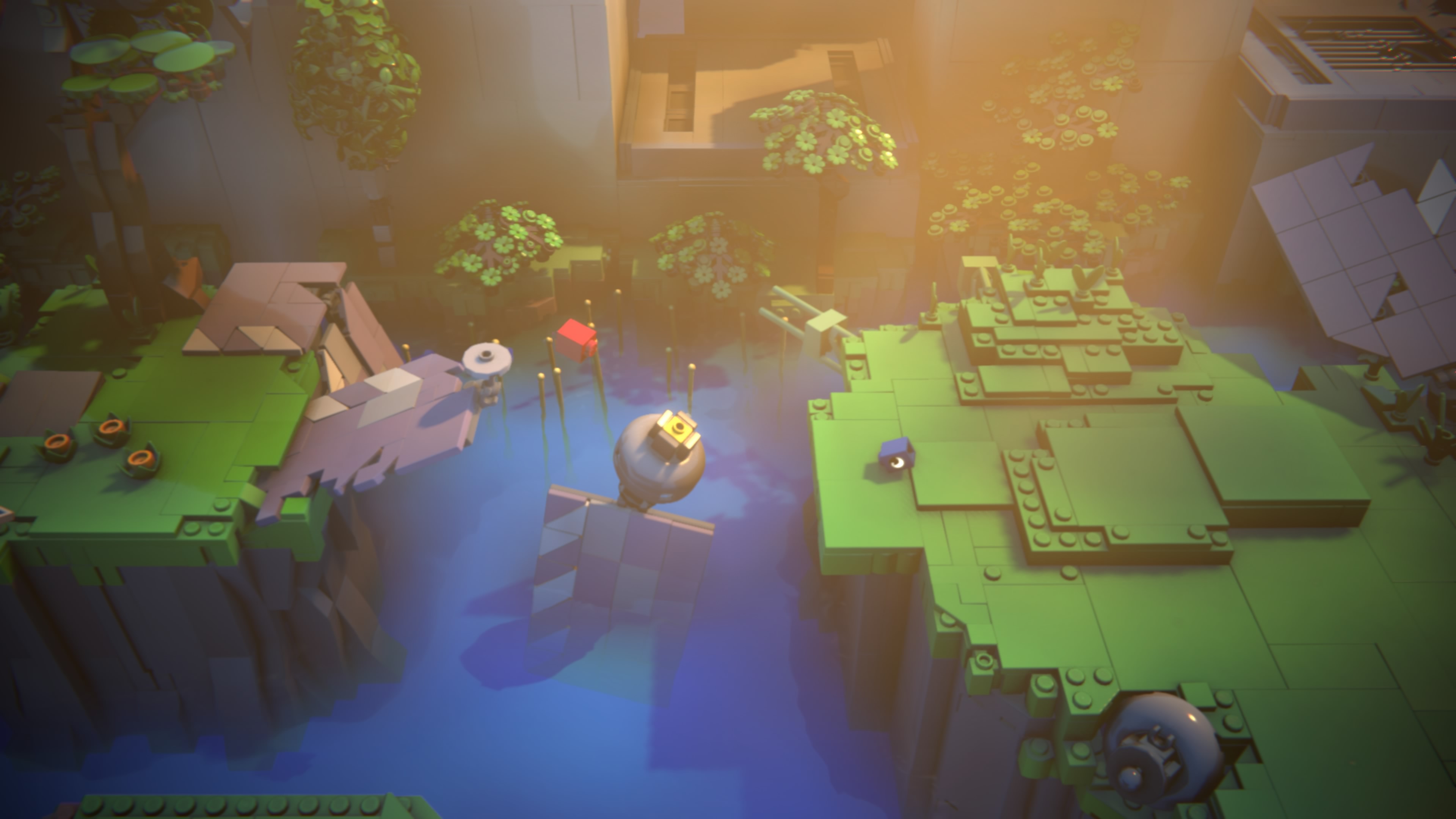 Développé grâce au moteur Unity, Lego Voyagers surprend par le soin appliqué à ses textures et effets. La lumière se reflète sur les briques du décor, l’eau bouge au gré du mouvement de nos briques ou des pièces du décor qui chutent dans les profondeurs. Le jeu est beau et fluide. Cette fluidité participe grandement à l’expérience en nous permettant de nous balader sans ralentissement et de ressentir, par le biais de nos briques, les changements de lumière et de climat du décor.