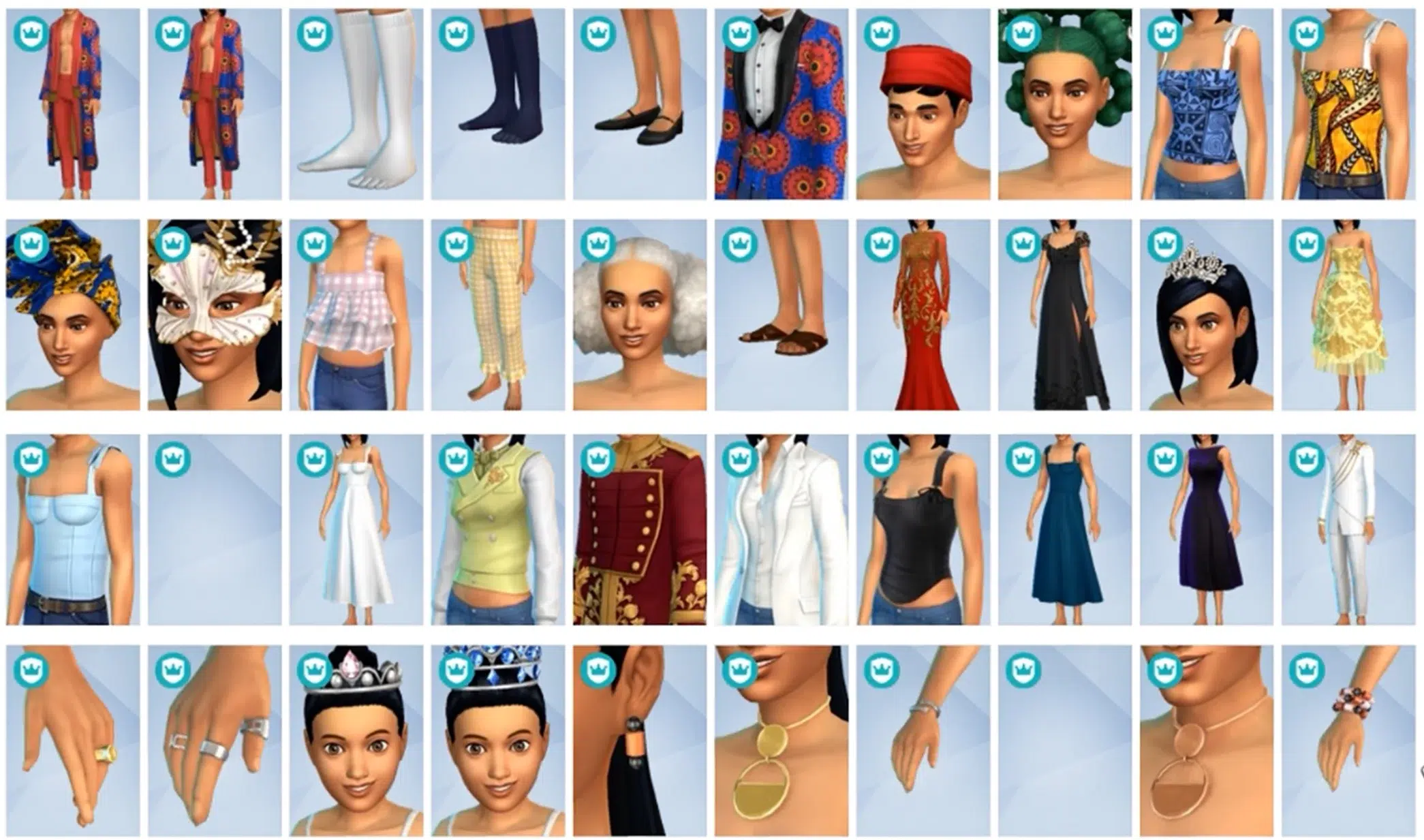 Pour les fans des modes Créer un Sim et Construction, Héritage et Royauté propose des catalogues parfaitement cohérents avec le thème du pack. Robes de princesses, couronnes (malheureusement mal ajustées aux coiffures des personnages…), masques de bal (qui flottent devant le visage des Sims…) et meubles ultra luxueux sont au programme. On retrouve également des items d’inspiration africaine, qui viennent combler un vrai manque dans les Sims 4.