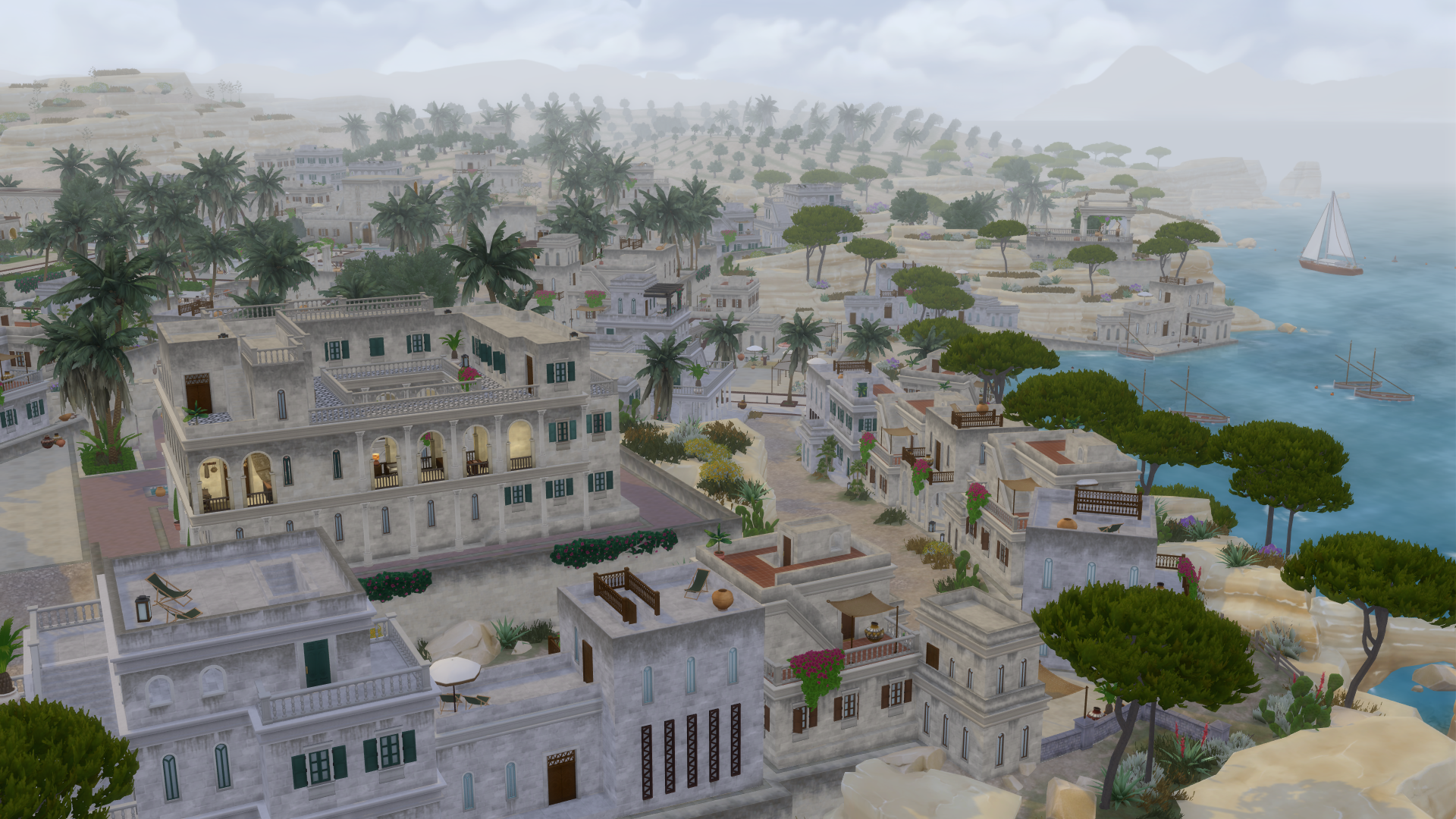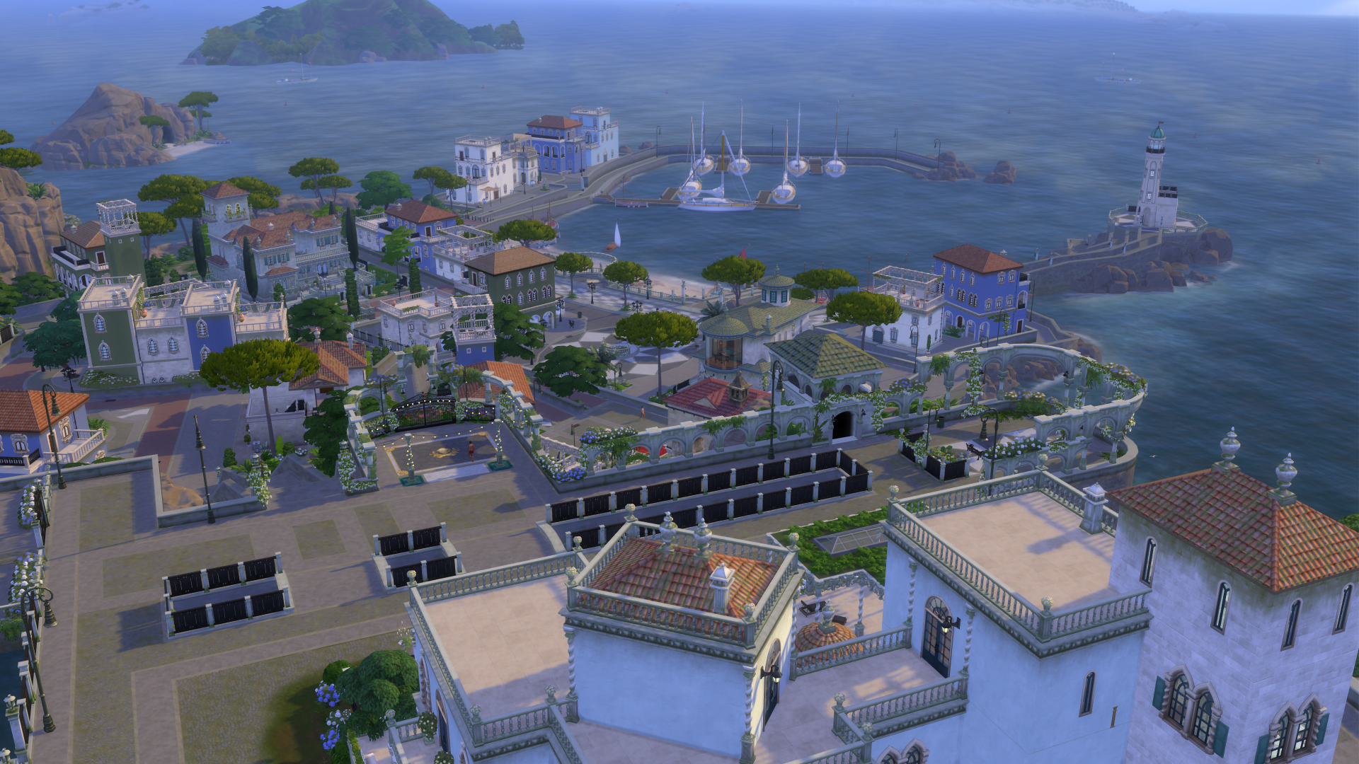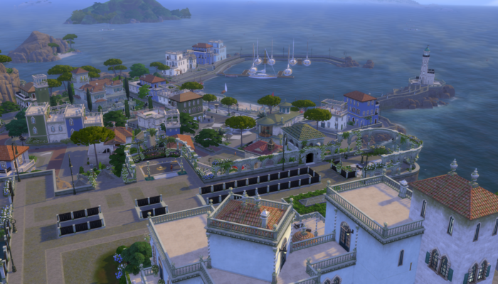 Grosse nouveauté avec Héritage et Royauté : le nouveau monde qui vient avec le DLC est divisé en trois quartiers représentant chacun un pays différent. La map nous emmène au bord de la Méditerranée, avec une zone d’inspiration portugaise, une autre qui fait penser à l’Italie, et un quartier aux influences nord-africaines. Enfin ! Alors qu’on est habitués aux mondes étatsuniens avec forêts, campagnes et centres-villes des Sims 4, un peu de diversité était bienvenue.
