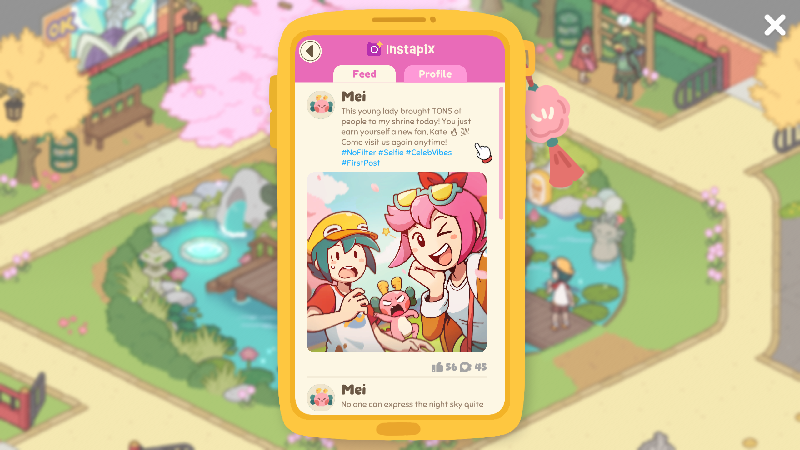 Si jusqu’alors on pensait avoir affaire à un jeu flash-like, de nouveaux éléments nous donnent tort. L’itération est riche en menus et fonctionnalités annexes, ce qui permet quelques comparaisons avec la saga reine du cozy game : Animal Crossing. D’abord avec la possession d’un téléphone faisant office de menu et d’appareil photo. Ensuite, avec la personnalisation très poussée du parc et du bureau, et enfin jusque dans la présentation des courriers que l’on reçoit.