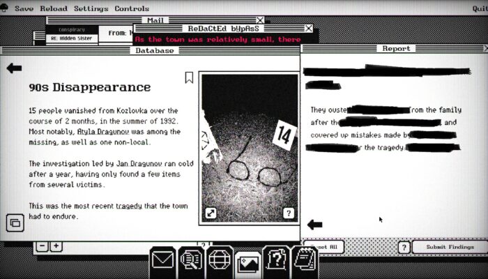 En tant que testeur, la comparaison avec TR-49 et Obra Dinn est inévitable, bien que les deux jeux soient très différents. Lost Wiki: Kozlovka est certainement plus accessible que ses deux grands frères avec, entre autre, un système d’indices très bien pensé qui ne se contente pas de cracher la solution maladroitement, mais plutôt d’indiquer quelles pages doivent figurer dans le rapport.