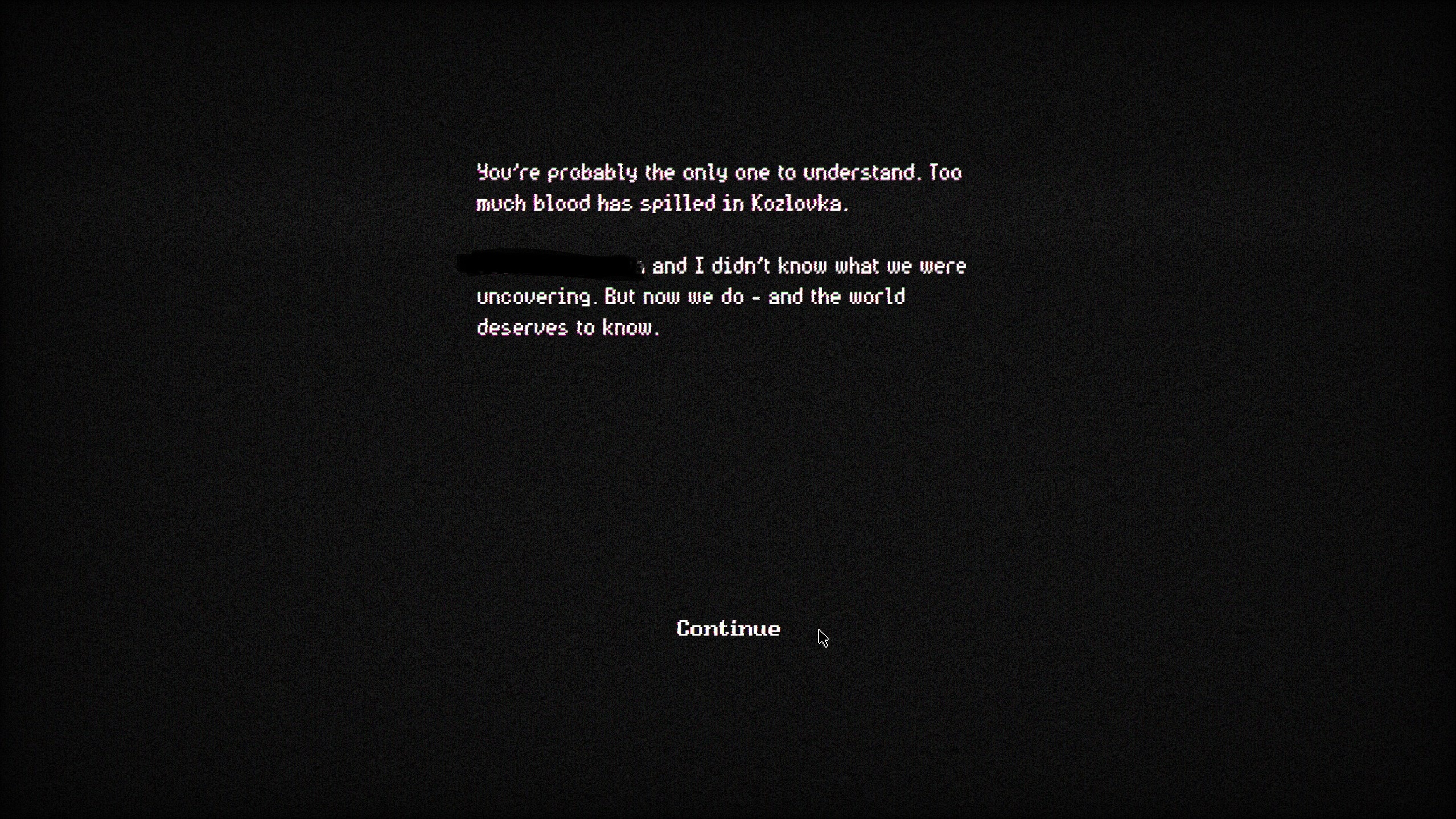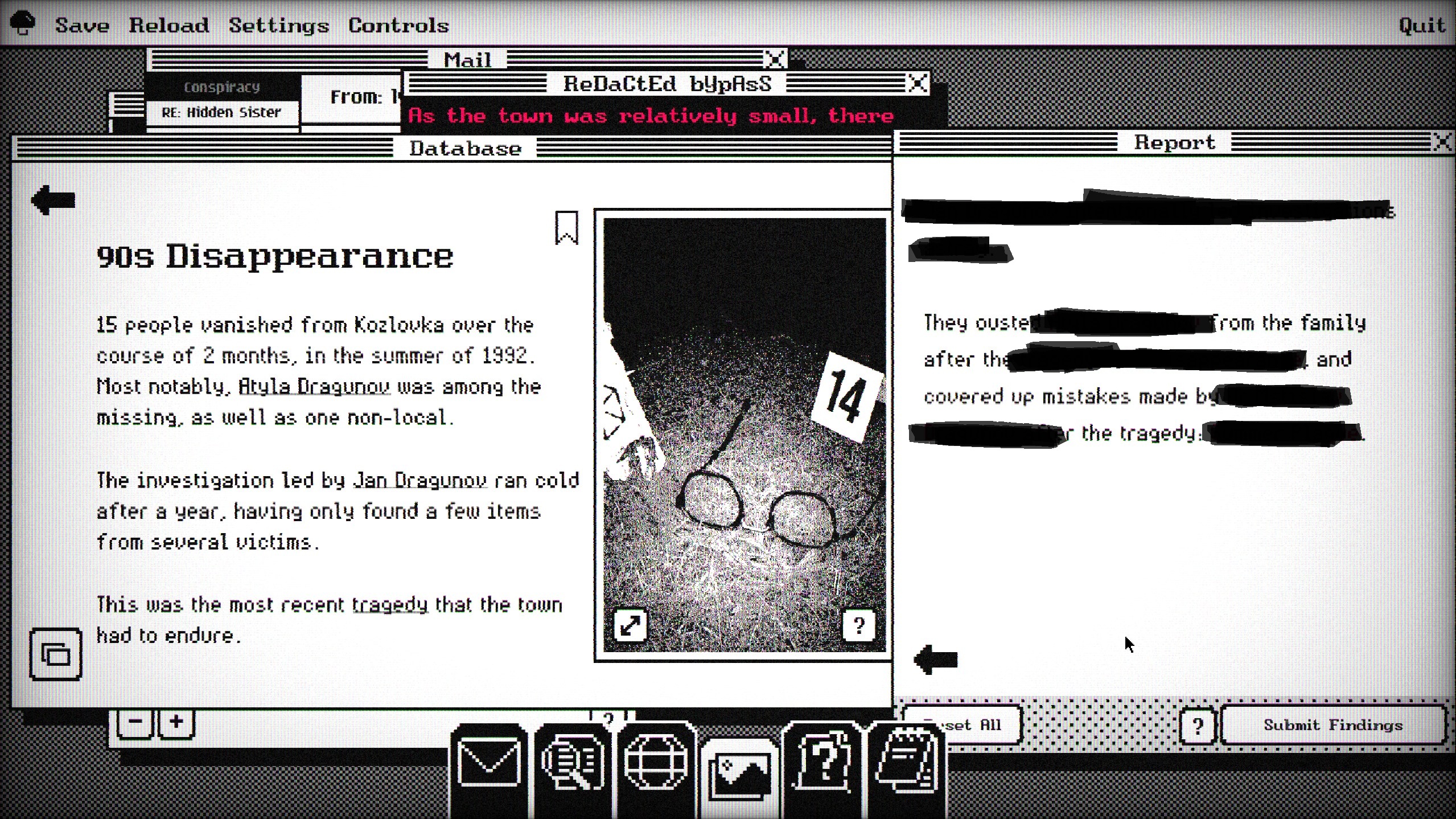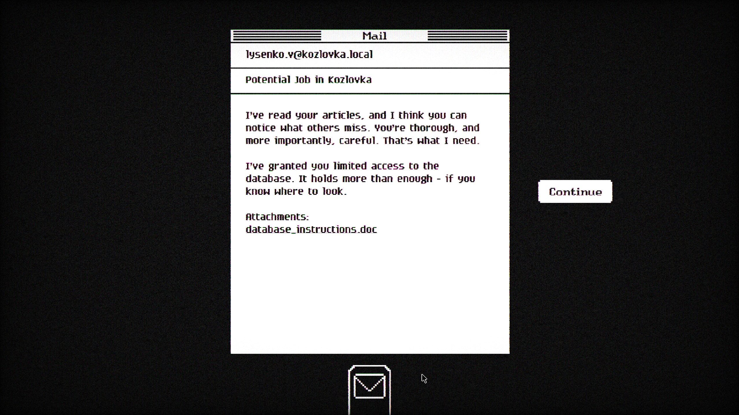 Un écran noir, un mail et nous voilà à la tête d’une enquête sur la disparition d’une personne chère à notre client. On se promène sur la base de données de Kozlovka à la recherche de pages et de [cette partie du test a été revue et jugée non divulgable par les autorités Zarnavienne] contenant les informations nécessaires à notre compréhension des événements, remontant éventuellement la piste.