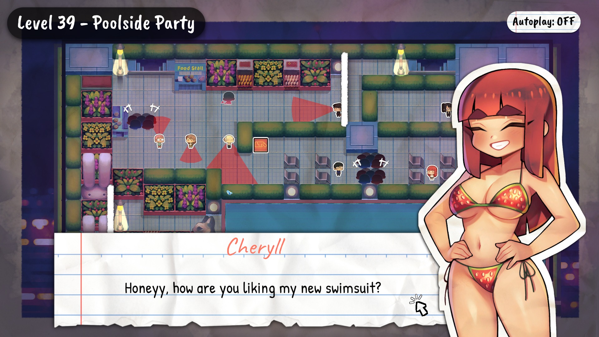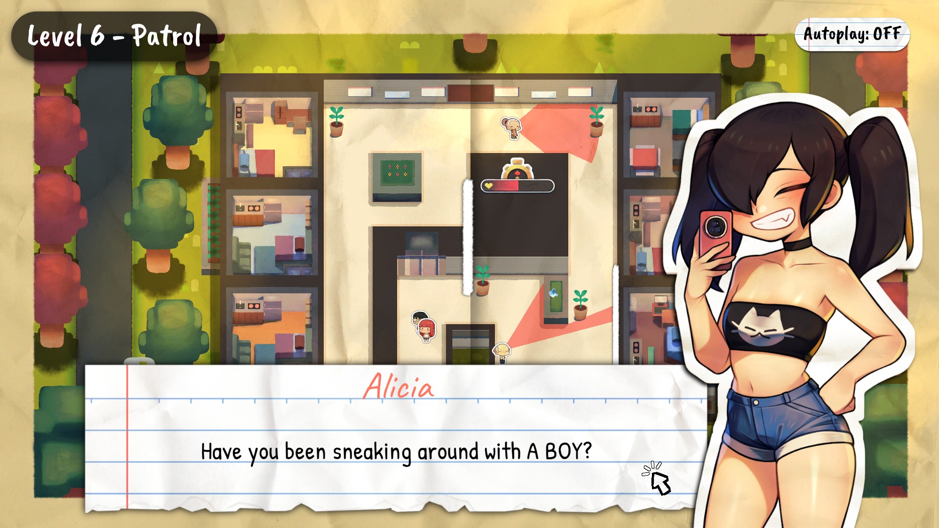 Dans Love in Tiny Spaces, on circule dans des environnements en vue de dessus, et comme dans tout jeu d’infiltration qui se respecte, on évite les cônes de visions de ses futurs beaux-parents, et autres tantes, neveux et nièces par alliance. Chaque niveau tient sur un écran, et aux mécaniques rudimentaires d’infiltration viennent s’ajouter des éléments de puzzle game.
