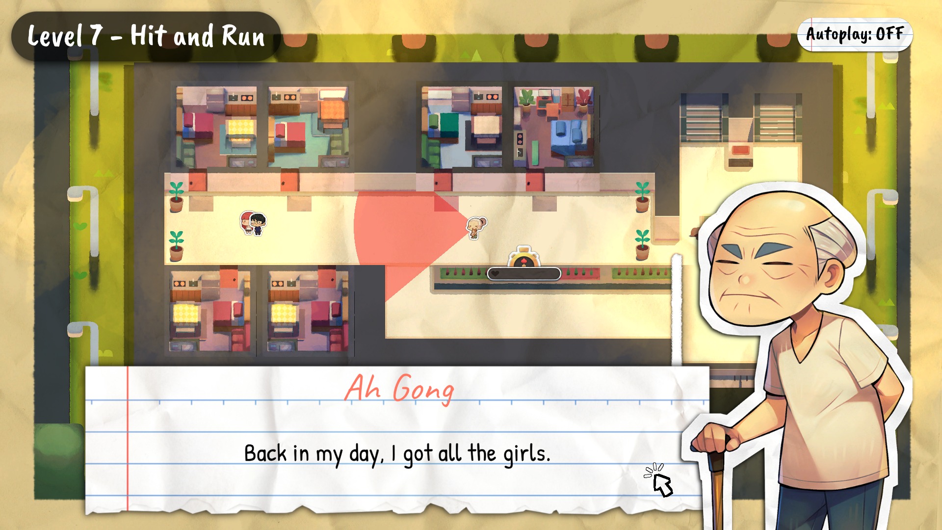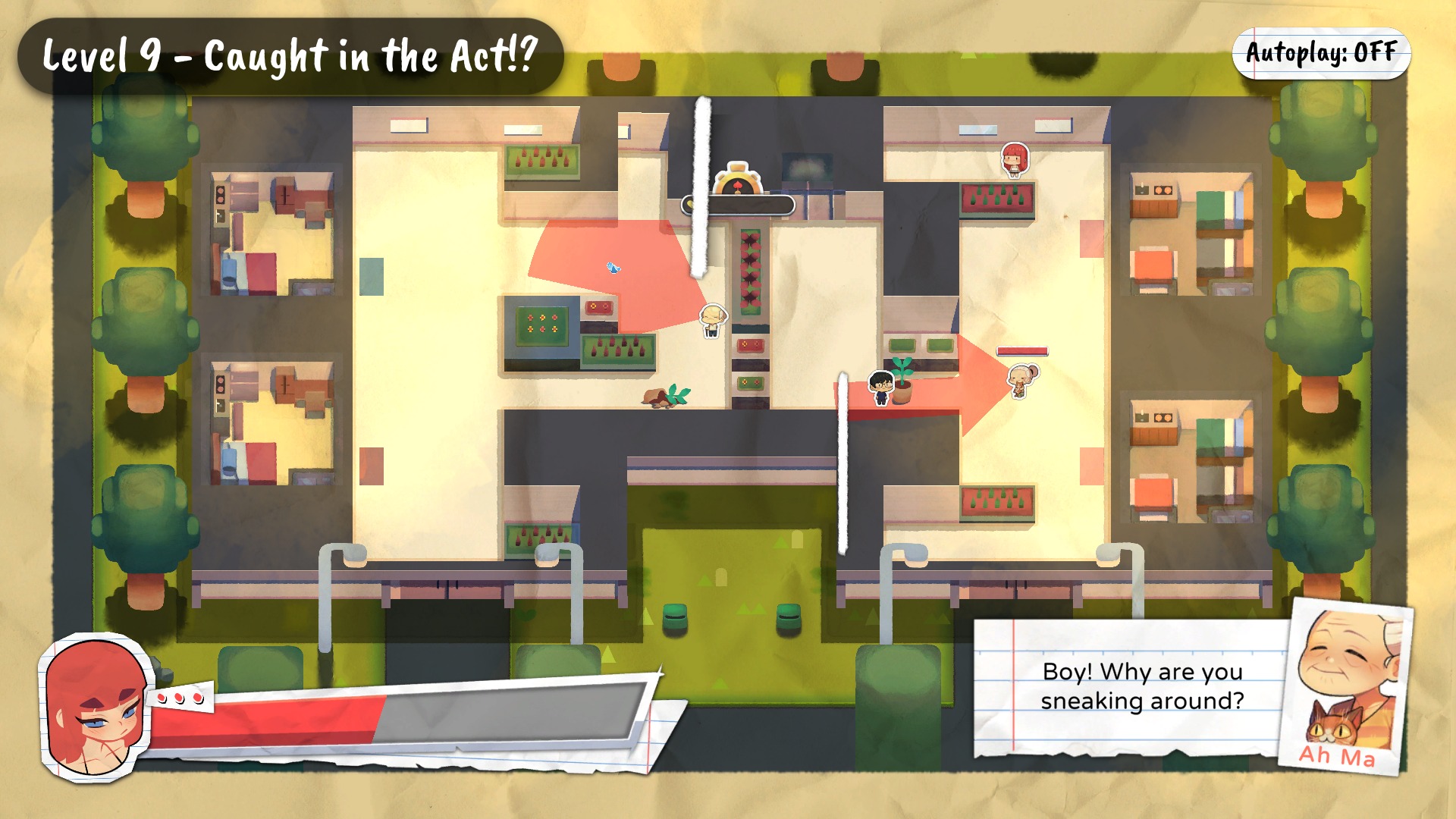 En effet, les niveaux peuvent être sensiblement modifiés en « pliant » ou « dépliant » des éléments qui supprimeront temporairement des murs, allongeront des couloirs, ou nous offriront des cachettes. Ajoutons que chacun des membres de la famille à esquiver adopte un comportement différent (les enfants se déplacent aléatoirement, la tante nous poursuit…). Et à ces mécaniques de bases, le jeu viendra en ajouter au fur et à mesure de la progression (des fantômes à éviter, et dont on peut se servir pour éliminer temporairement certains personnages gênants…), de façon à renouveler le gameplay tout au long de la grosse quarantaine de niveaux qu’il a à proposer.