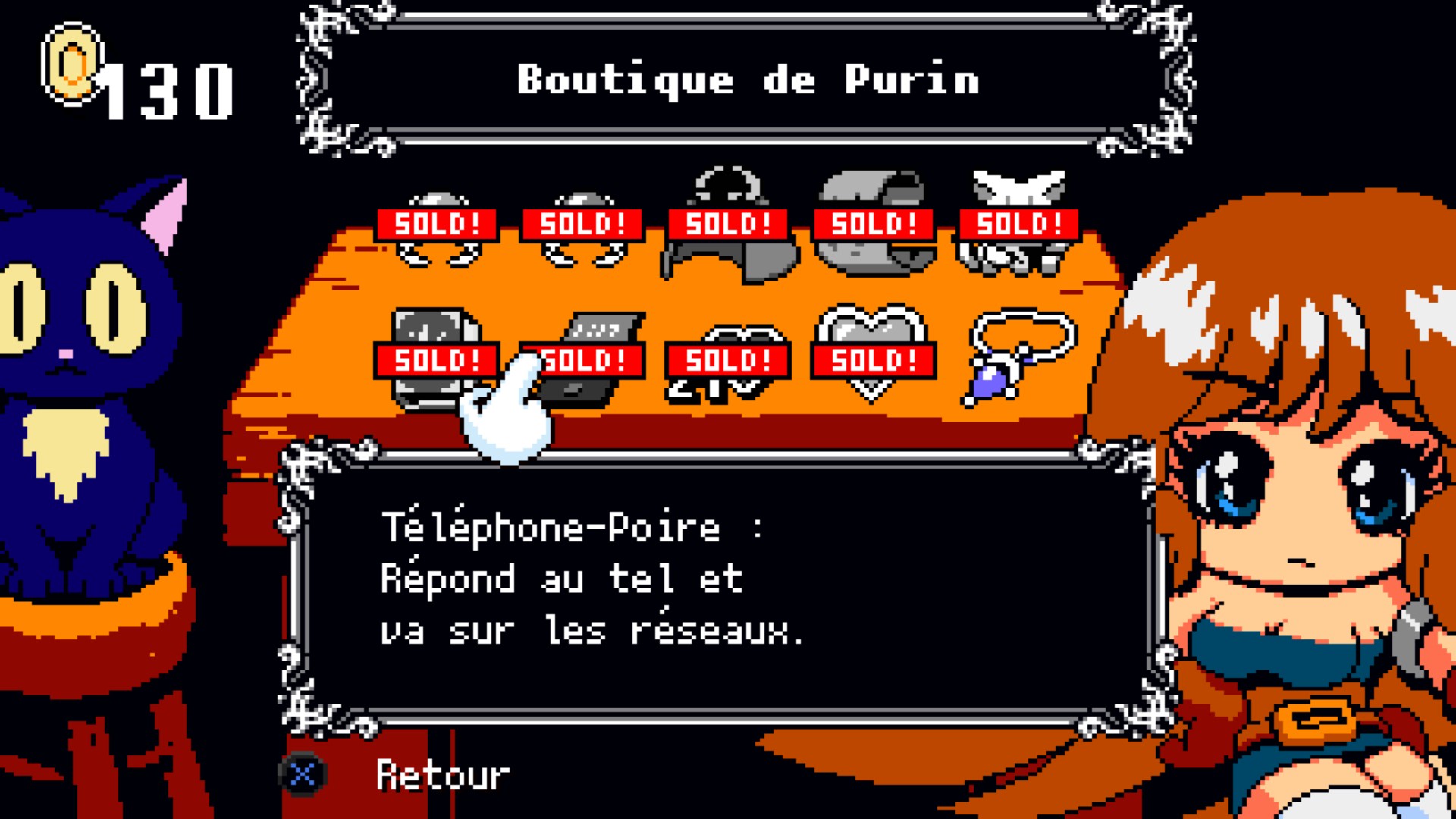 Assez rapidement, on découvre une boutique tenue par la charmante Purin (oui, lu en français, c’est pas super sexy comme prénom. Avec l’accent japonais, cela se rapproche un peu de « Pauline », ce qui est quand même plus joli). Grâce aux pièces glanées dans les niveaux, on lui achète des trucs juste pour ses beaux yeux, sans exactement toujours savoir à quoi chaque objet peut bien servir.