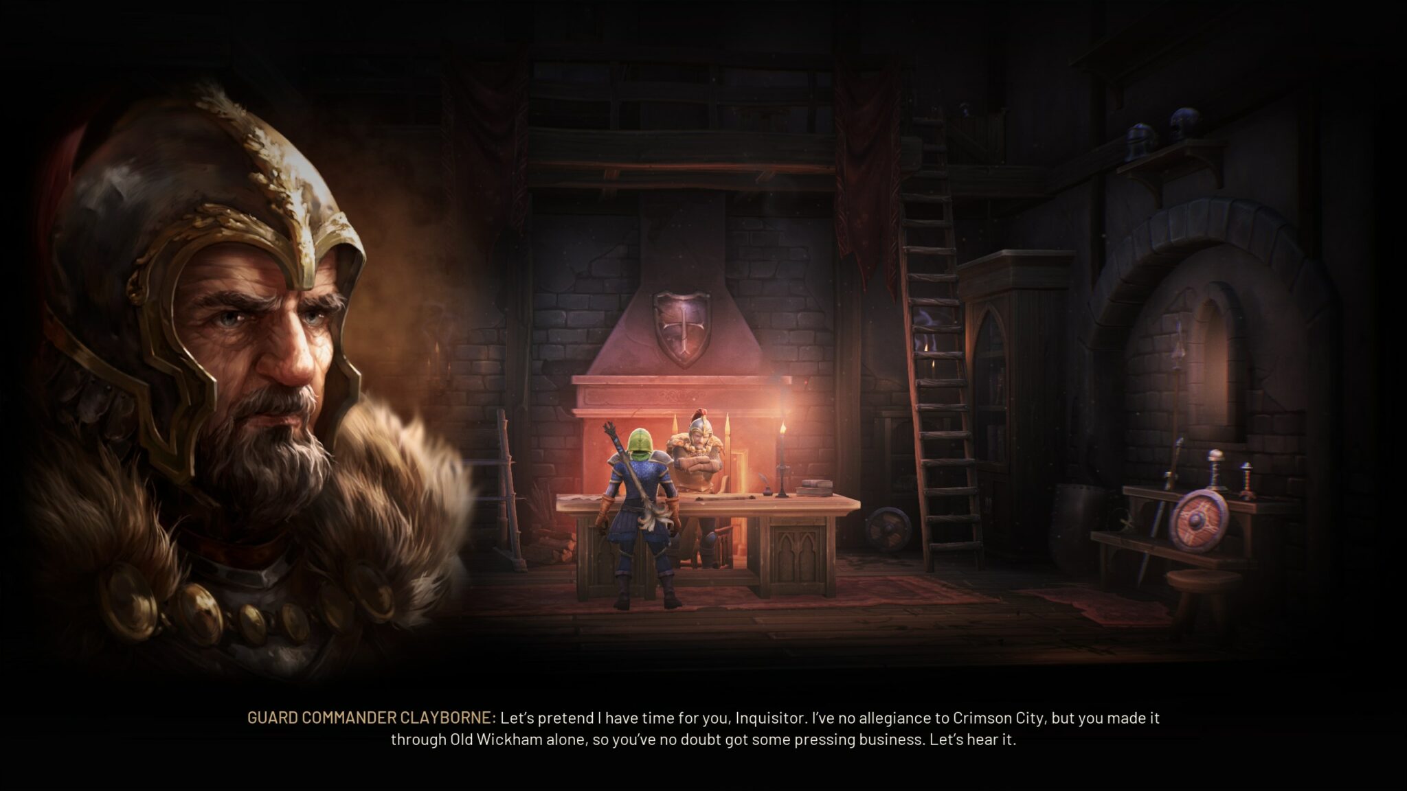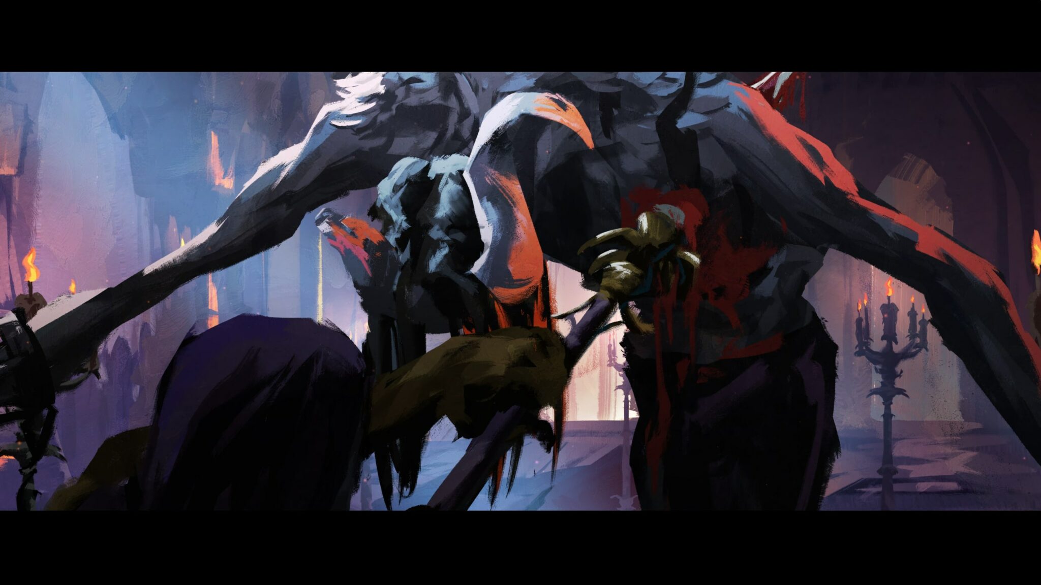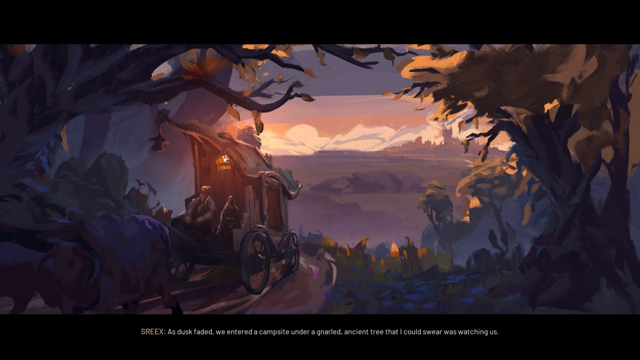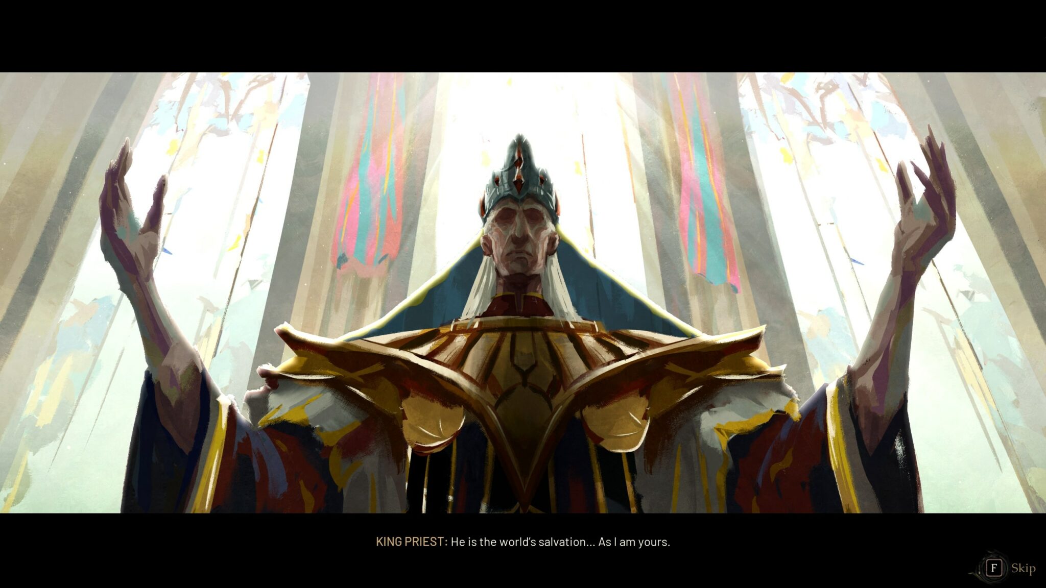 S’ouvre alors une cinématique du plus bel effet, construite autour de superbes concept arts animés qui posent élégamment les bases de l’intrigue. Une sorcière, prisonnière des inquisiteurs de Crimson City, est menée à l’exécution publique. Sous les acclamations d’une foule en liesse, le roi — maître d’une magie sacrée — entame la mise à mort en purifiant l’accusée par la lumière.