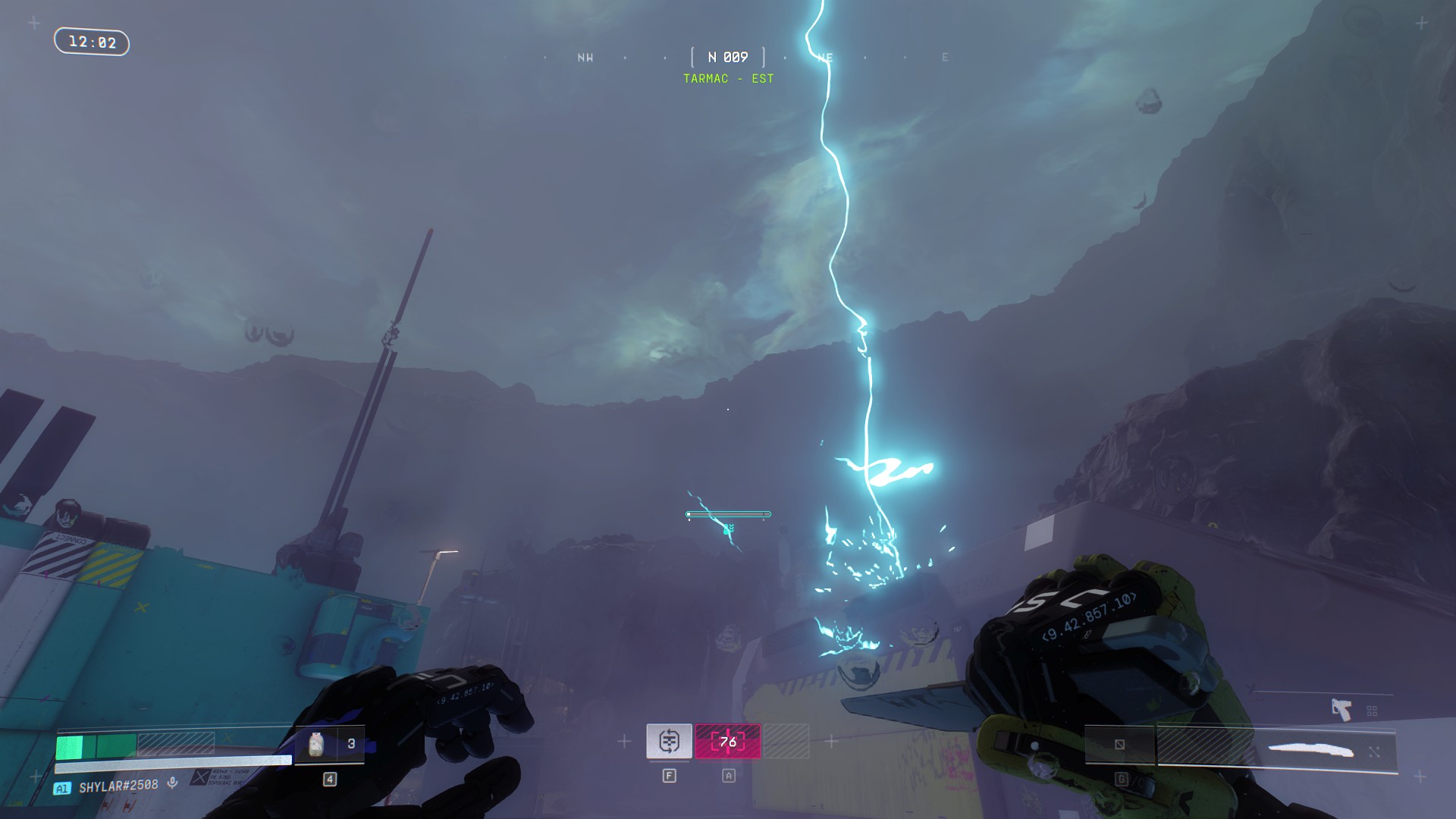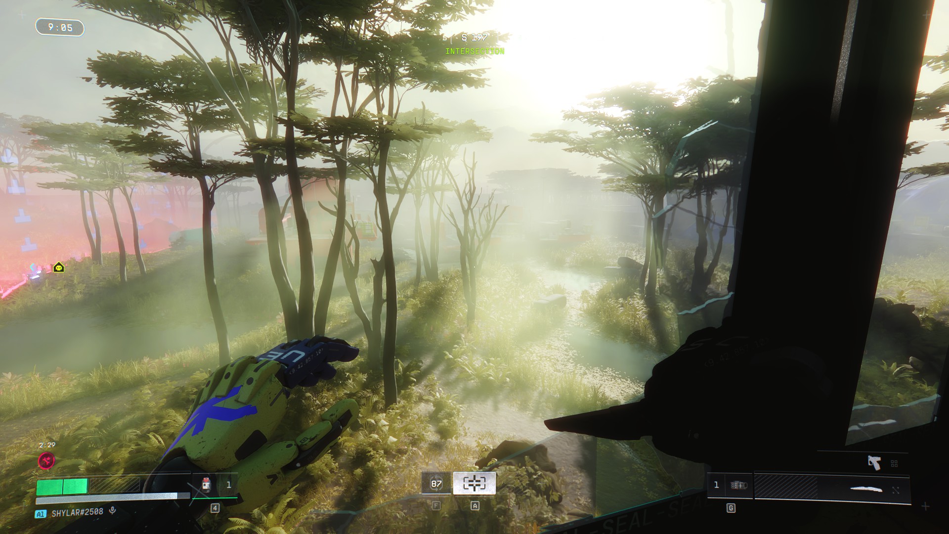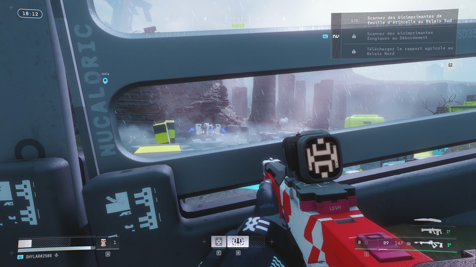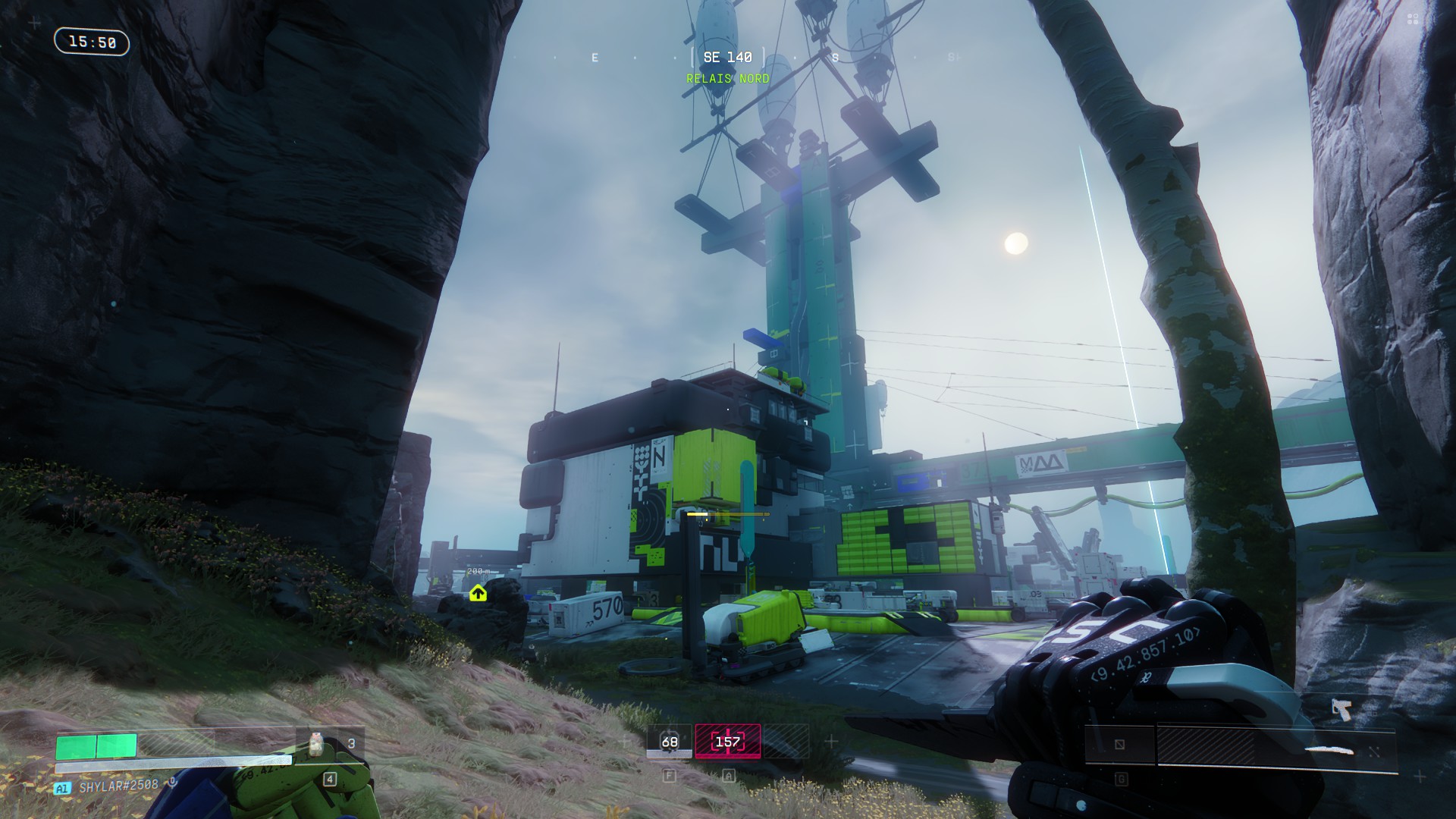C’est d’autant plus paradoxal que Bungie a réalisé un véritable travail d’orfèvre sur la direction artistique. Marathon se déroule en 2893 et s’autorise une palette visuelle franchement excentrique : jaunes acides, bleus électriques et roses saturés qui envahissent les intérieurs industriels pendant que les extérieurs sous la pluie, ou enveloppé de brouillard virent parfois au monochrome. Clivant, mais parfaitement cohérent avec ce que le jeu veut raconter et nous faire ressentir. Et c’est ce même studio qui peine à concevoir des cosmétiques vendables, qui a aussi imaginé des environnements ou la météo n’est pas qu’un simple décor mais une mécanique à part entière.