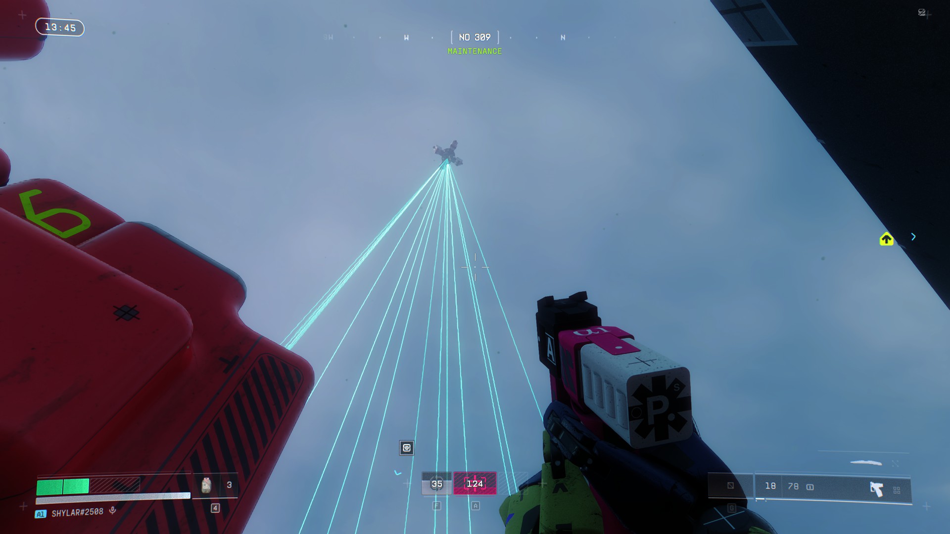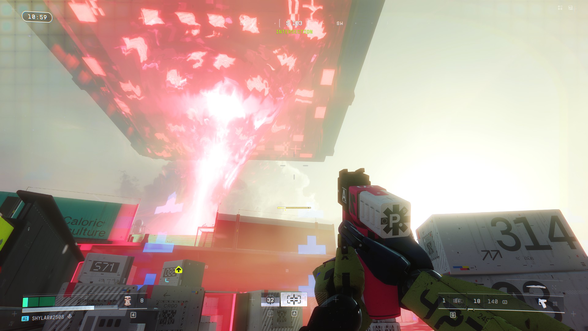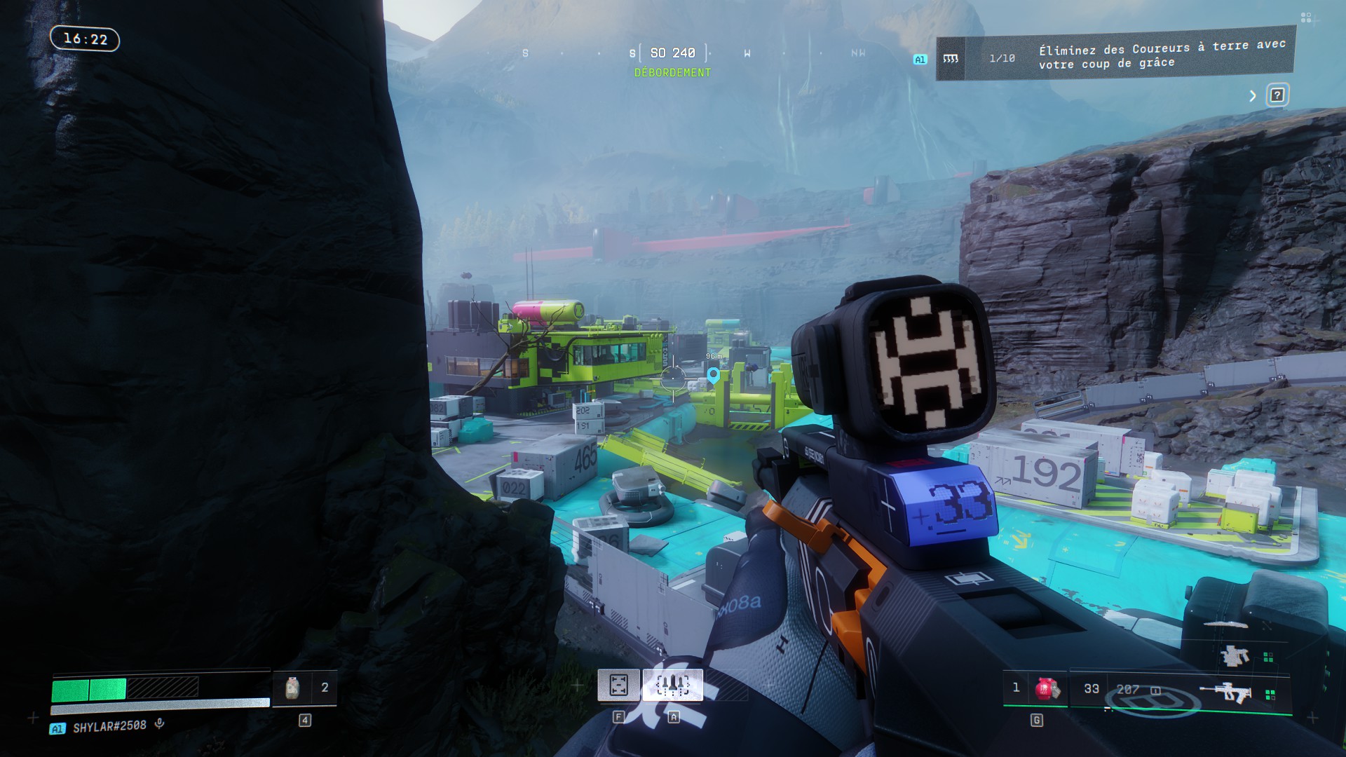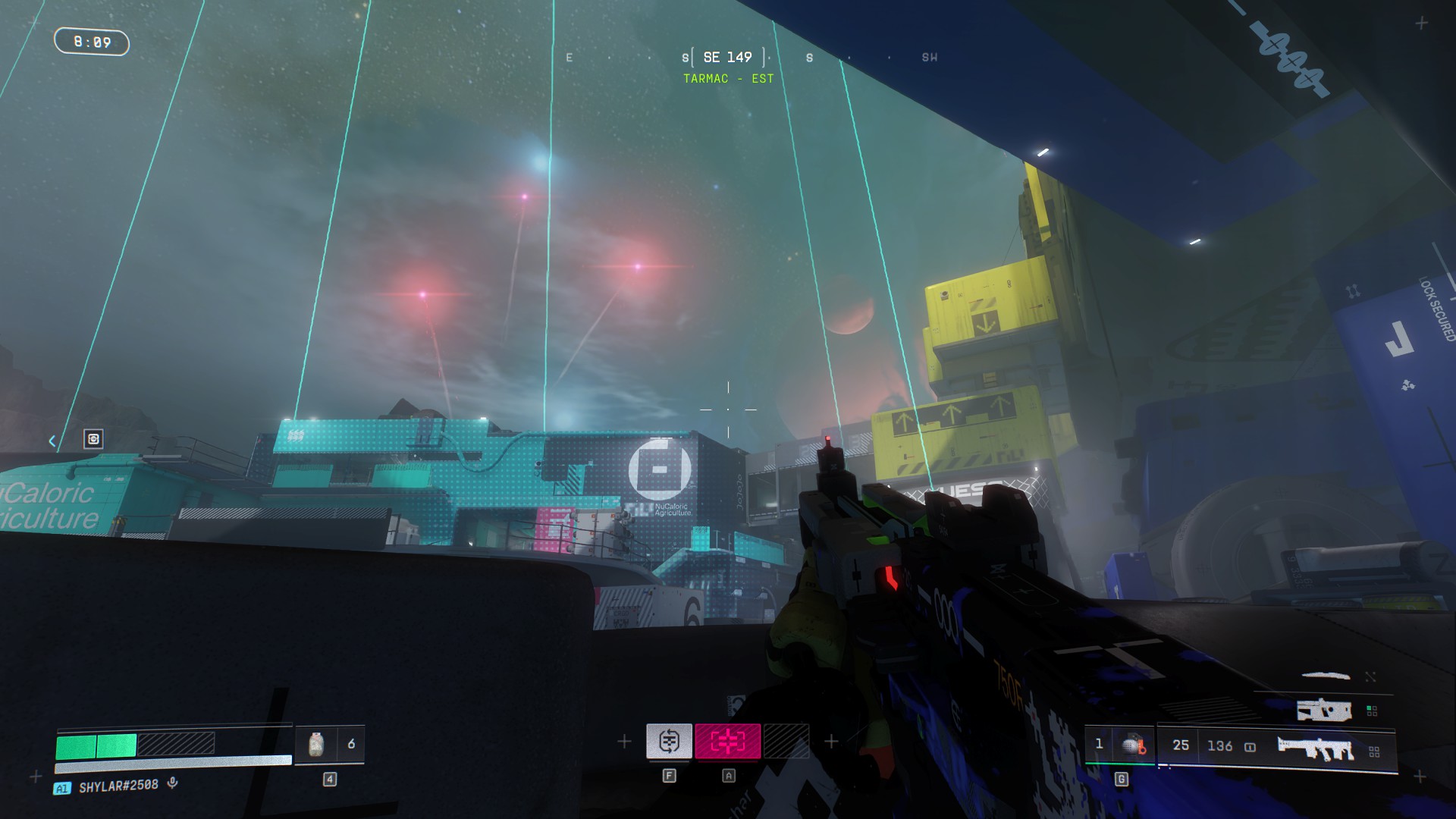 C’est d’autant plus paradoxal que Bungie a réalisé un véritable travail d’orfèvre sur la direction artistique. Marathon se déroule en 2893 et s’autorise une palette visuelle franchement excentrique : jaunes acides, bleus électriques et roses saturés qui envahissent les intérieurs industriels pendant que les extérieurs sous la pluie, ou enveloppé de brouillard virent parfois au monochrome. Clivant, mais parfaitement cohérent avec ce que le jeu veut raconter et nous faire ressentir. Et c’est ce même studio qui peine à concevoir des cosmétiques vendables, qui a aussi imaginé des environnements ou la météo n’est pas qu’un simple décor mais une mécanique à part entière.