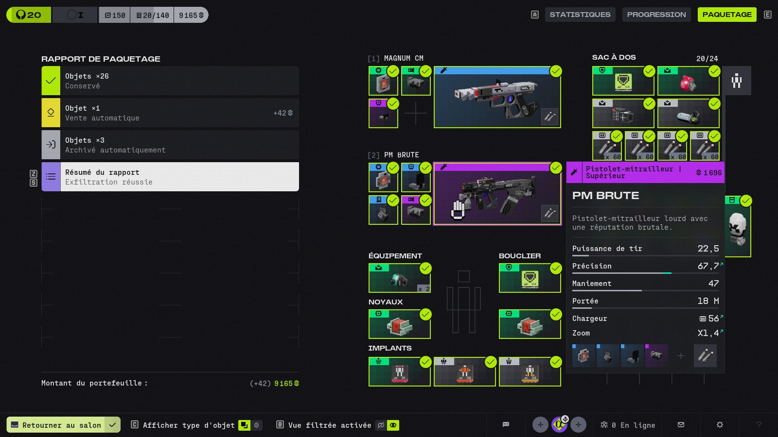 À partir de cinq à six heures, on finit par saisir la logique : les matériaux servent soit à améliorer son compte via des bonus permanents, comme un coffre de stockage agrandi, des dégâts de chute réduits ou de nouveaux objets disponibles, soit à être échangés contre des équipements et objets de soin auprès des différentes factions.