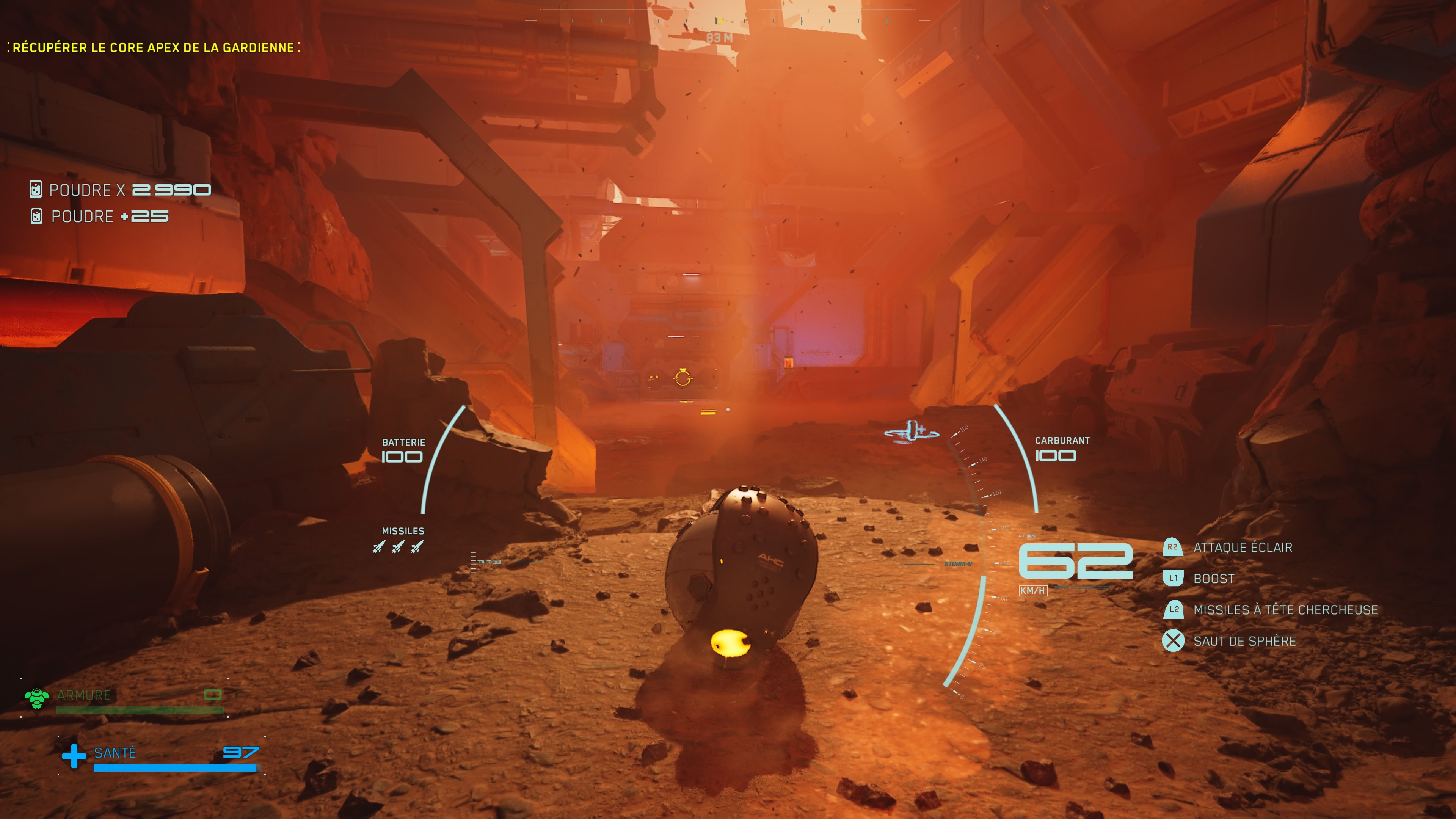 Une fois aux commandes d’Aska, le gameplay s’assimile très rapidement. Notre protagoniste sprinte automatiquement, peut faire des doubles sauts, planer grâce à un jet pack, s’agripper aux plateformes grâce à un grappin et courir sur les murs. Les fameux cores que nous avons cités un peu plus haut peuvent également être extraits à la volée pour, au choix, regagner un peu d’énergie ou être balancés sur vos ennemis en guise de grenades.