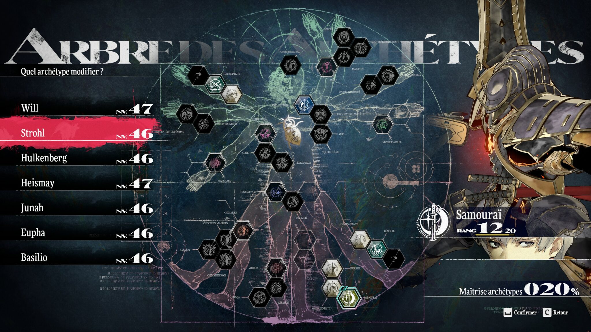 On ajoute à cela ces fameux archétypes, qui sont en fait des jobs, interchangeables à volonté hors des combats pour tous nos personnages, et qui bénéficient d’évolutions en fonction de la progression de nos différents liens sociaux. Chaque branche de classe est affiliée à l’un de nos alliés et à la progression de son lien social.