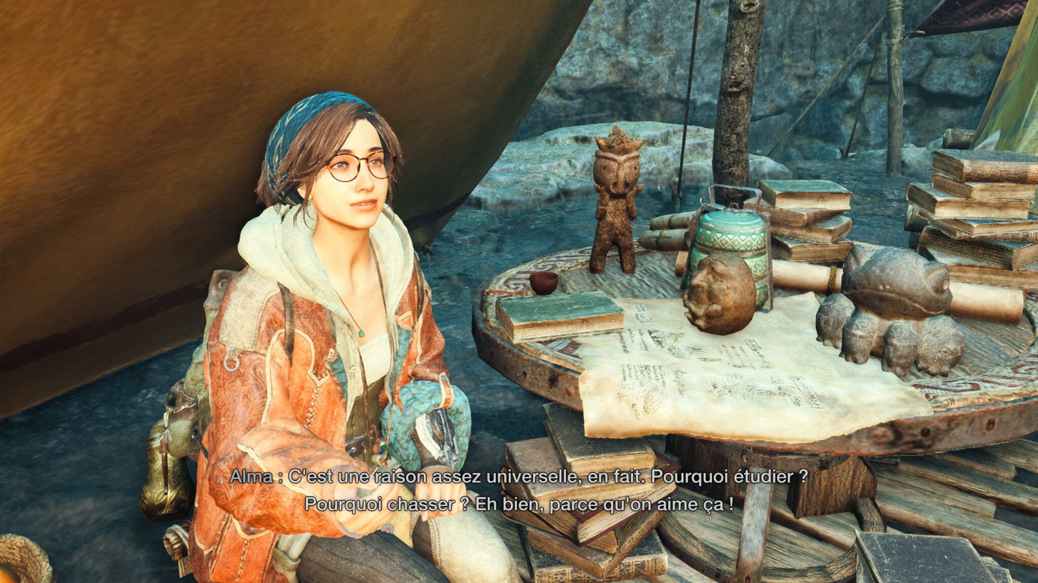 Nos débuts sont aussi l’occasion de rencontrer une galerie de personnages qui nous accompagneront des heures durant. Particulièrement bien modélisés et expressifs, ceux-ci se révèlent être bien plus que de simples fonctions. Dans les opus précédents, on allait voir les différents PNJ pour forger des armes ou armures, choisir une mission, nous entrainer, bref, pour un objectif pratique. Dans Monster Hunter Wilds, et aussi parce que la narration se fait bien plus présente qu’auparavant, on s’attache à Alma, Gemma ou Olivia par exemple et on apprend à les connaitre mieux, bien au-delà de leurs fonctions respectives.