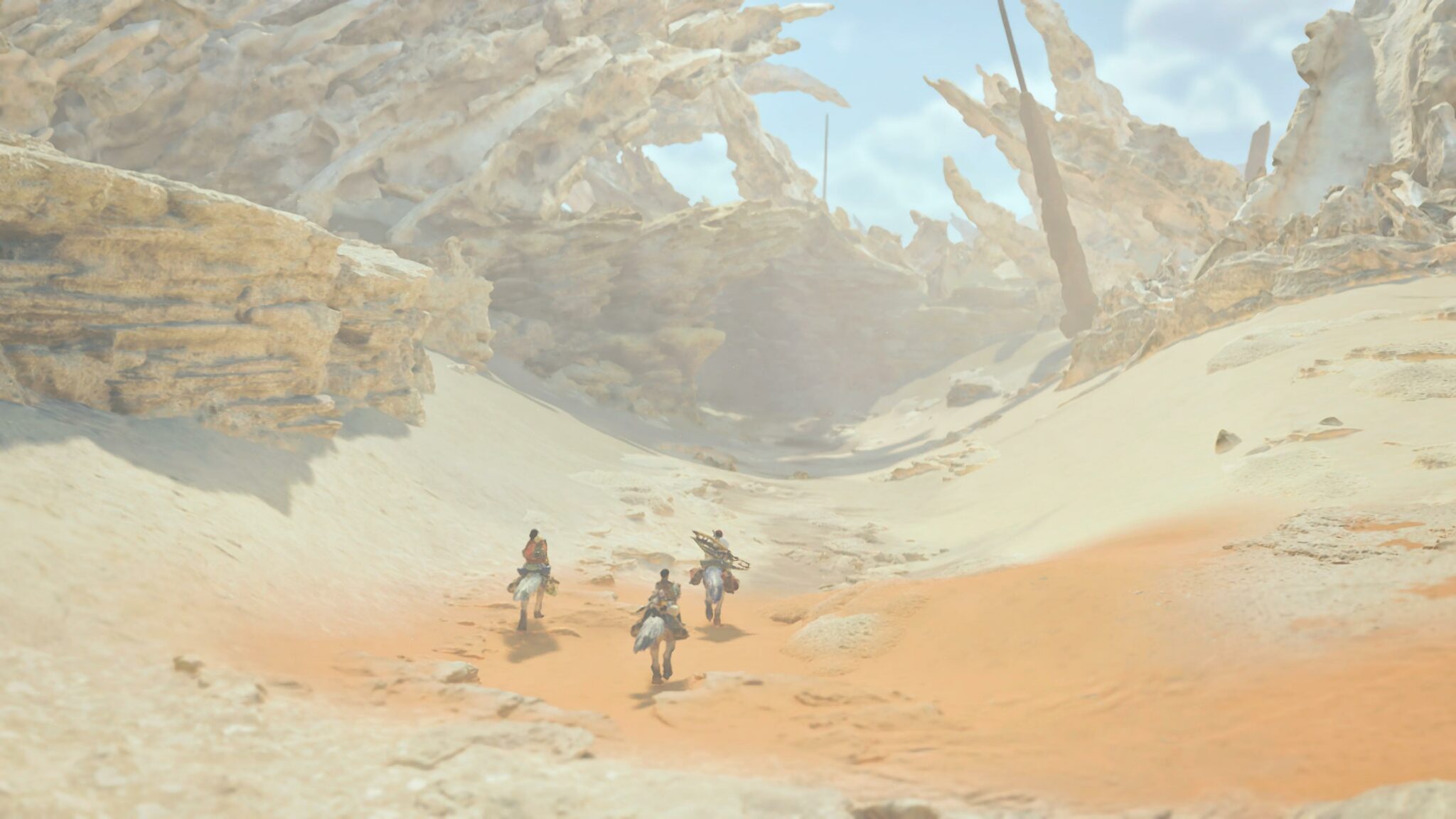 Nous voici donc embarqué dans un nouveau monde. La guilde des chasseurs nous a convoqués afin de soutenir les équipes d’exploration parties pour les Terres Interdites. Notre aventure commence d’ailleurs par la découverte dans le désert du veilleur Nata, habitant de ces terres inconnues que nous décidons de prendre sous notre aile. Le pauvre enfant a en effet fui son village suite à l’attaque d’un monstre mystérieux que l’on baptisera rapidement « le spectre blanc ». Ni une ni deux, notre grande quête se dessine et nous sommes donc parti pour enquêter sur cette créature pour parvenir à ramener Nata à son village, ou l’inverse.
