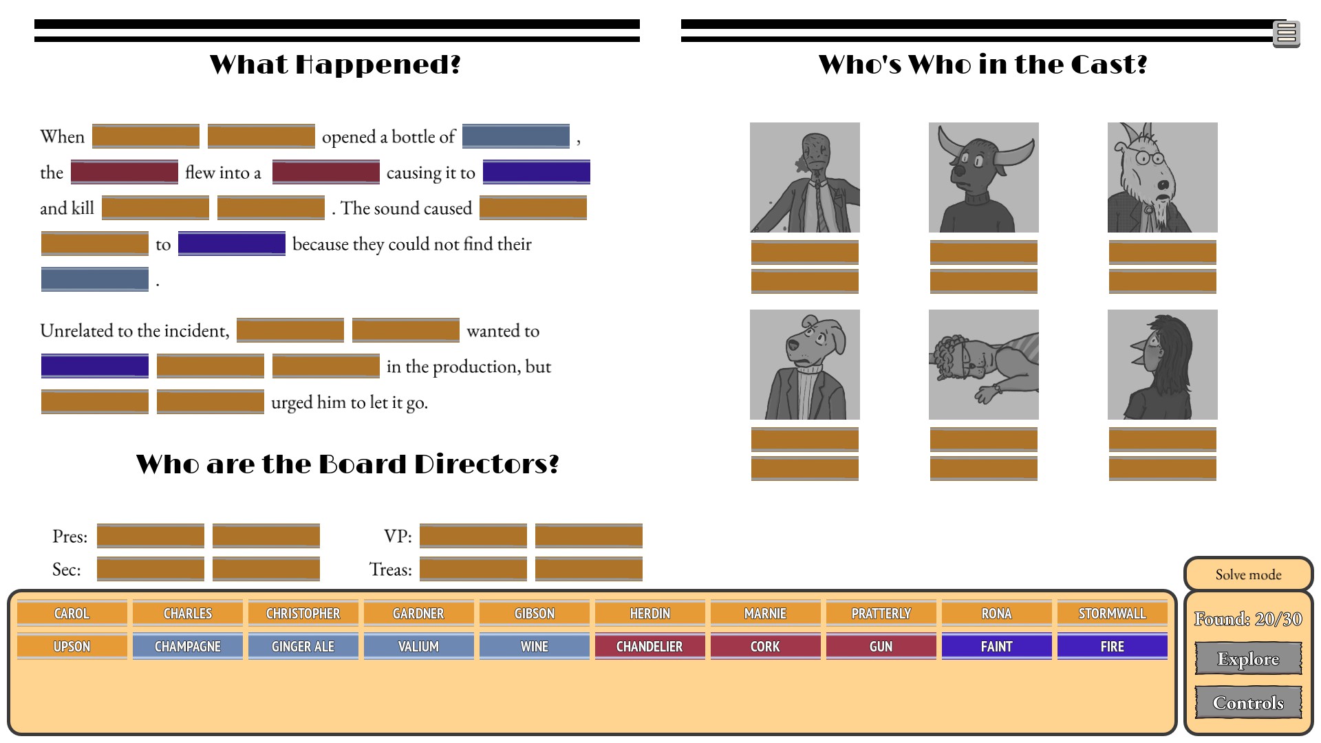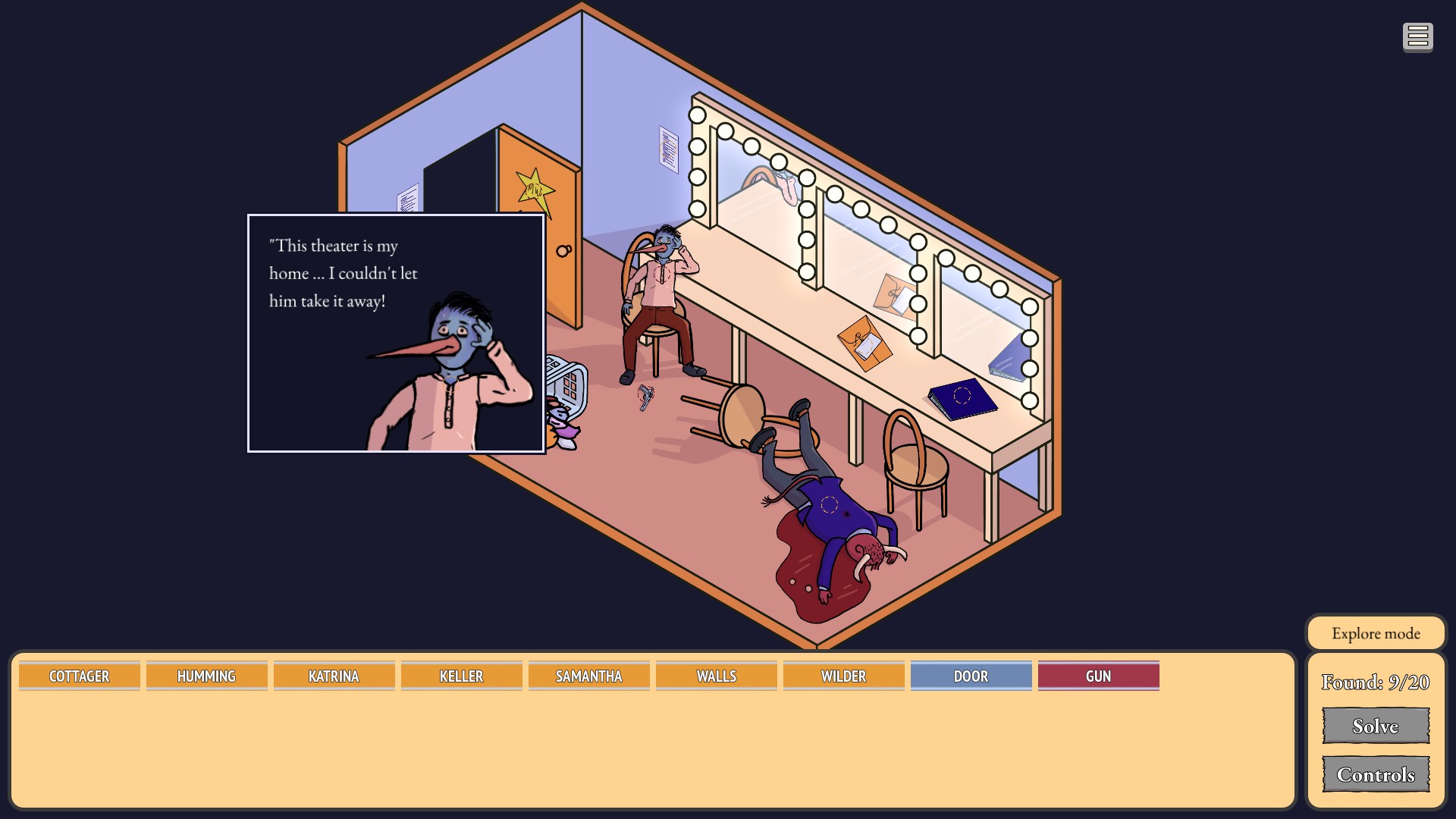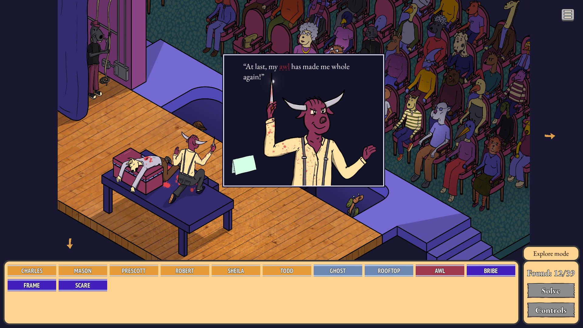 La particularité de Murder at the Birch Tree Theater, c’est que le joueur observe la scène d’un point de vue omniscient. Ici, nous ne jouons pas un personnage intradiégétique ou un enquêteur. Comme au théâtre, nous ne sommes que spectateurs de ce qui se déroule sous nos yeux, sans pouvoir interagir avec les acteurs. On récupère des indices sous forme de mots, puis, à nous de résoudre l’enquête en comprenant qui est qui, et en complétant un texte à trous qui explique le déroulé des événements. Les mots récupérés au fil de l’exploration ne serviront pas tous, et certains seront tout simplement de fausses pistes.