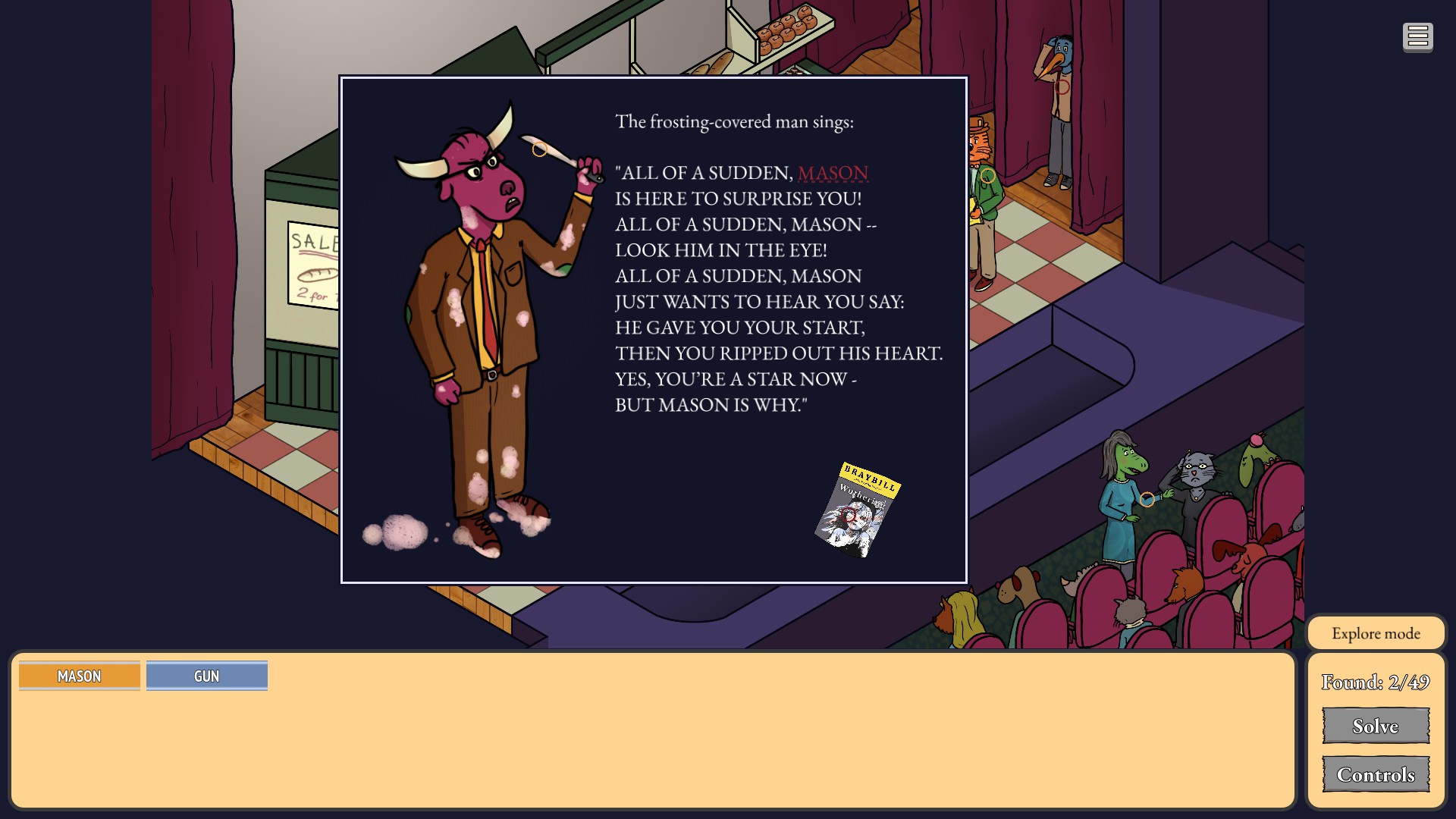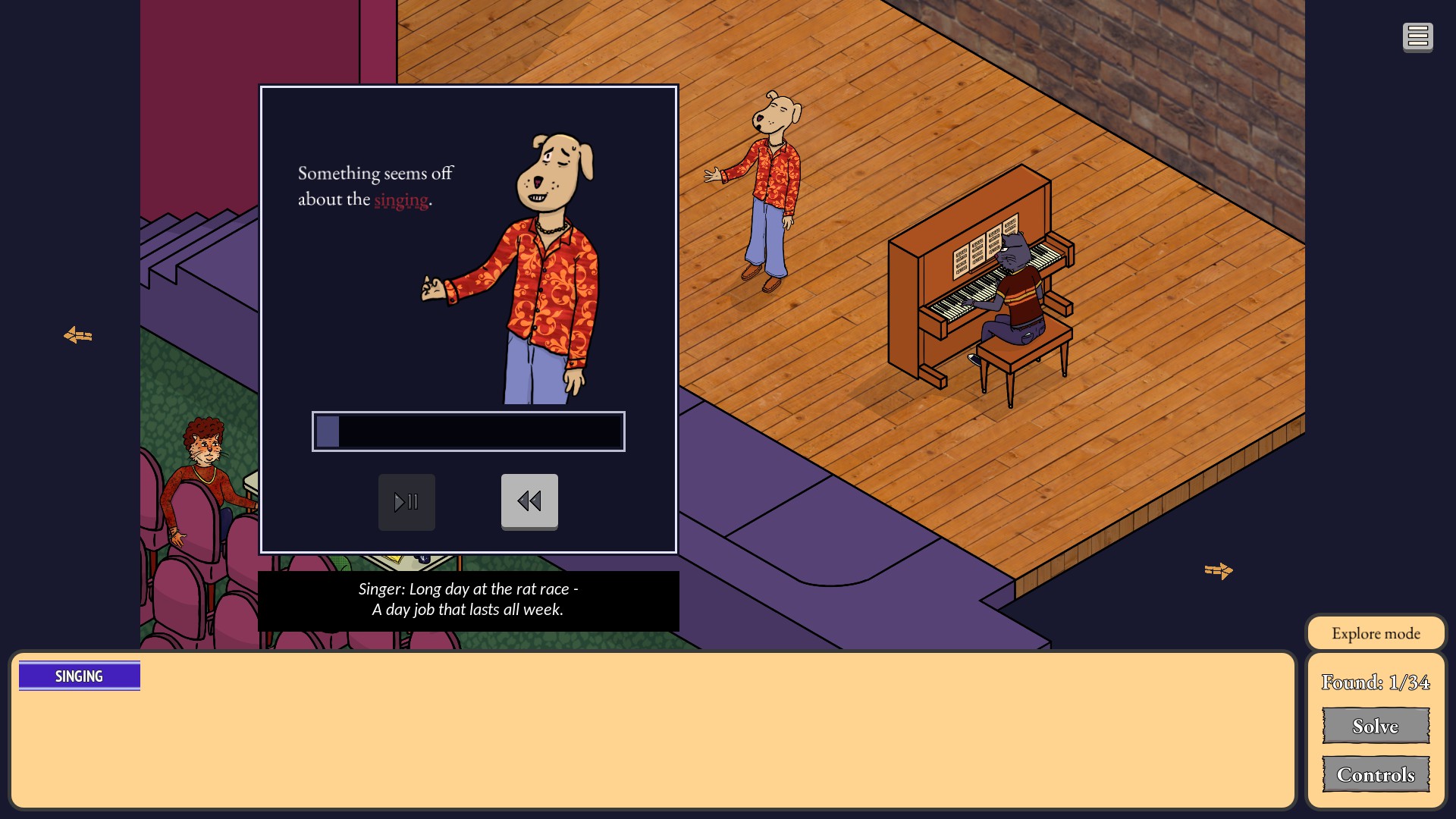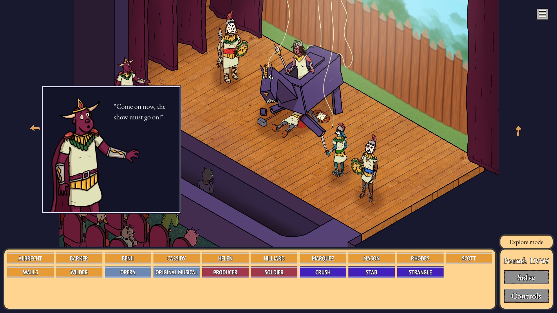 La particularité de Murder at the Birch Tree Theater, c’est que le joueur observe la scène d’un point de vue omniscient. Ici, nous ne jouons pas un personnage intradiégétique ou un enquêteur. Comme au théâtre, nous ne sommes que spectateurs de ce qui se déroule sous nos yeux, sans pouvoir interagir avec les acteurs. On récupère des indices sous forme de mots, puis, à nous de résoudre l’enquête en comprenant qui est qui, et en complétant un texte à trous qui explique le déroulé des événements. Les mots récupérés au fil de l’exploration ne serviront pas tous, et certains seront tout simplement de fausses pistes.