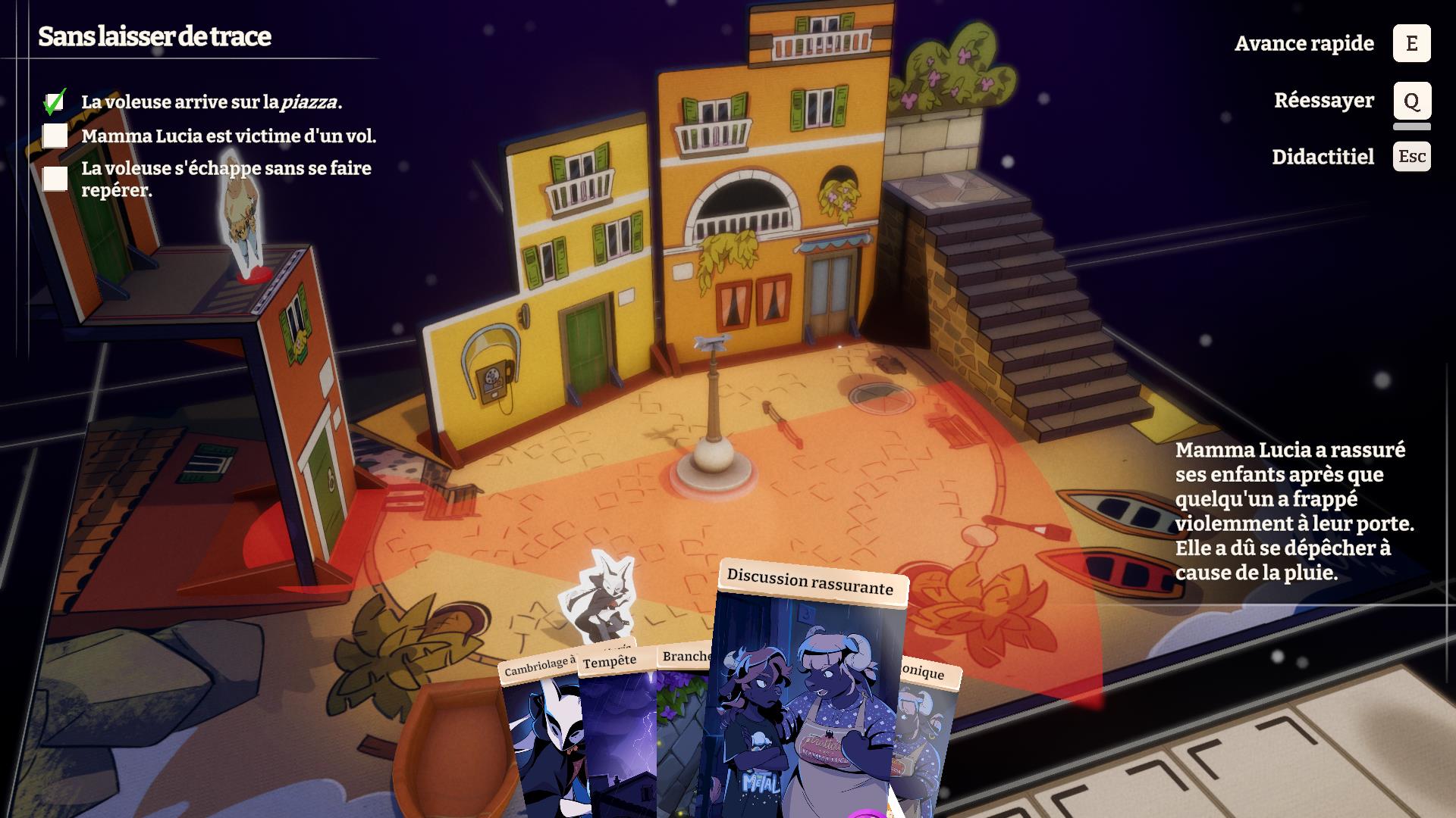 Graphiquement, la scène devient alors une sorte de jeu de plateau, et les personnages des pions, et il s’agira de reconstituer les événements en associant des cartes (représentant les indices collectés juste avant) et en les jouant dans le bon ordre. C’est dans ces phases que le « cozy game » peut aussi montrer un peu de résistance : toutes les résolutions de ne sont pas aisées, et même certaines, vers la fin de l’aventures, se sont montrée relativement complexes. On a même dû sortir notre bloc-note pour venir à bout de l’un des niveaux !