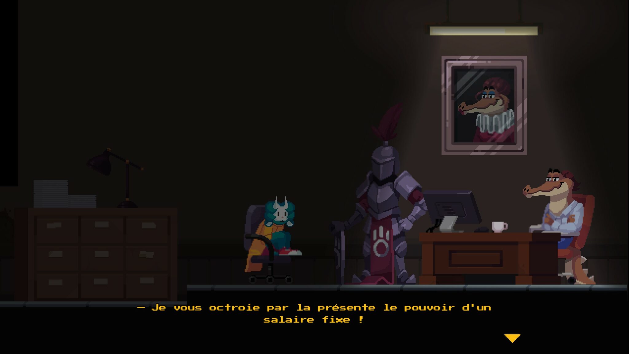 L’aventure débute là où les rêves viennent mourir : dans un open space grisâtre peuplé de cœurs déjà vaincus par l’aliénation d’un travail morose. Vous incarnez un personnage à l’imperméable trop grand, fraîchement débarqué pour un entretien d’embauche dans une entreprise aussi déprimante qu’inintéressante. Sur les écrans, les nouvelles défilent : la fin du monde approche, la Mort elle-même arrive, et le « héros légendaire » censé sauver la situation est injoignable.
