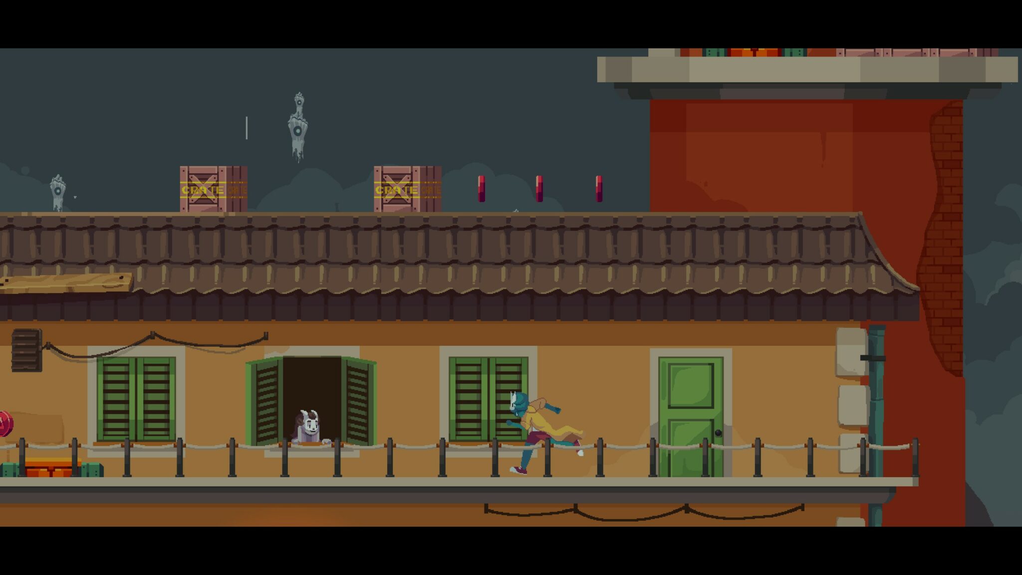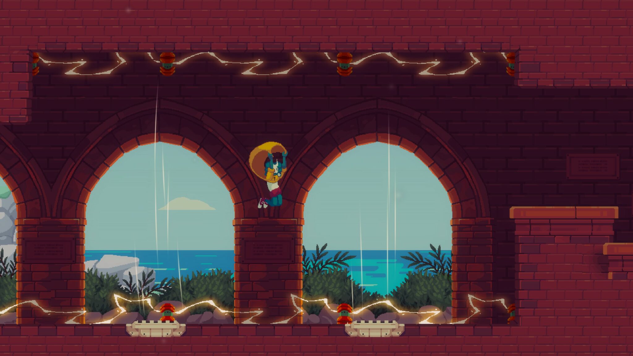 À sa base, Peppered reste un jeu de plateformes en 2D. Mais au lieu de chercher la pureté d’un gameplay à la Celeste, le titre de Mostly Games préfère rester sur un gameplay simple à base de saut, de dash et de glissade principalement. Parfois avec grâce, parfois avec maladresse, notamment à cause d’un système de mouvements qui manque un chouïa de précision dans certaines situations et d’un mapping de touches discutable. Rien de dramatique, mais assez pour nous faire froncer les sourcils dans les niveaux les plus exigeants, surtout qu’on lorgne ici clairement sur le die’n’retry.
