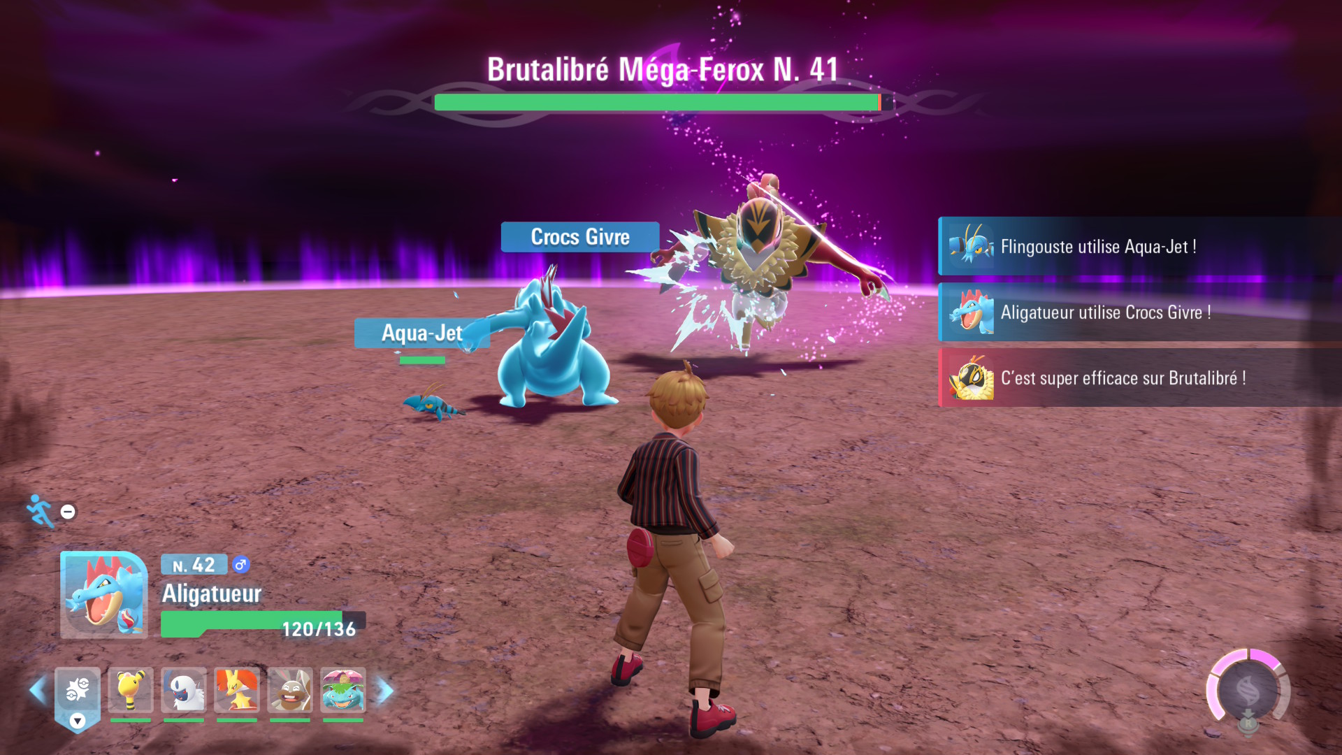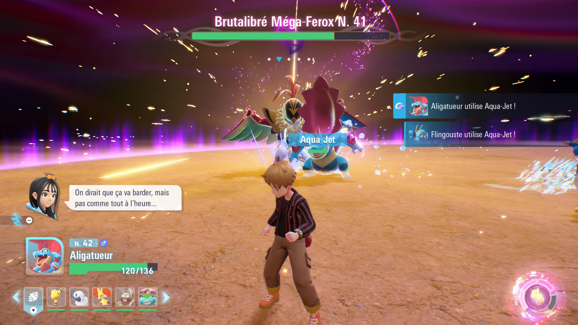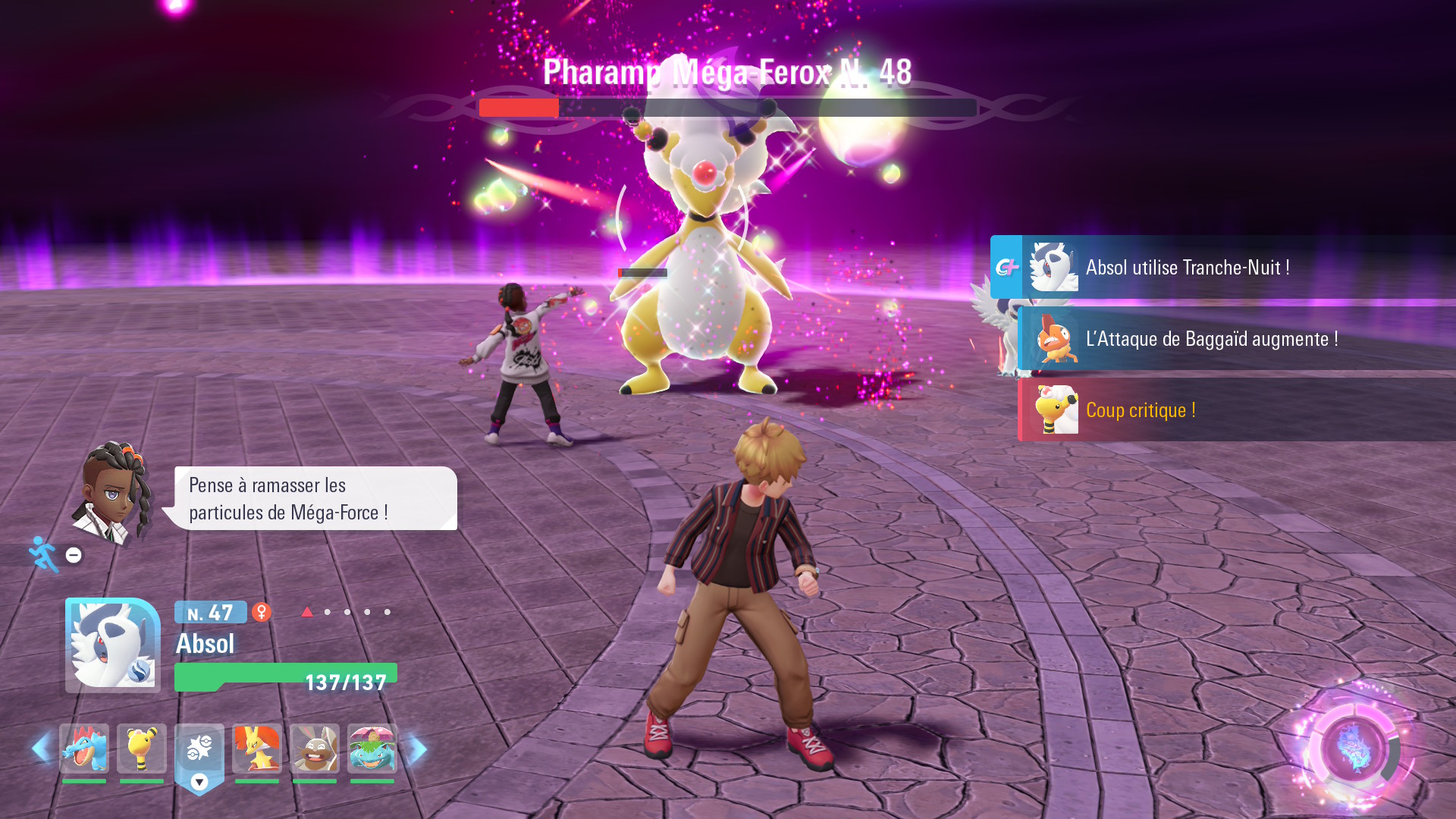 Cette nouvelle formule brille lors des combats contre les méga-Ferox, où le positionnement sera la clé, car le “boss” se concentrera surtout sur le fait d’attaquer le joueur et non pas le pokémon. En résulte des combats très sympathiques, où il faut penser à bien se positionner, esquiver, envoyer le bon pokémon, attaquer aux bons moments.