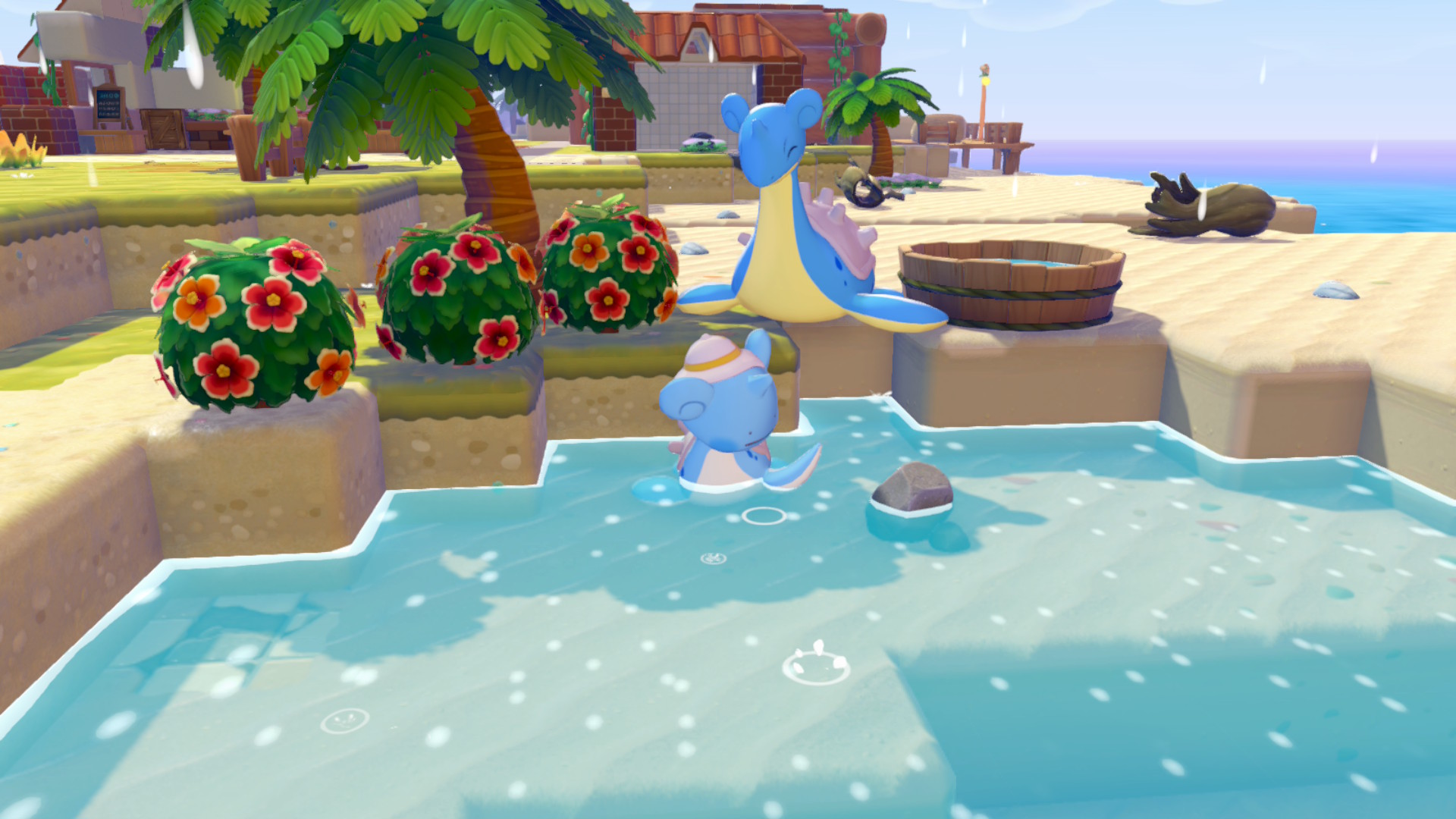 Pour mener à bien son chantier, notre Métamorph débloquera plusieurs capacités en utilisant Morphing pour se transformer en certains pokémons. Vous pourrez utiliser Feuillage, Pistolet à O, Coupe ou Éclate-Roc, mais aussi surfer en devenant un Lokhlass, planer sous les traits d’un Dracolosse ou rouler tel un Gravalanch. Cette transposition du système classique de crafting et de récolte à la sauce Pokémon fonctionne à la perfection. Le système de PP est d’ailleurs de la partie : une jauge d’énergie se vide à chaque action et nécessitera de manger des baies Mepo ou Fraive pour se recharger.