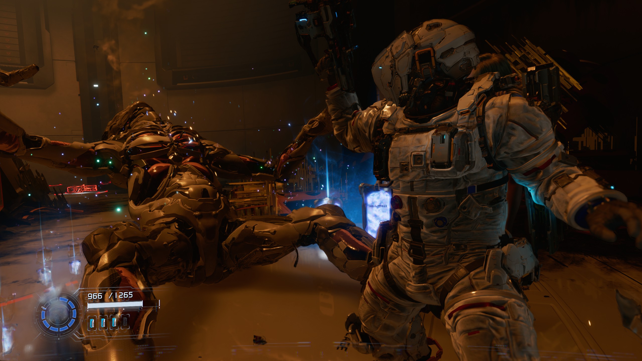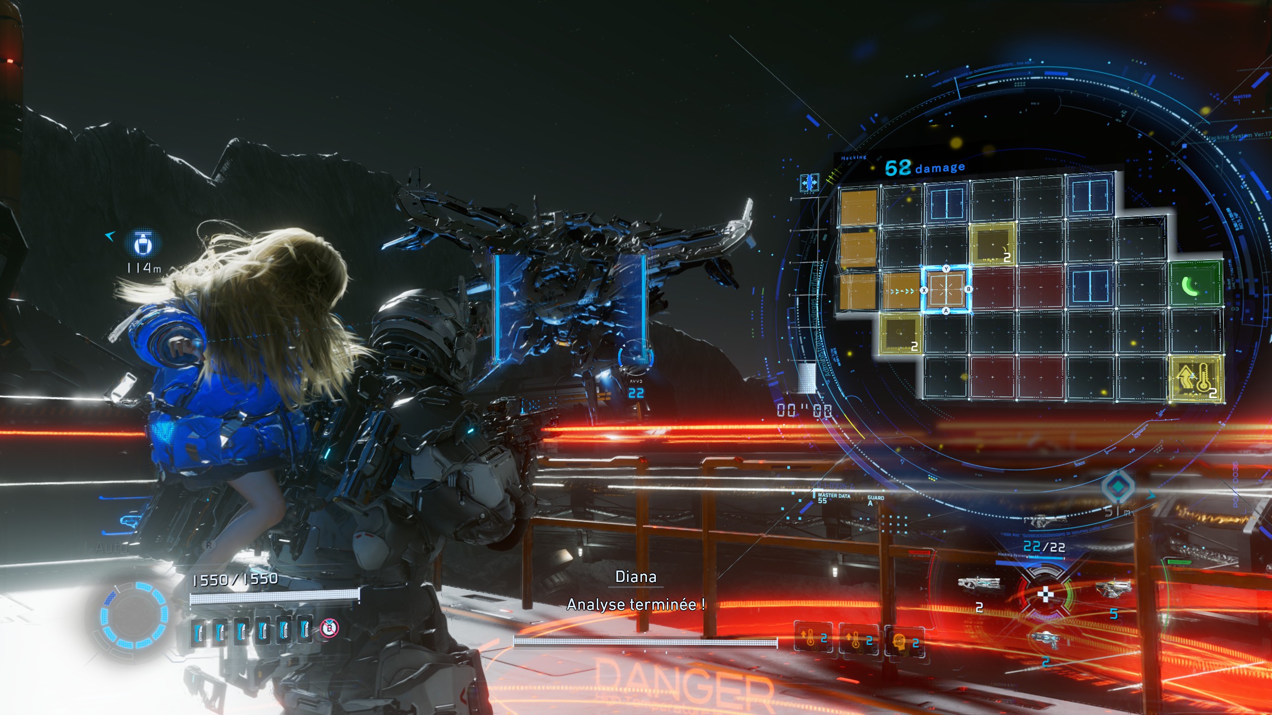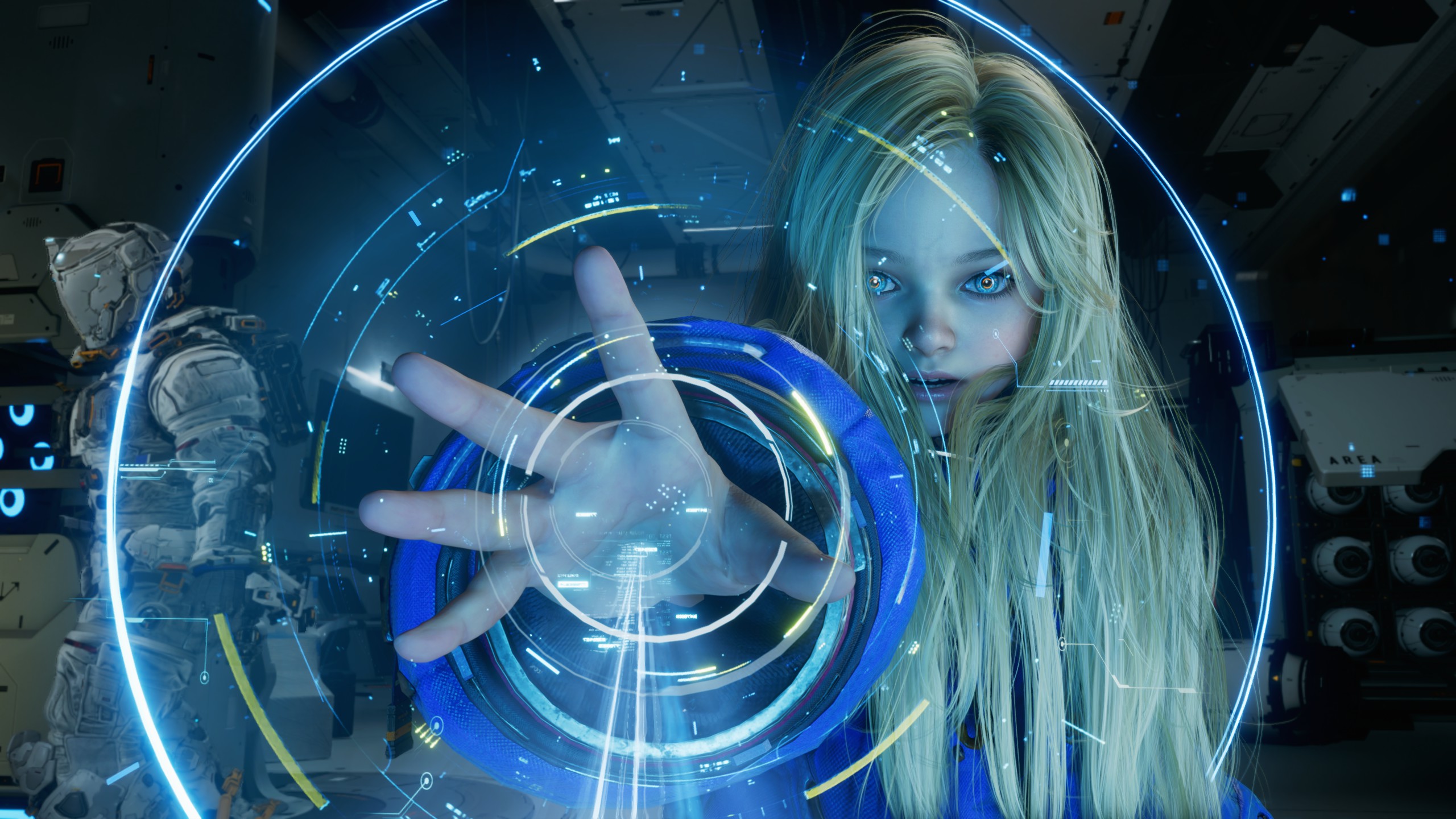 C’est là qu’il croise Diana, une androïde intelligente qu’il portera sur son dos tout au long de l’aventure, et qui l’aidera à progresser et à combattre grâce à ses capacités de piratage. Le scénario est plutôt cousu de fil blanc et fait le boulot, mais Pragmata ne cherche clairement pas à avoir d’ambition dans cette catégorie.