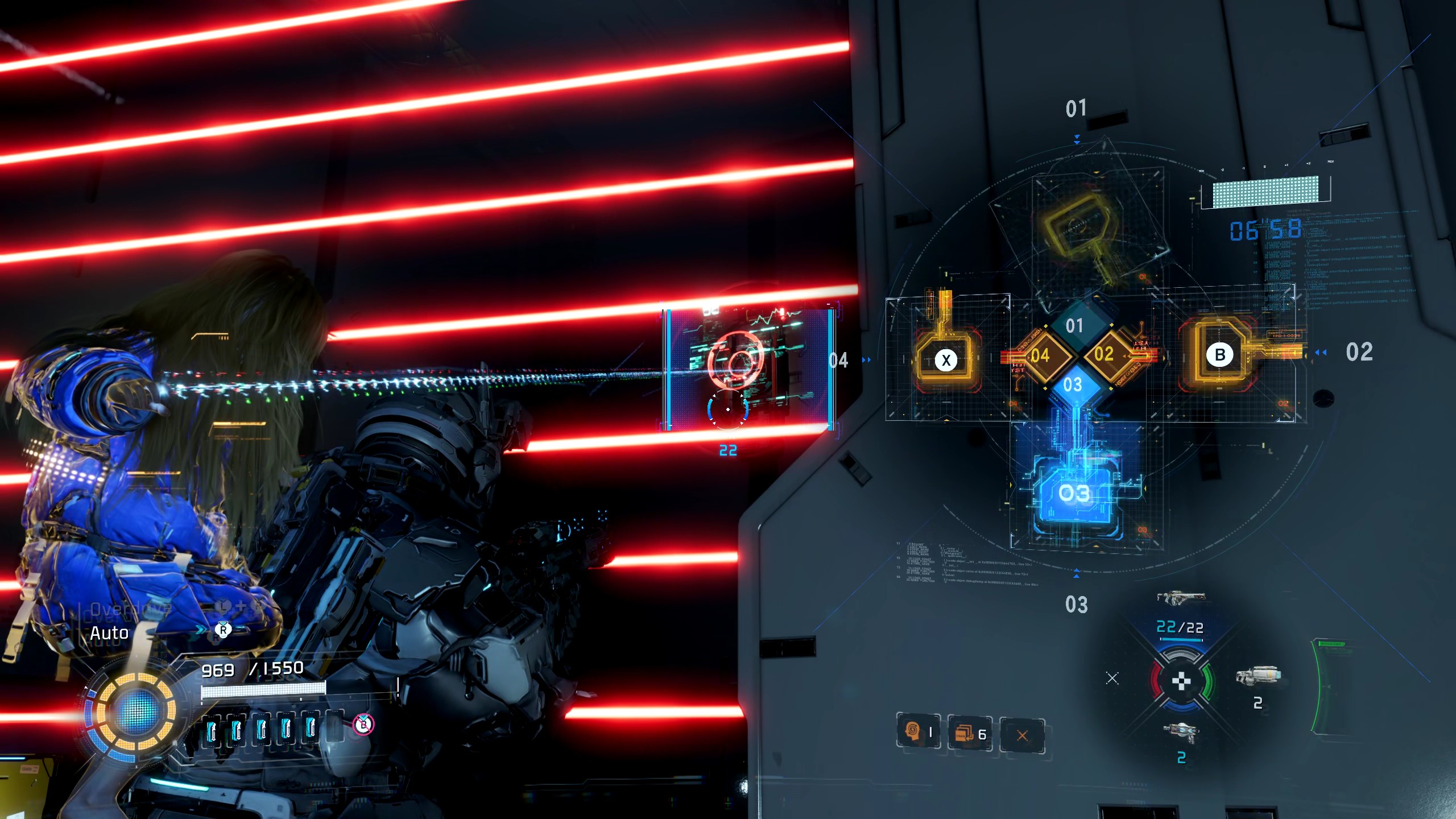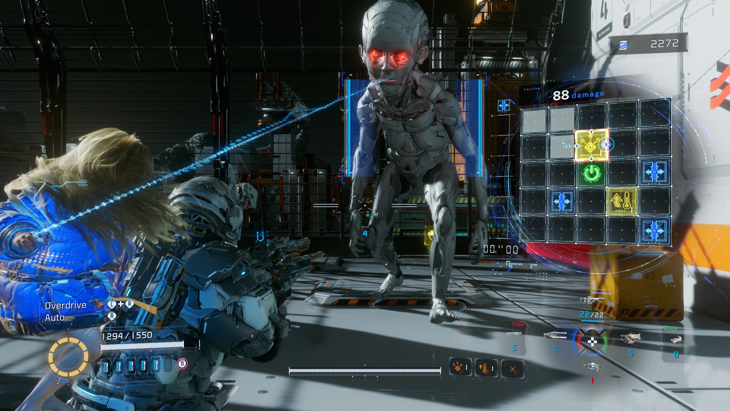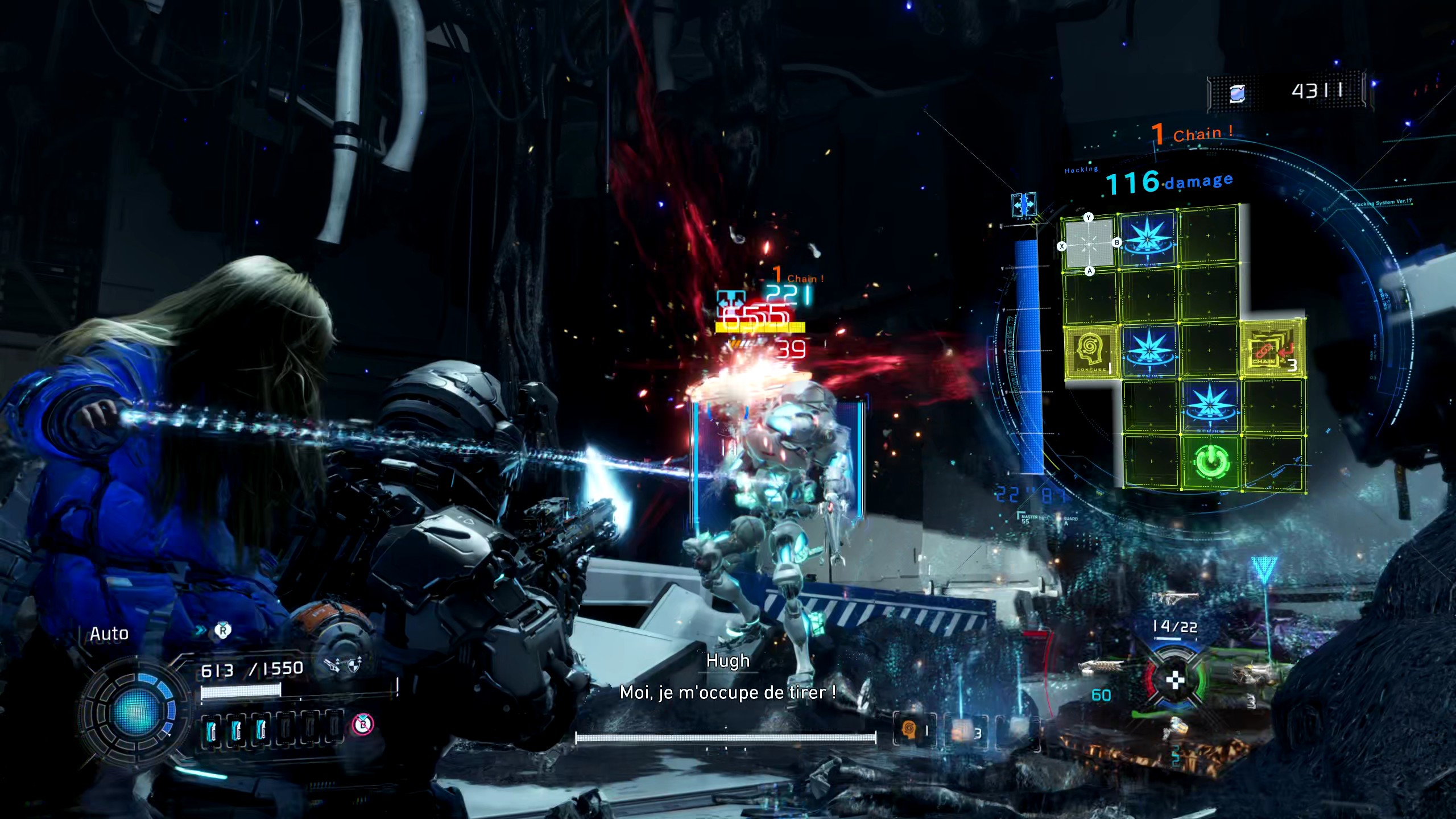 Le système de combat est l’idée centrale du jeu, et c’est là que Pragmata se montre le plus inventif : Hugh gère les armes et les déplacements pendant que Diana hacke les ennemis via un mini-jeu de puzzle, le tout géré sur la même manette avec une ergonomie étonnamment bien pensée. La mécanique aurait pu devenir épuisante sur la durée ; elle ne l’est jamais, parce que le jeu ne cesse de l’enrichir sans la dénaturer.