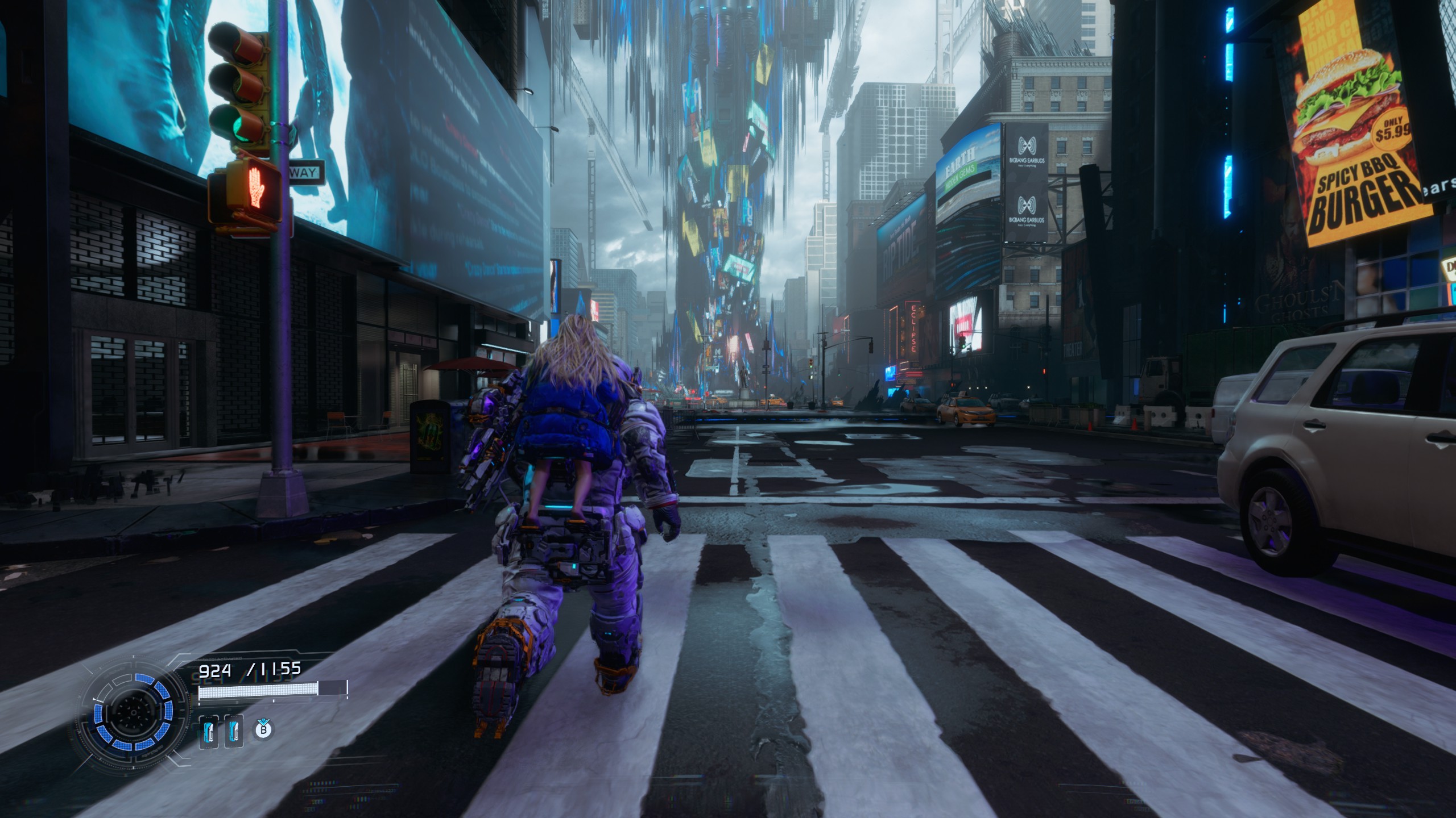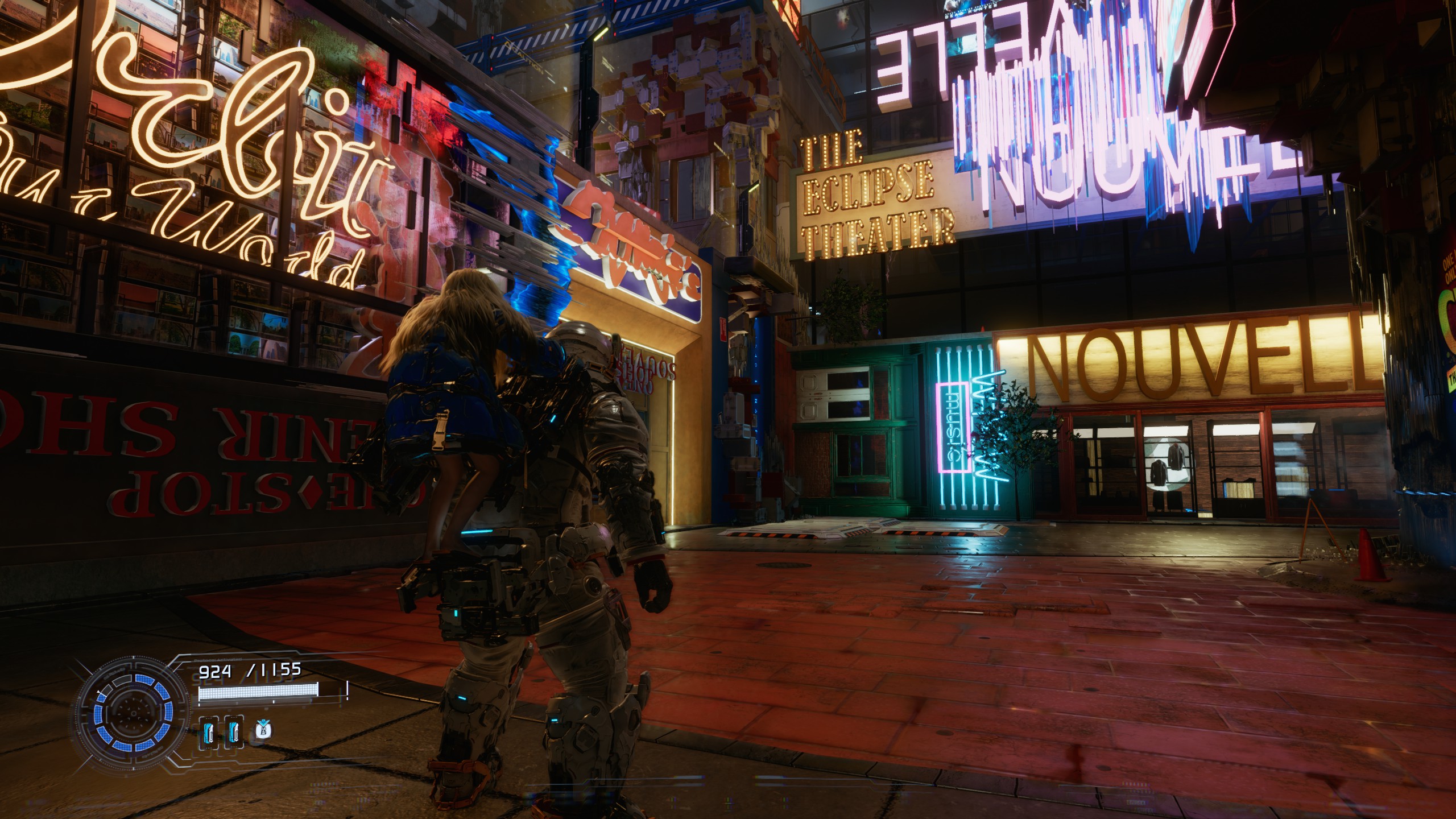 La courbe de difficulté accompagne bien cette montée en puissance : le jeu pousse à maîtriser ses systèmes plutôt qu’à les subir, et même visuellement, l’expérience arrive à se renouveler. Le concept du minerai lunaire est bien exploité dans la direction artistique : la base lunaire est peuplée de reconstructions partielles et distordues de la civilisation humaine, comme un New York reconstitué mais déformé, avec ses taxis qui s’enfoncent dans le sol et ses buildings qui poussent de travers. C’est cohérent, relativement original, et ça donne au jeu une identité visuelle sympathique.