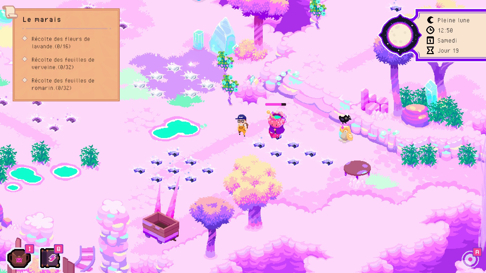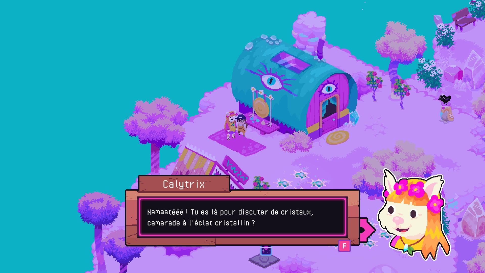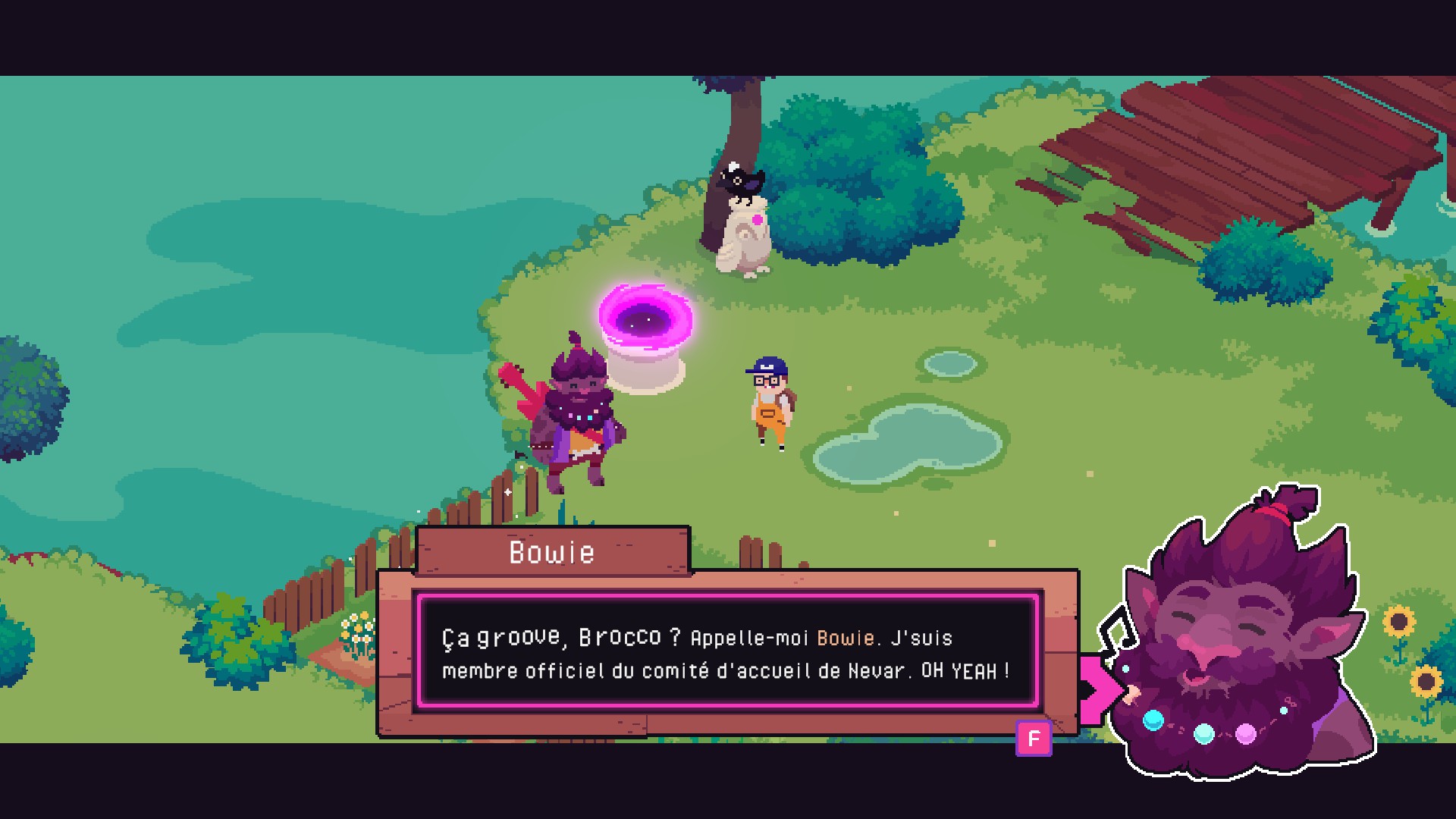 L’une des premières choses qui frappe après quelques minutes de jeu, c’est la richesse de l’univers, sublimé par des graphismes pixels colorés et mignons. Nous aurons plusieurs zones à explorer au fil de l’histoire, chacune avec une ambiance différente. Les personnages qui nous accompagnent tout au long de l’aventure sont aussi assez originaux, en plus de dégager une bienveillance qui rend l’expérience très agréable. On partage nos journées avec notre familier (le corbeau Raven), une écureuil fan de Donjons et Dragons, un paresseux bibliothécaire ou une lapine « peace and love ».