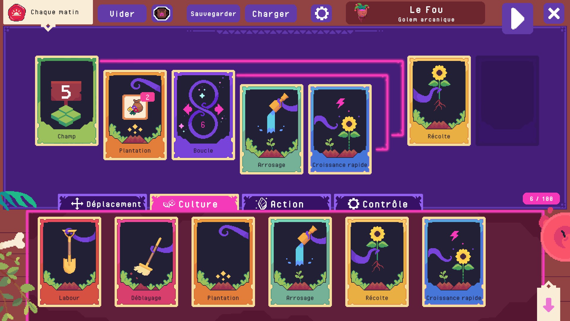 Mais l’aspect le plus marquant de Ritual of Raven, c’est justement son système de culture et de récolte. Pour conserver leurs propriétés magiques, les plantes ne doivent pas être touchées directement. Pas question non plus de labourer, d’arroser, de planter ou de miner nous-mêmes. À la place, ce sont des golems, tous inspirés des arcanes majeures du tarot, qui se chargeront de faire le travail ! Pour cela, il faudra résoudre des puzzles un peu partout sur la map pour les recruter, puis leurs donner des instructions à l’aide de « cartes d’ordres ».
