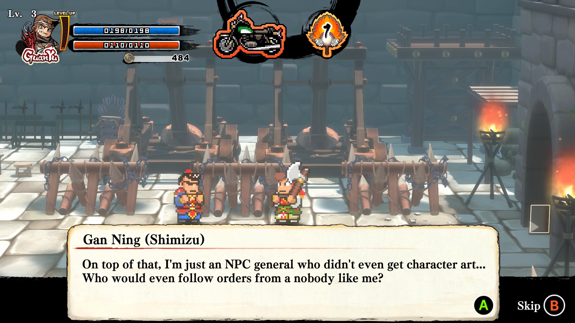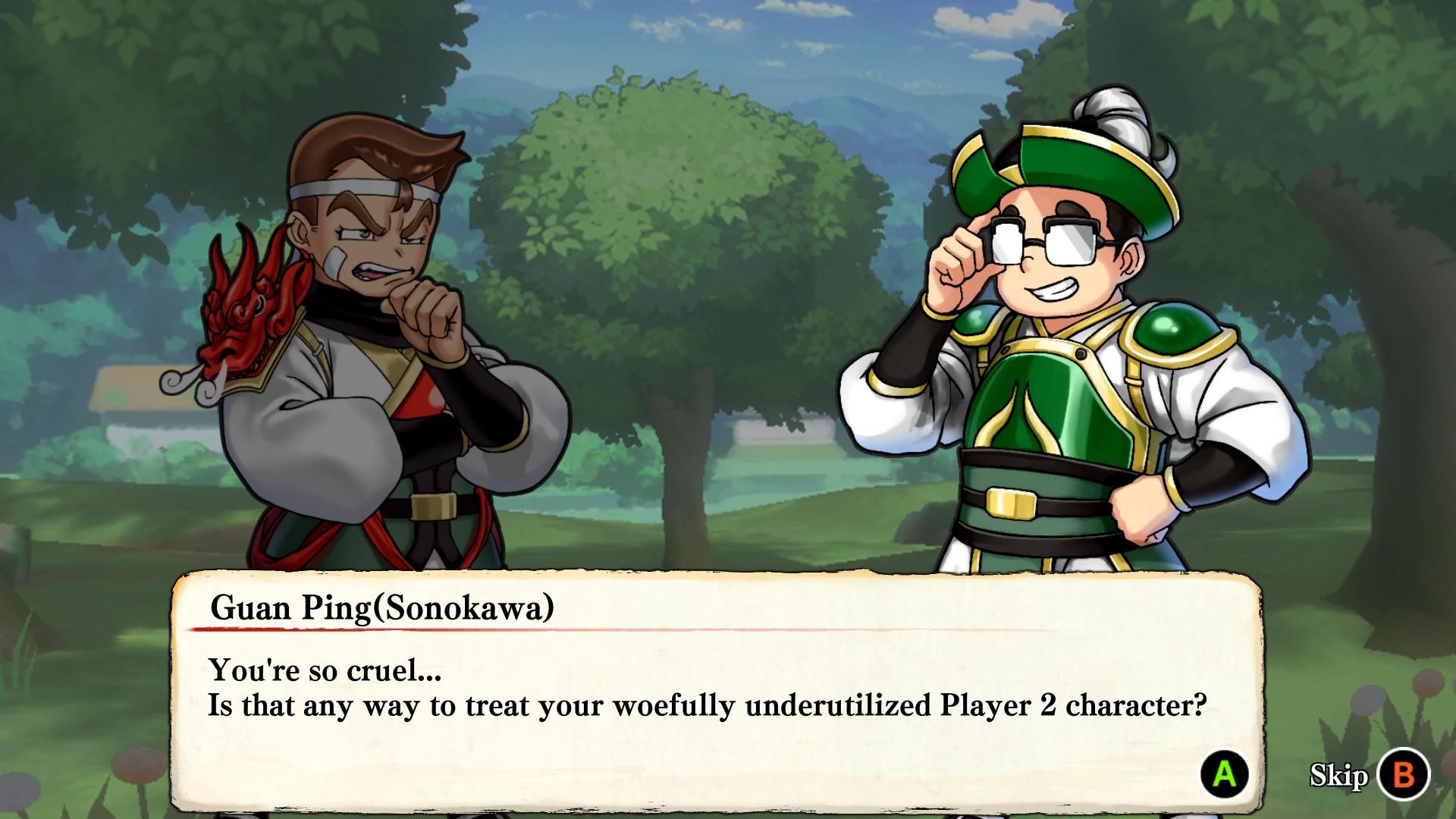 Mais surtout, tout au long du jeu, on nous raconte avec une bonne dose de comédie et de parodie l’histoire des Trois Royaumes, les rôles des personnages principaux (généraux…) étant assumés par les personnages habituels de la saga River City. Mais cette narration entraîne hélas des dialogues beaucoup trop nombreux, et qui semblent interminables. D’autant plus quand, comme dans notre cas, on n’est pas si familier de la légende des Trois Royaumes et de ses personnages, et que les références et autres aspects parodiques nous passent un peu au-dessus de la tête. Et le tout, il faut le préciser, uniquement en anglais, ce qui peut encore couper le jeu d’une partie du public.