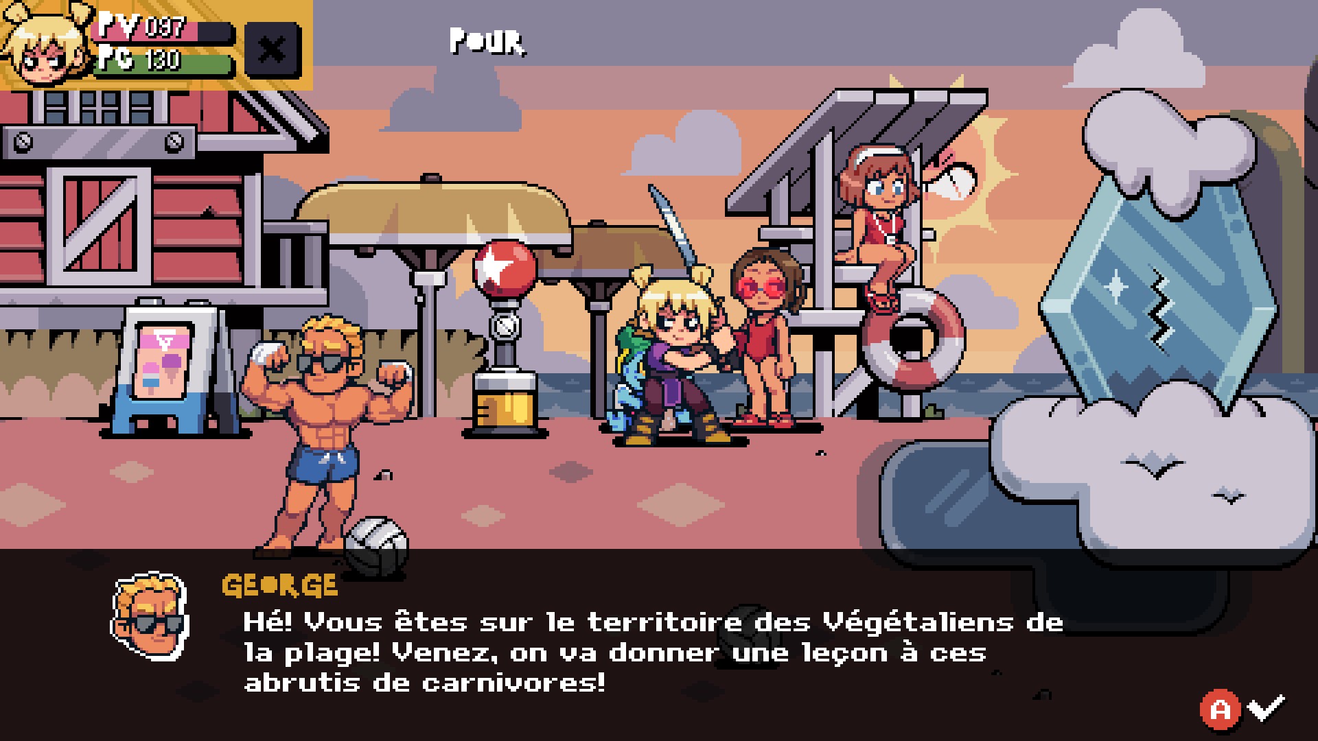 Malgré ce scénario convenu, arpenter cette Toronto complètement foutraque reste terriblement fun, et un véritable feu d’artifice pop. Le pixel art du jeu est toujours aussi impeccable, le déréglage interdimensionnel est une excellente excuse pour varier les environnements (de la rue commerçante à la plage en passant par un manoir à la Dracula ou… l’Ère Glacière !) et les personnages, que ce soit les mobs, les figurants en arrière-plan, ou ceux qui tiennent déjà un rôle dans la BD, tous sont soignés, colorés, et sexy.