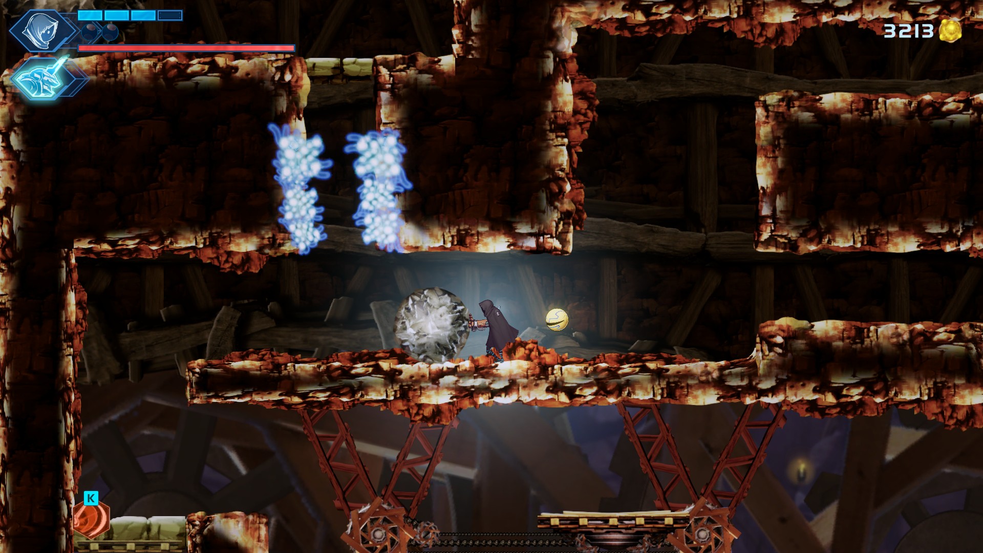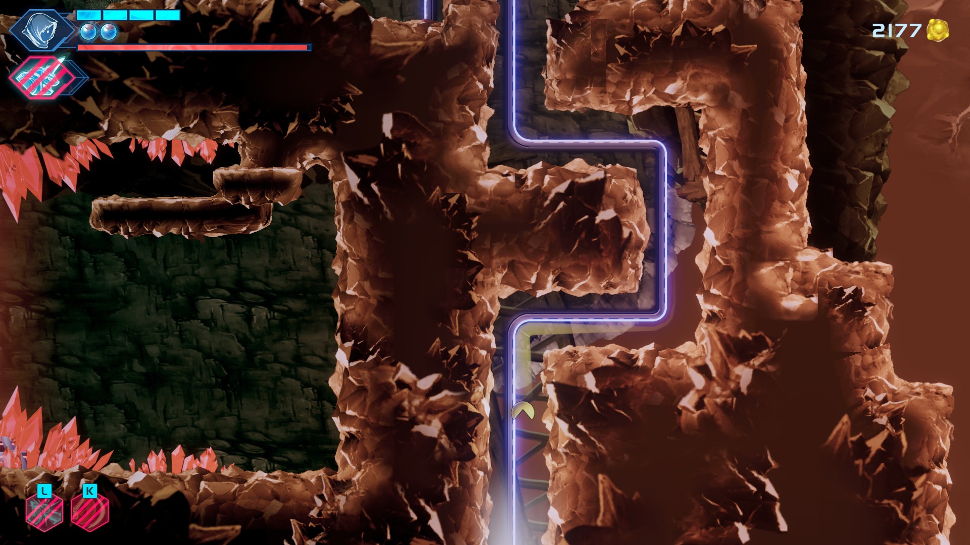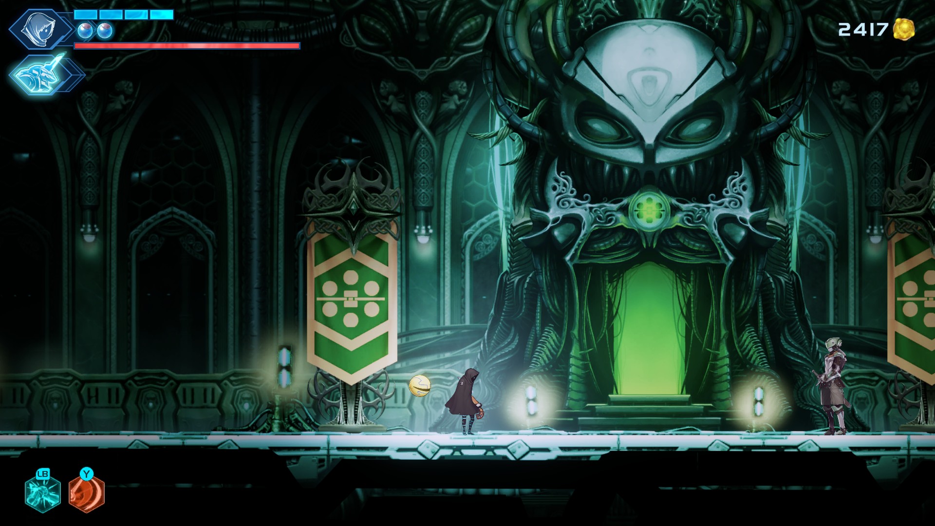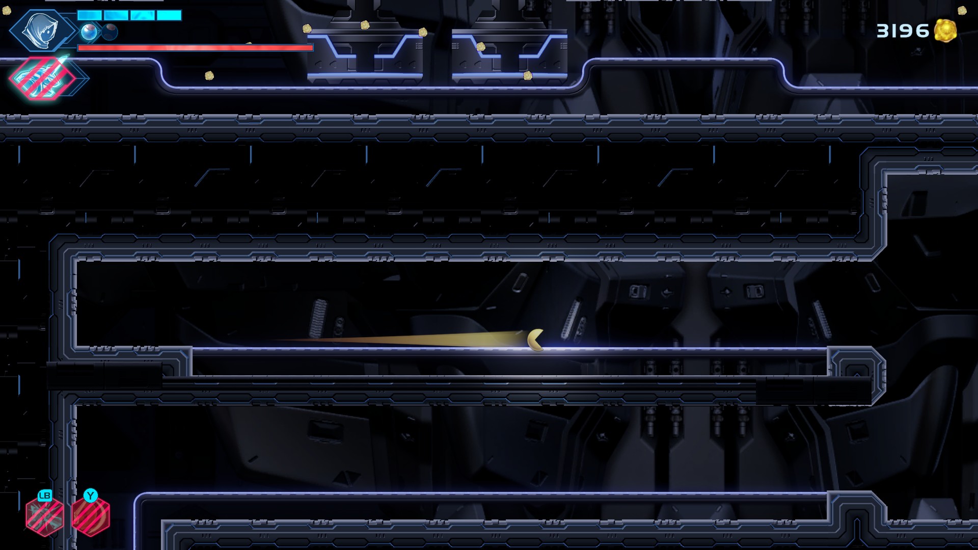 Comme le Labyrinth du titre l’indique, le jeu est donc un Metroidvania, avec son lot de zones d’abord inaccessibles, qui s’ouvriront au gré des pouvoirs que le personnage acquerra tout au long de l’aventure : dash, grappin… Sur cet aspect, le jeu est tout à fait classique, mais de construction solide. Les décors et les défis sont variés, le labyrinthe est complexe mais lisible, le bestiaire suffisamment éclectique, tant au niveau graphique que des mécaniques…