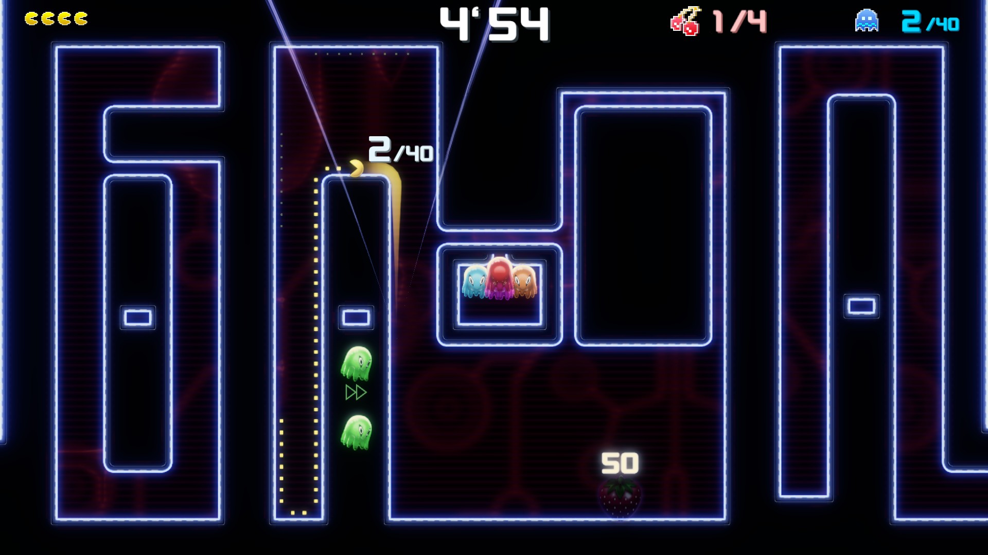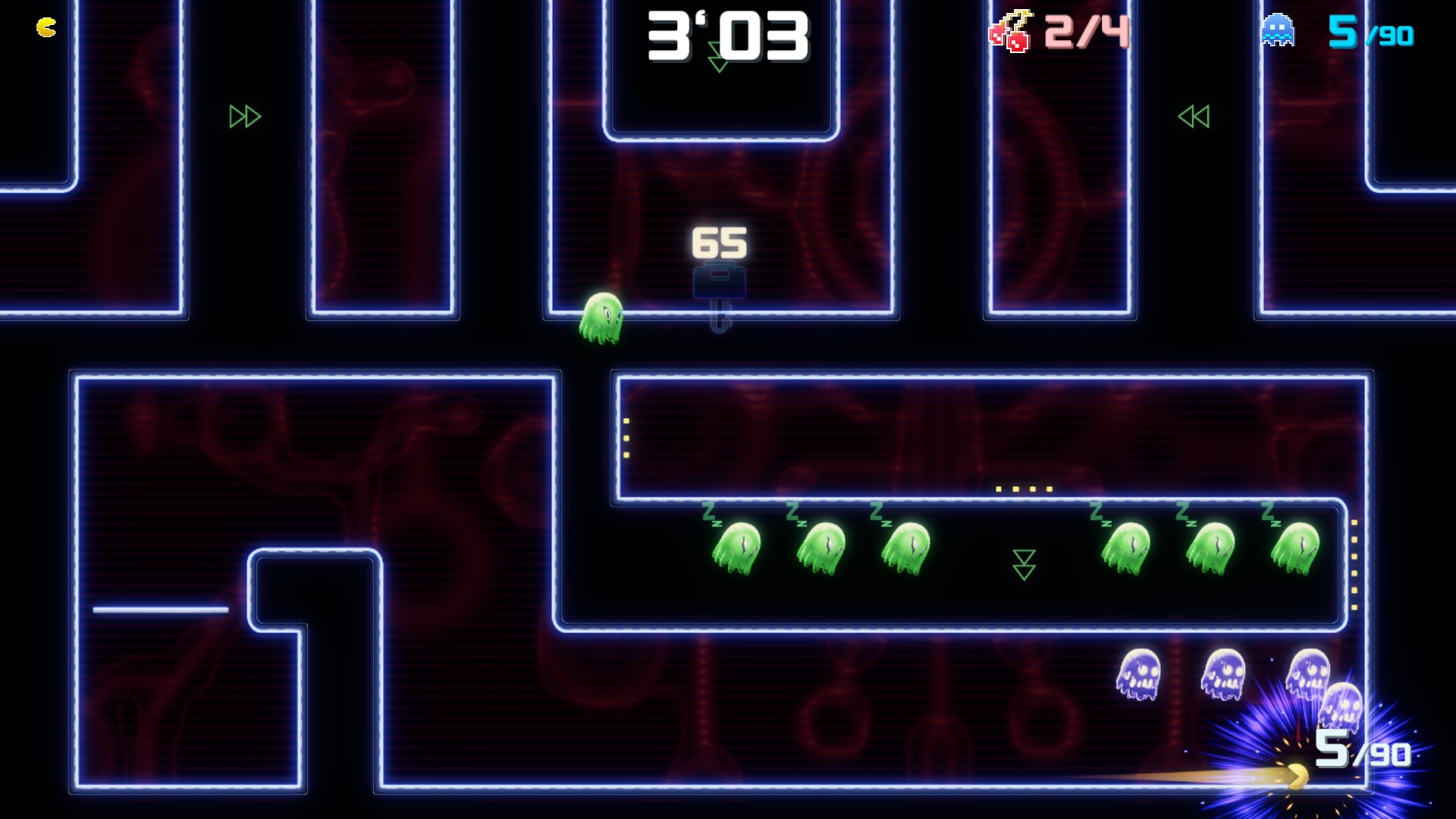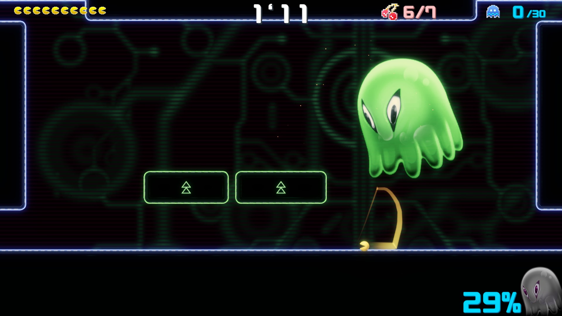 C’est en tout cas ce qu’on avait pu commencer à croire pendant les premières heures de jeu. Mais en avançant dans l’aventure, on finit par accéder à des niveaux qui transforment complètement l’expérience en Pac-Man 2025. Des phases qui feront penser au très bon Pac-Man Championship Edition DX (qui faisait déjà beaucoup évoluer la formule tout en restant fidèle aux mécaniques essentielles), le faisant encore muer avec des éléments de combat de boss et de courses contre la montre.