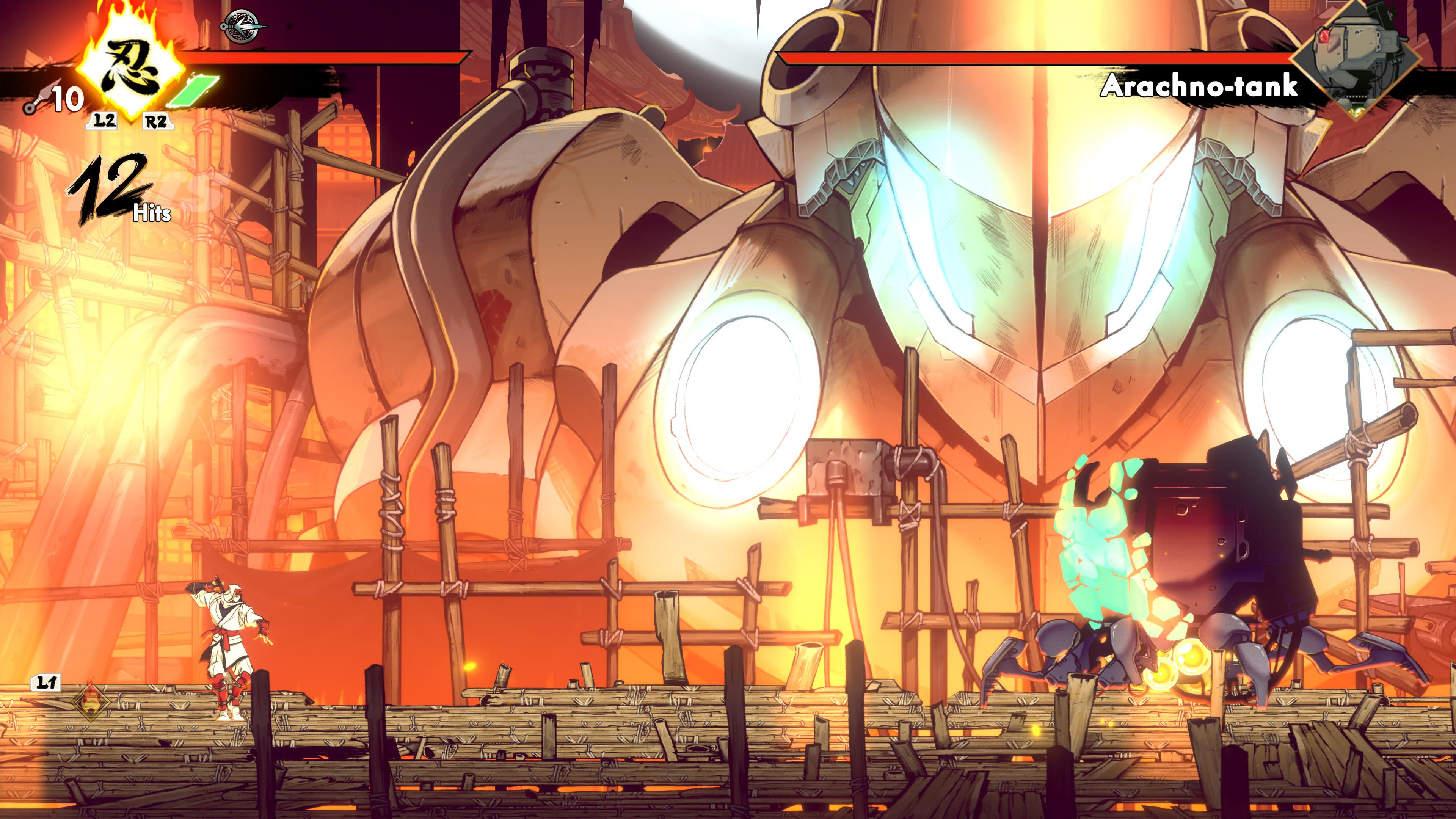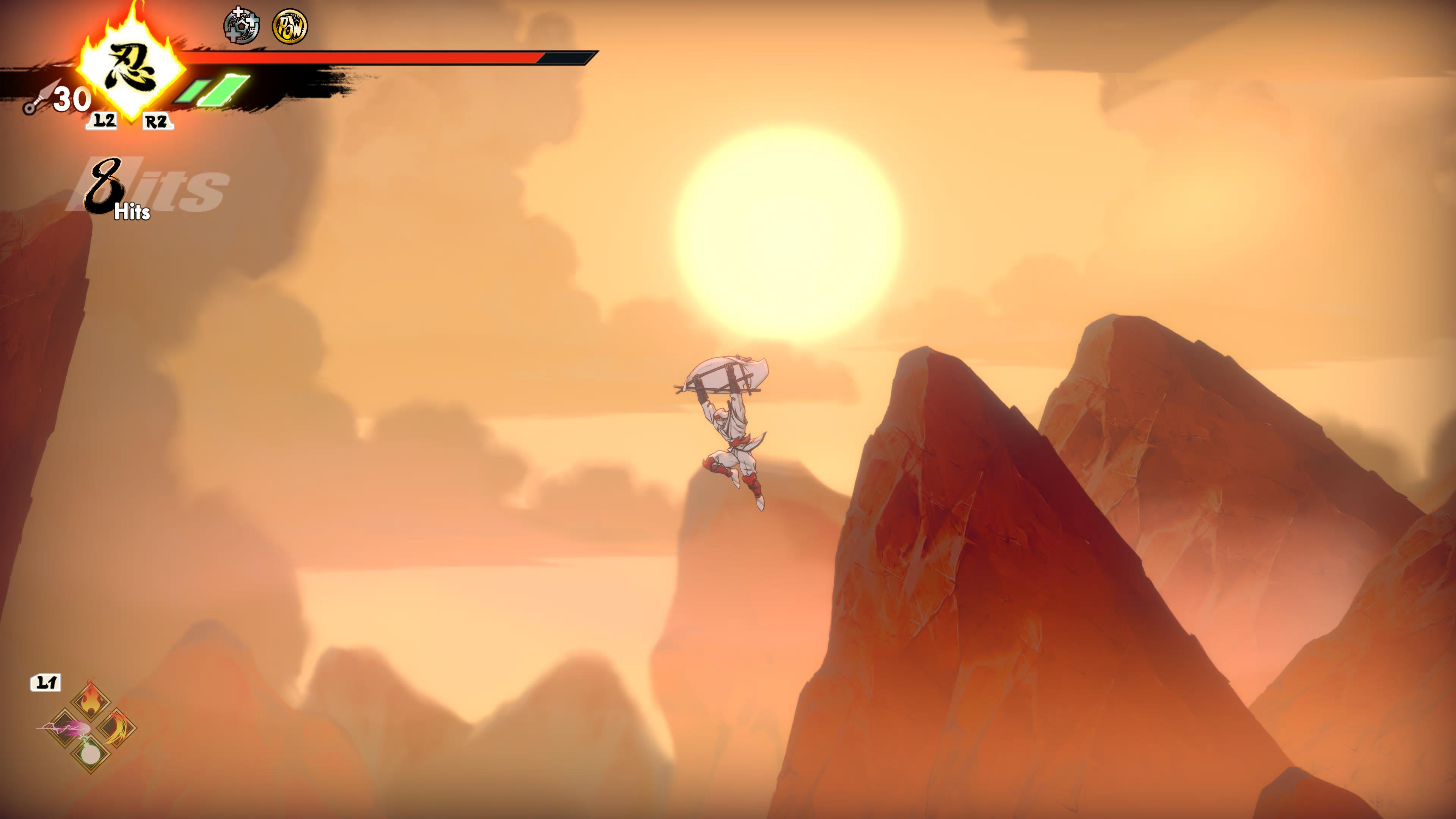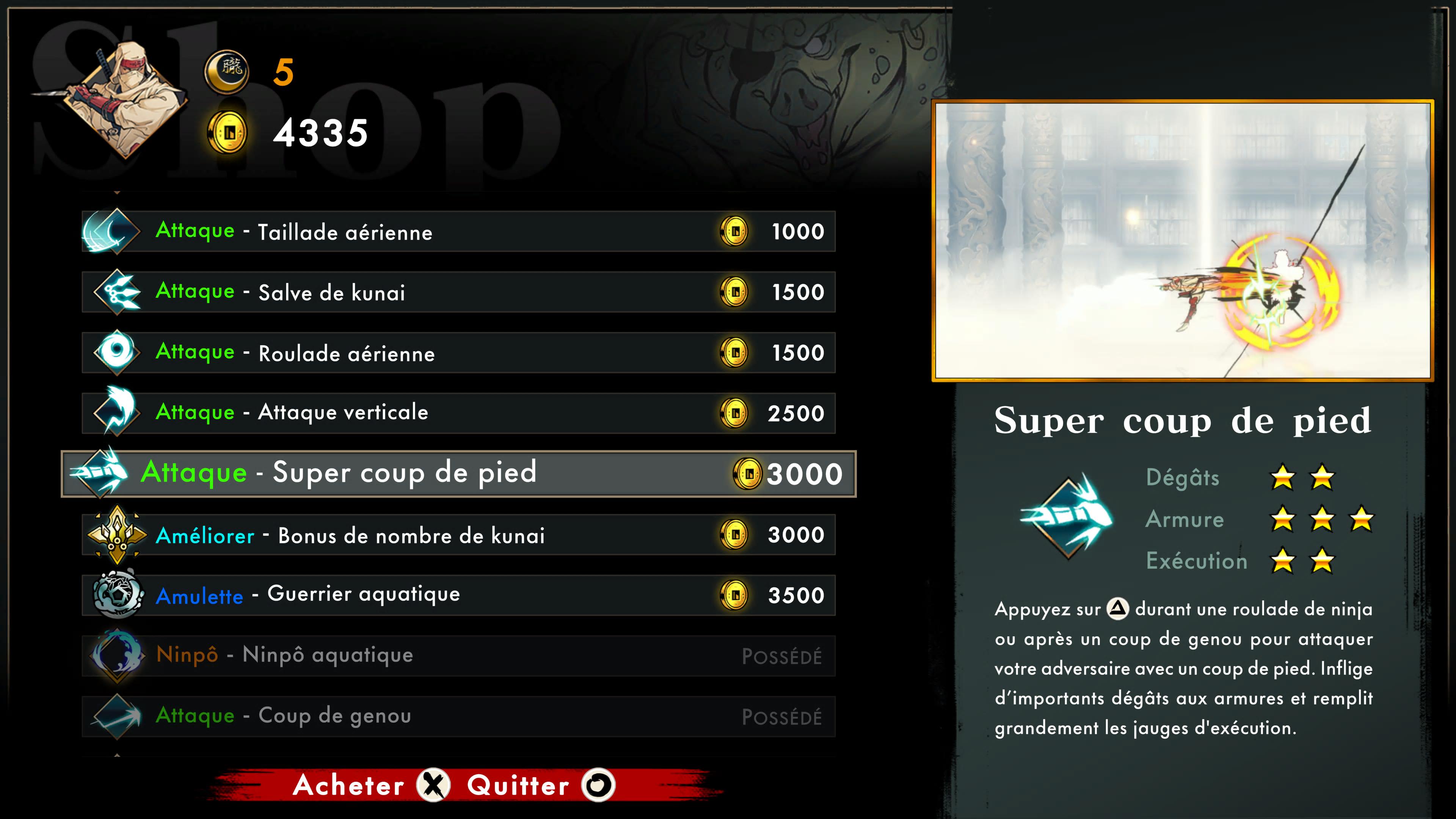 Il y a le côté technique, bien sûr, qui nous donne envie d’y retourner constamment, avec toutes ces splendides animations et ses effets visuels à chaque coup de katana ou de kunai, mais c’est surtout la fluidité des enchaînements, à la fois simples et techniques à sortir, l’impact ressenti à chaque coup porté et le design sonore de l’ensemble qui rendent l’ensemble incroyablement harmonieux. Les attaques se font simples dans les premiers niveaux, mais rapidement, grâce à un marchand local, on débloque de nombreuses techniques supplémentaires venant étoffer notre arsenal.