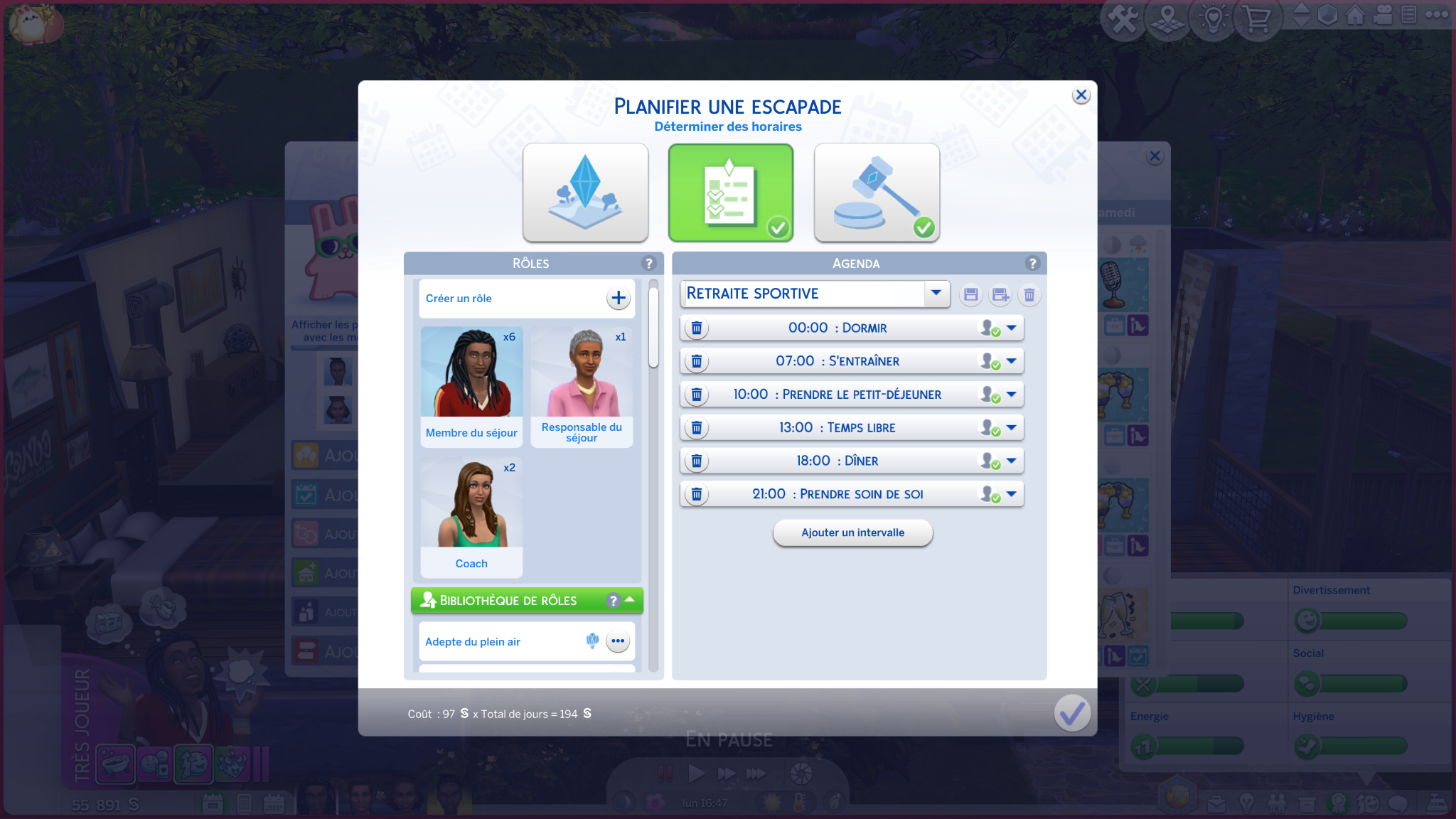 Le cœur du pack est sans conteste la nouvelle fonctionnalité des Escapades. Ce système permet d’organiser à peu près n’importe quel événement : colonies de vacances, compétitions de cuisine, retraites sportives, soirées entre amis, ou même repas familiaux hebdomadaires. On choisit l’horaire, les activités, les comportements, les lieux, les contraintes… bref, une liberté totale.
