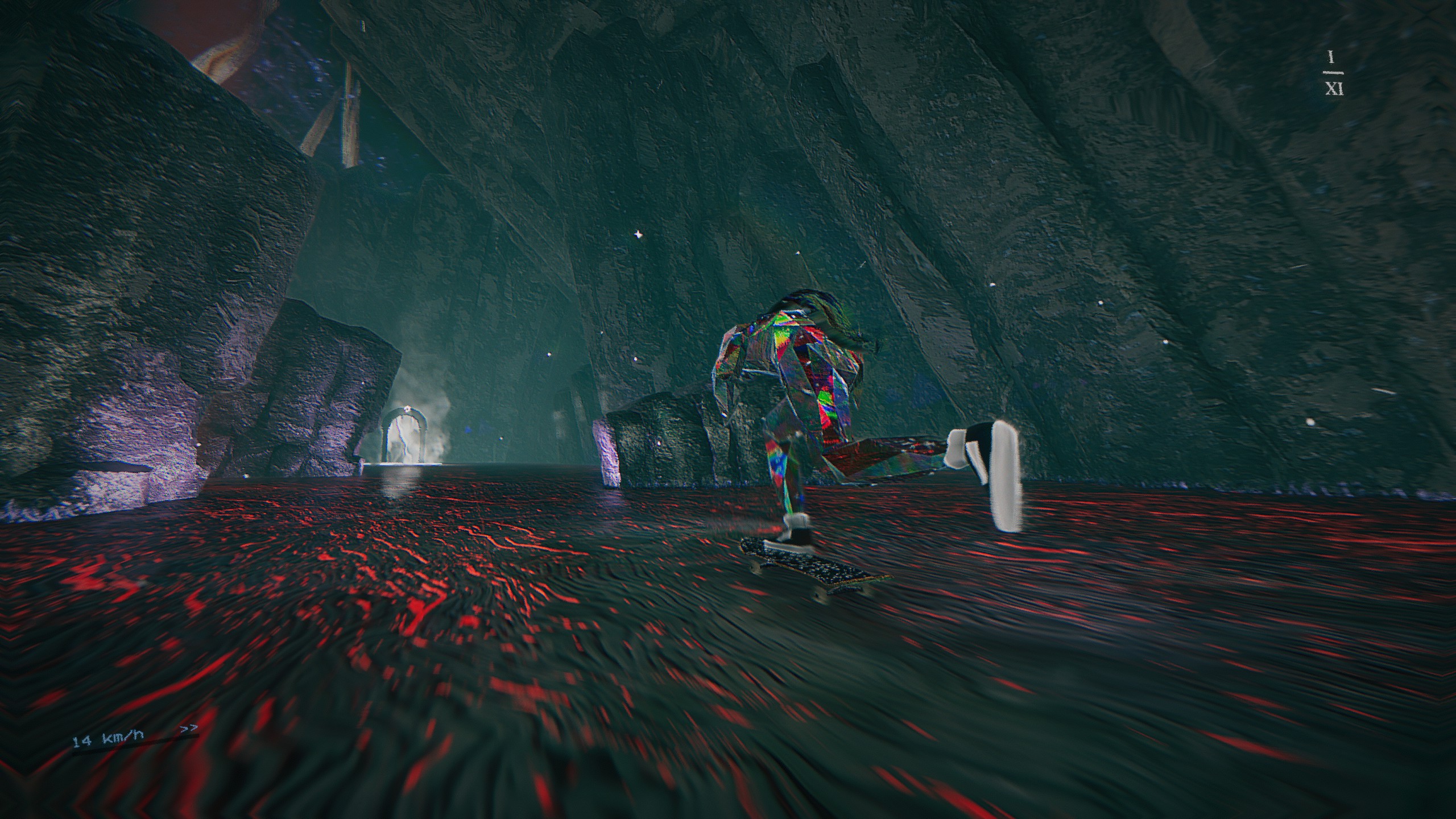 Réduire Skate Story à sa seule esthétique serait une erreur, tant le jeu s’impose comme une expérience sensorielle totale, portée par une bande-son fondamentale, où le travail magistral de Blood Cultures façonne autant ce que l’on entend que ce que l’on ressent. Le groupe est d’ailleurs crédité au-delà de la seule composition musicale, jusque dans les VFX, et cela se ressent immédiatement (les musiques des hubs étant composées par John Fio).