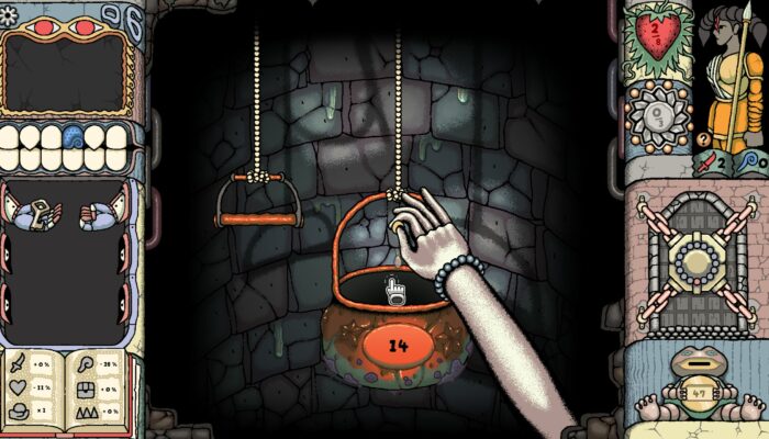 De même, le système de méta progression repose exclusivement sur l’or récupéré pendant les runs… encore faut-il réussir à en ramener vivant. Régulièrement, le jeu nous propose de déposer des pièces dans une marmite magique qui remontera à la surface si tout se passe bien. Enfin, « si tout se passe bien », ça signifie souvent renoncer à un achat vital chez le marchand, et donc se mettre délibérément en danger pour gratter un peu de progression.